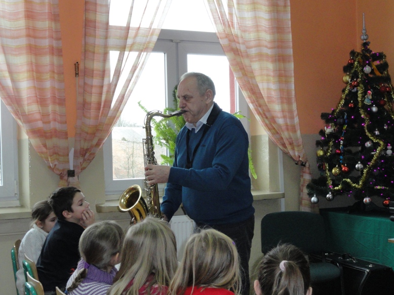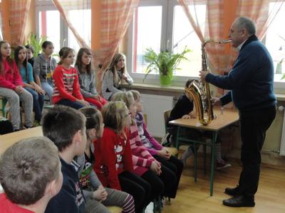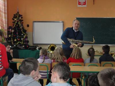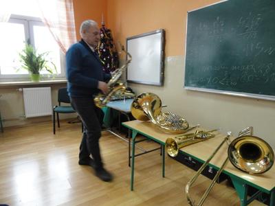 Spotkanie odbyło się w dniu 14 stycznia 2014 roku w związku z naborem nowych członków do orkiestry. Pan Stanisław Szymaniak - kapelmistrz orkiestry zaprezentował uczniom instrumenty dęte zakupione przy udziale środków pochodzących z budżetu UE.