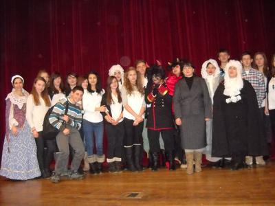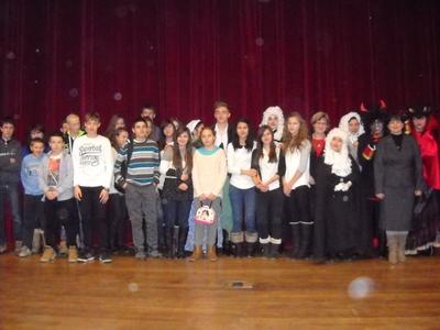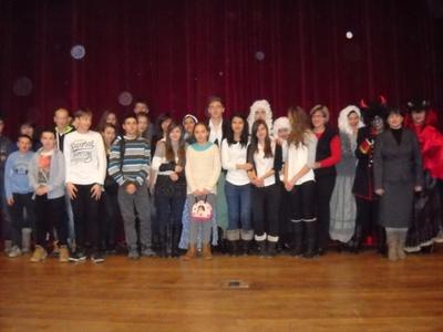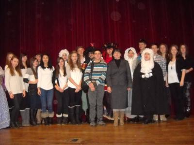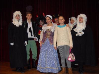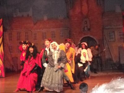 Nasi uczniowie z zainteresowaniem oglądali operetkę, na koniec nagrodzili wykonawców gromkimi brawami i zrobili sobie z nimi pamiątkowe zdjęcia na scenie.