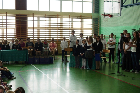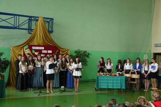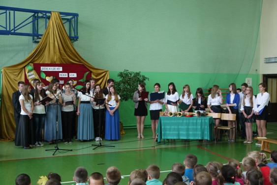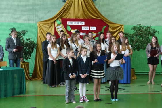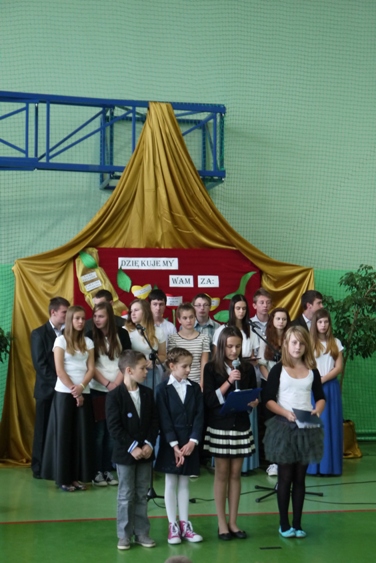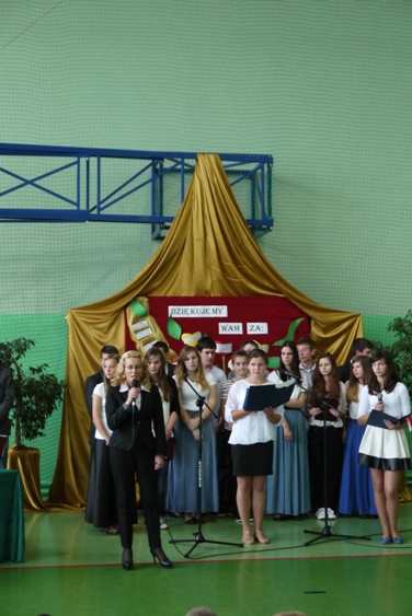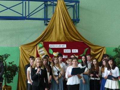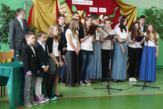 W naszej szkole uroczystość obchodziliśmy 15 października. Był uroczysty apel podczas którego dzieci z klasy drugiej zaprezentowały piękny układ taneczny a młodzież gimnazjalna kabareton, który rozbawił nawet najbardziej poważne osobliwości. Były piosenki i wzruszające życzenia.
