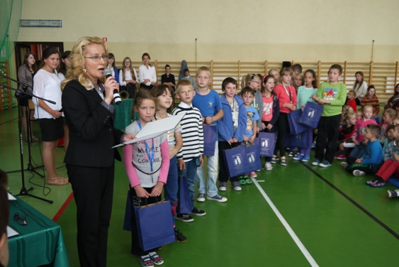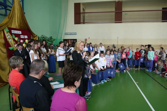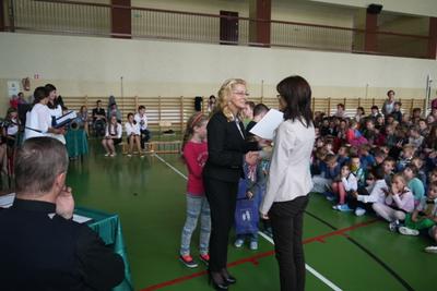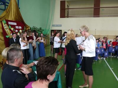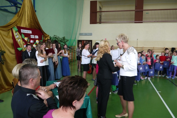 Nasz miły gość złożył nauczycielom najpiękniejsze życzenia zdrowia, radości zadowolenia i samych sukcesów w pracy zawodowej oraz życiu osobistym. Pani sekretarz w dowód swej sympatii w imieniu własnym jak również w imieniu Pana Wójta Tomasza Mularczyka wręczyła wszystkim nauczycielom podziękowania i skromne prezenty.