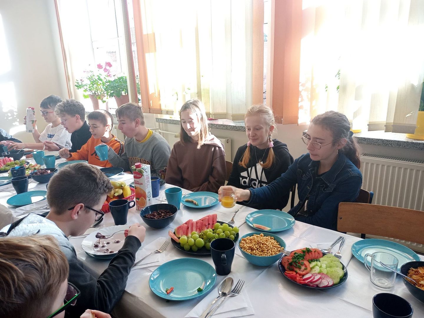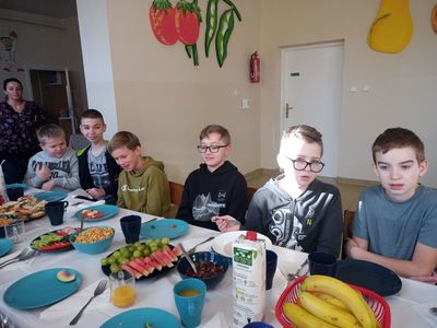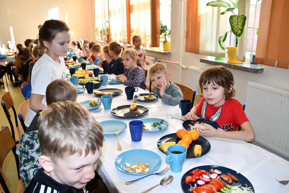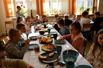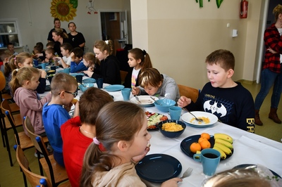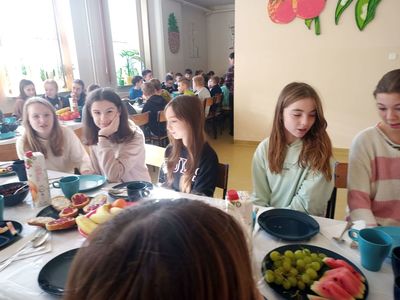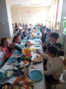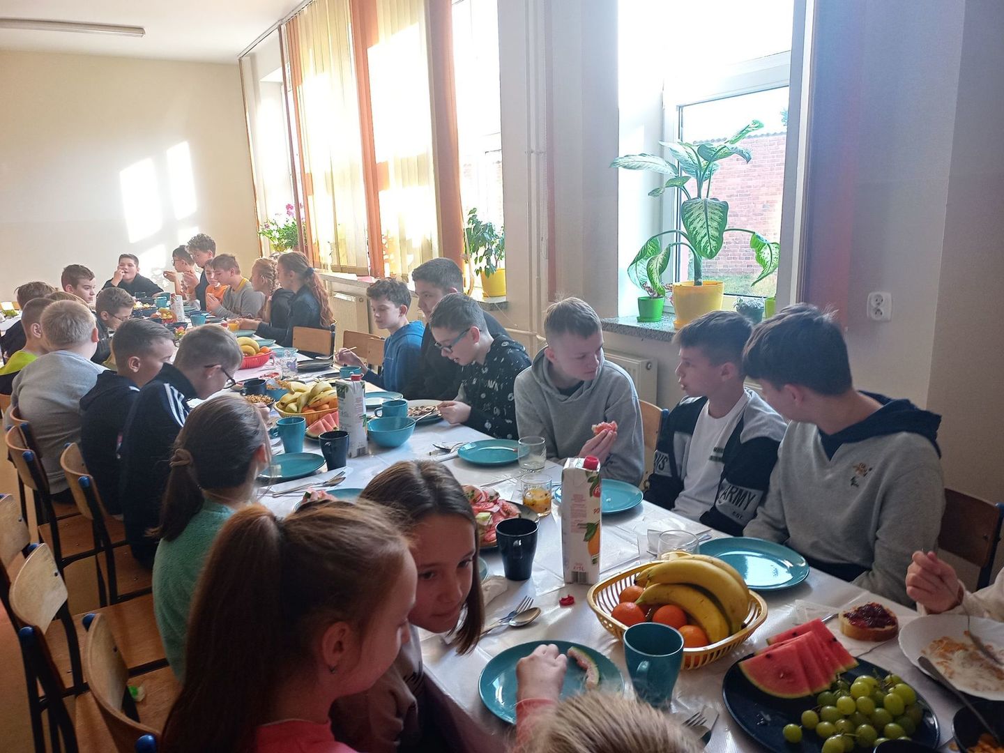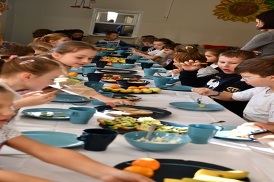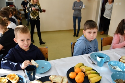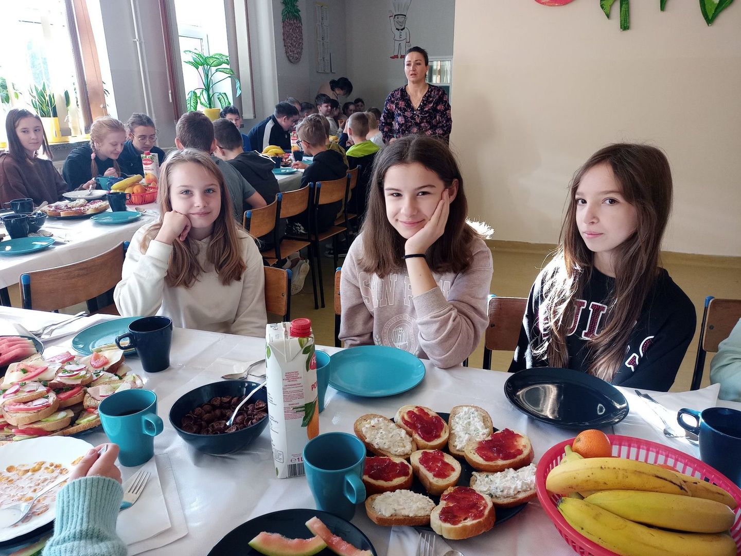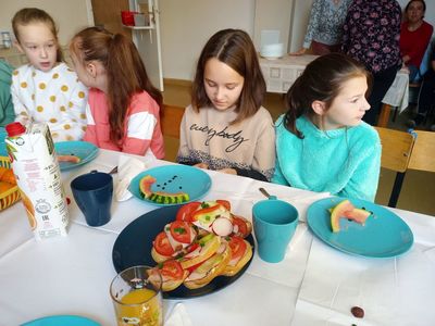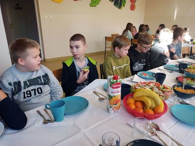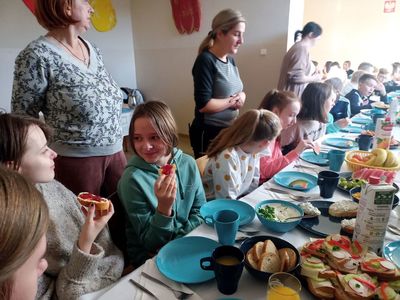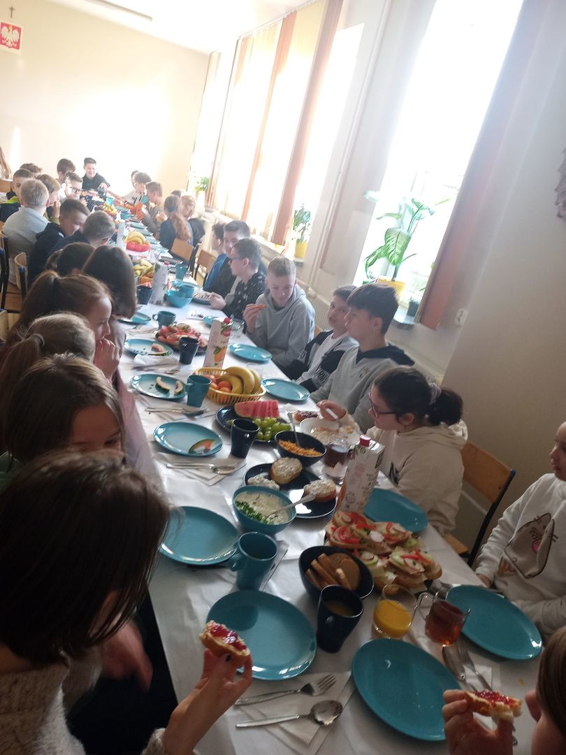 Rodzice zorganizowali w szkolnej stołówce wspólne śniadanie. Uczniowie podzieleni na grupy ze smakiem zjedli przygotowane przez mamy potrawy. Wykorzystanie zdrowych produktów, dużej ilości warzyw i owoców sprawiło, że posiłek był nie tylko zdrowy, ale i kolorowy. Mamy zadbały również o to, aby śniadanie było pięknie podane i swoim wyglądem zachęcało do konsumpcji.