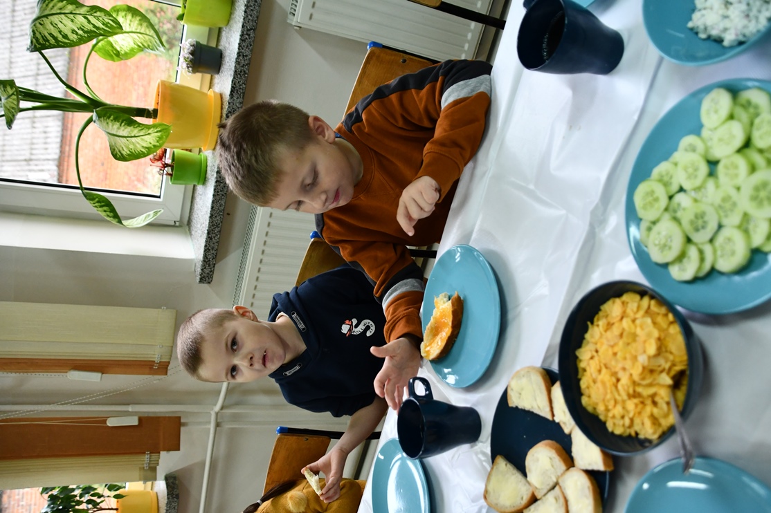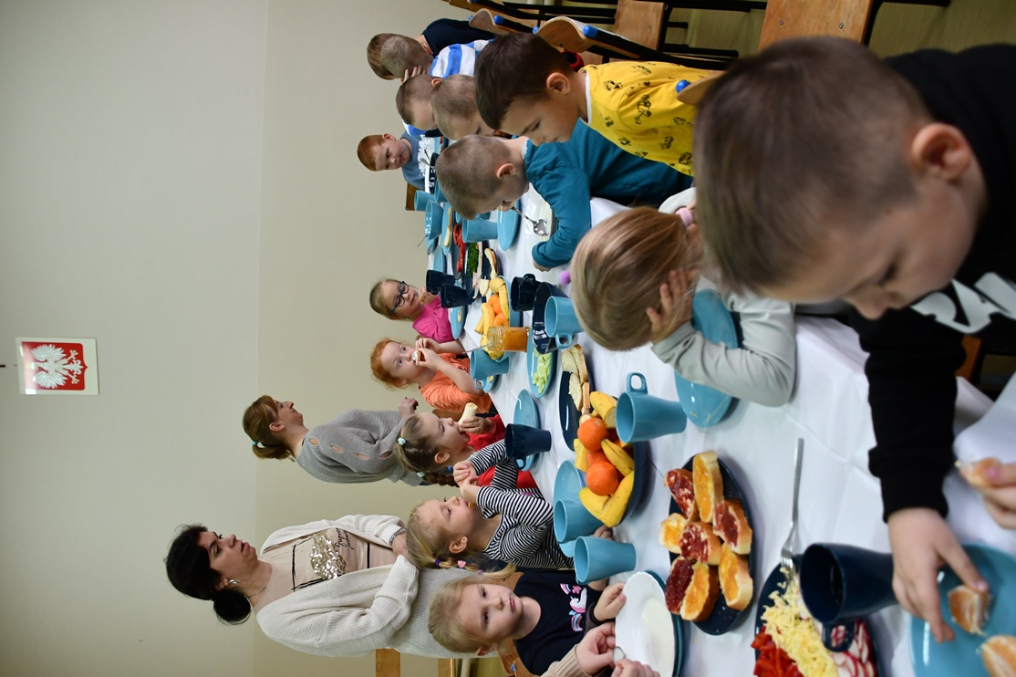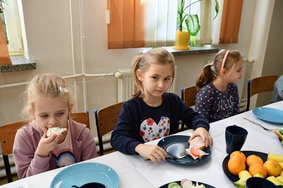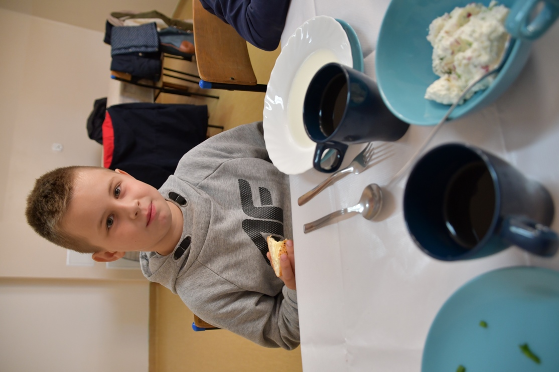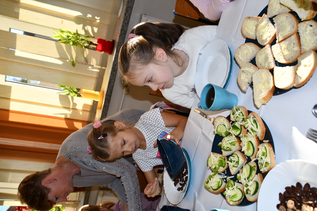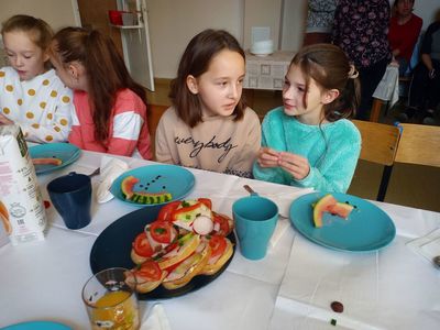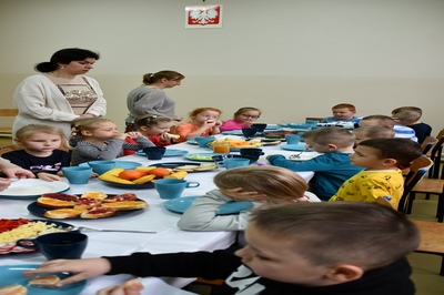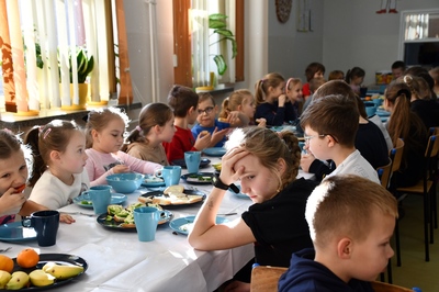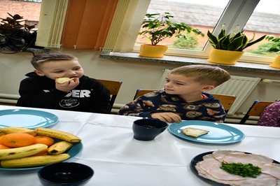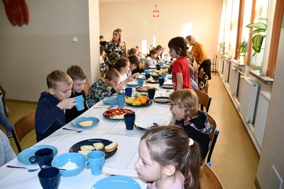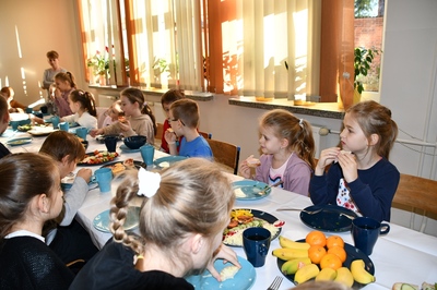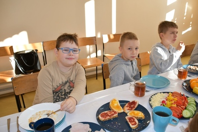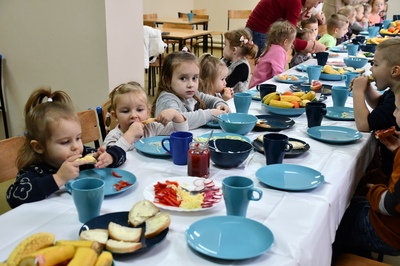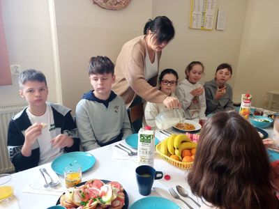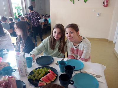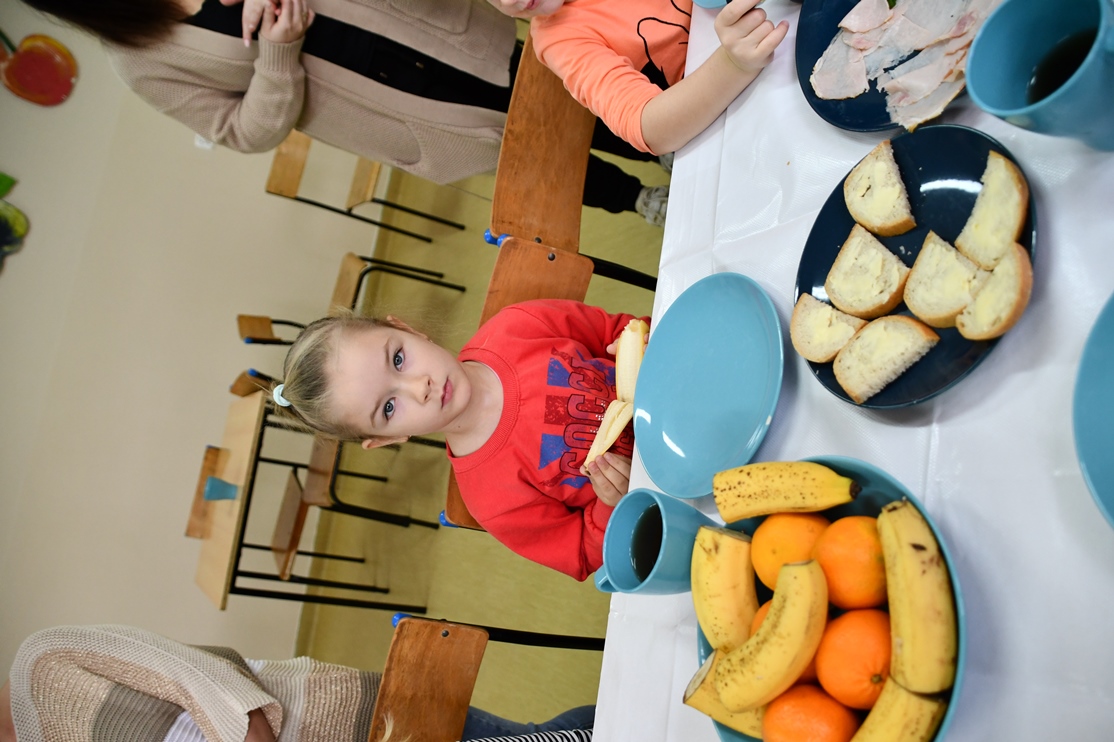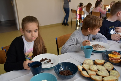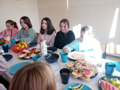 Rodzice zorganizowali w szkolnej stołówce wspólne śniadanie. Uczniowie podzieleni na grupy ze smakiem zjedli przygotowane przez mamy potrawy. Wykorzystanie zdrowych produktów, dużej ilości warzyw i owoców sprawiło, że posiłek był nie tylko zdrowy, ale i kolorowy. Mamy zadbały również o to, aby śniadanie było pięknie podane i swoim wyglądem zachęcało do konsumpcji.