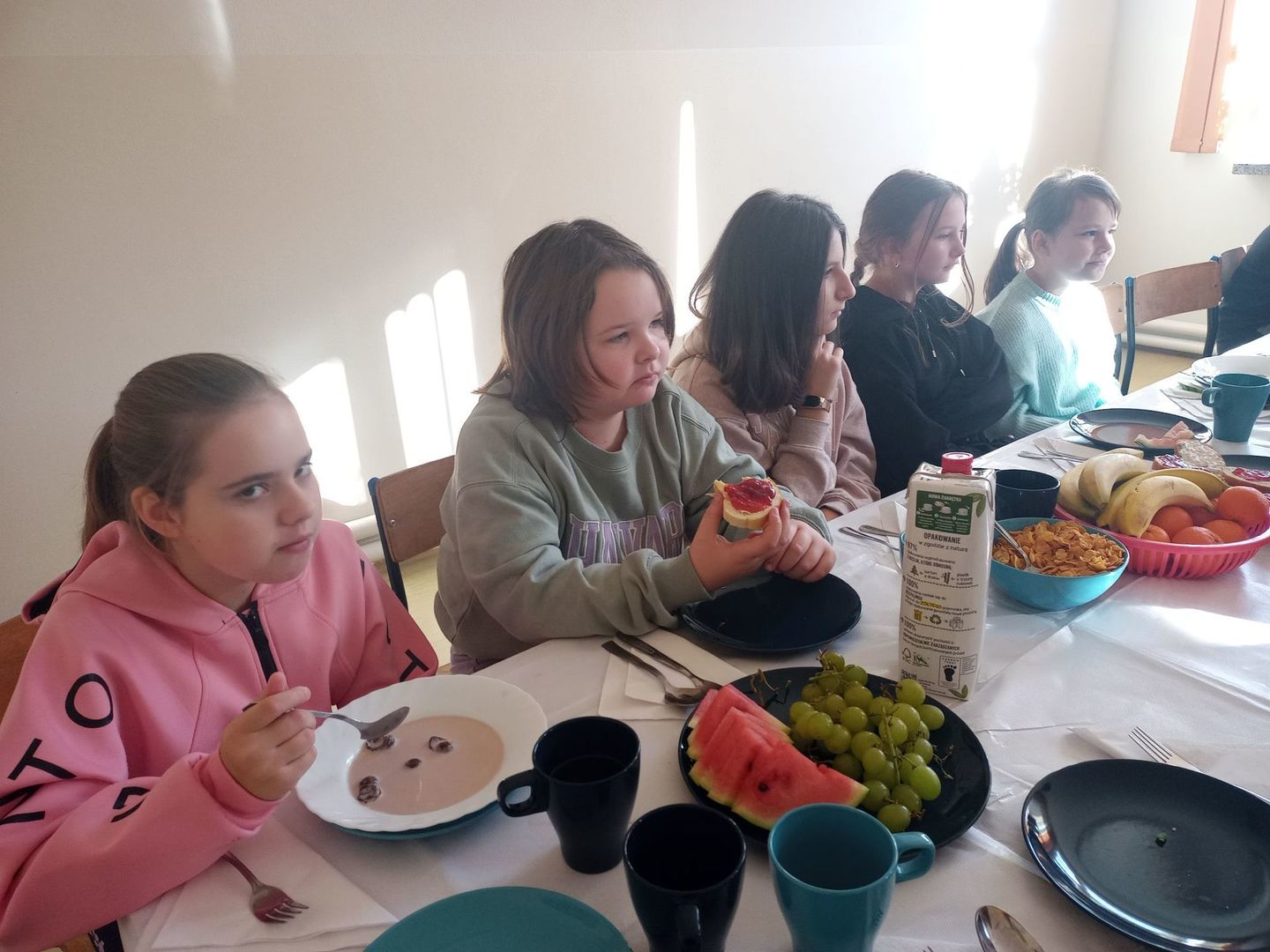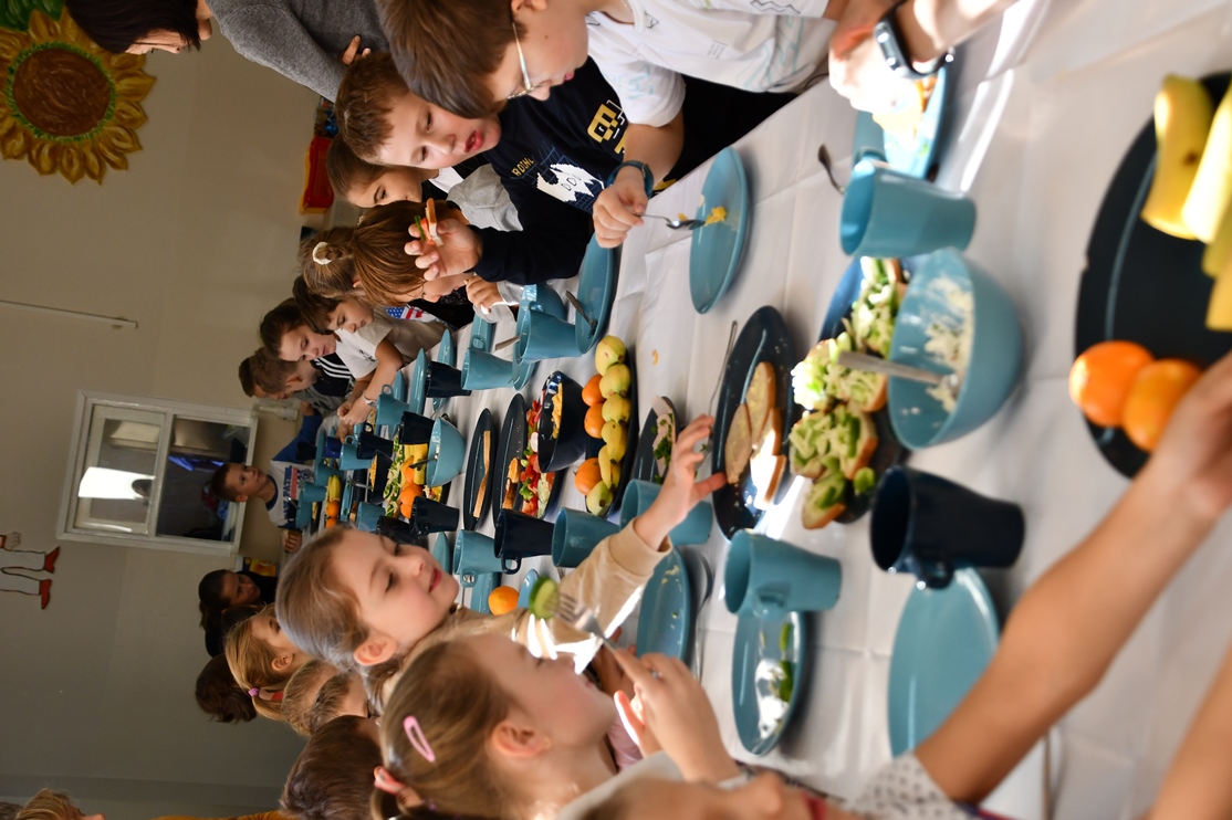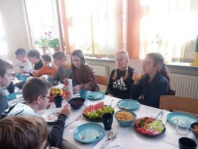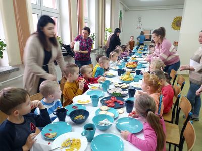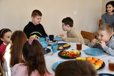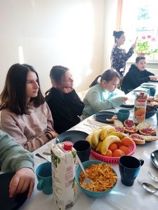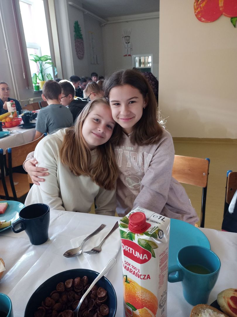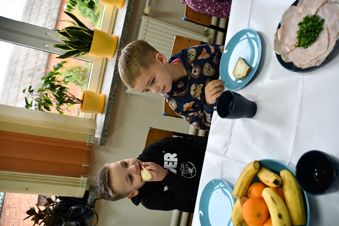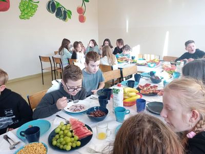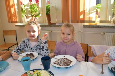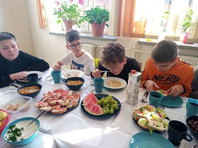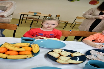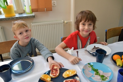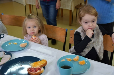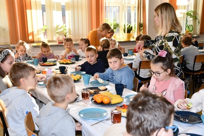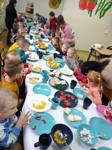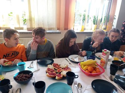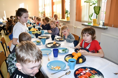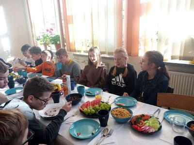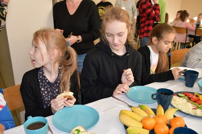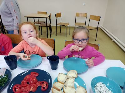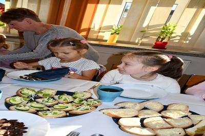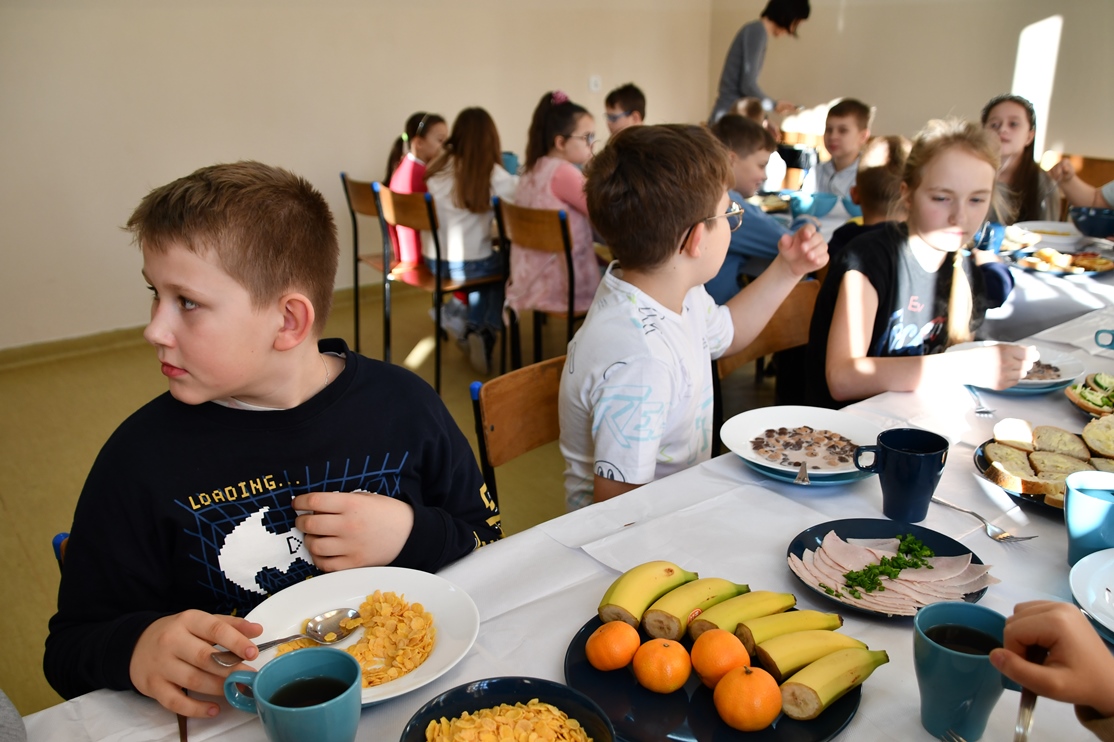 Rodzice zorganizowali w szkolnej stołówce wspólne śniadanie. Uczniowie podzieleni na grupy ze smakiem zjedli przygotowane przez mamy potrawy. Wykorzystanie zdrowych produktów, dużej ilości warzyw i owoców sprawiło, że posiłek był nie tylko zdrowy, ale i kolorowy. Mamy zadbały również o to, aby śniadanie było pięknie podane i swoim wyglądem zachęcało do konsumpcji.