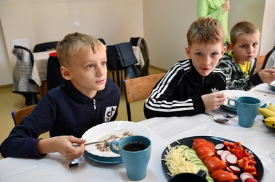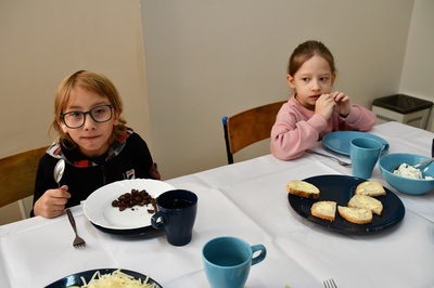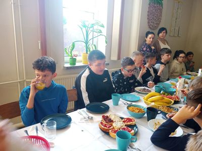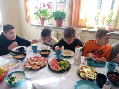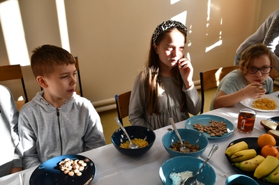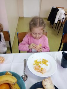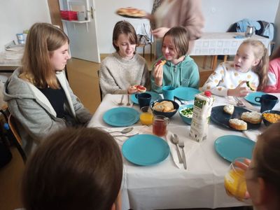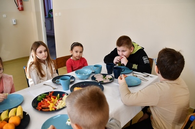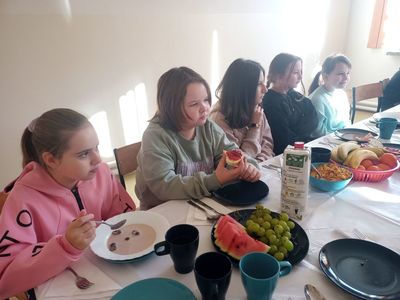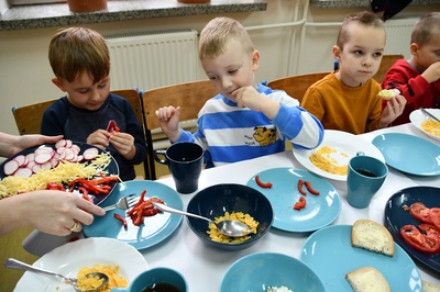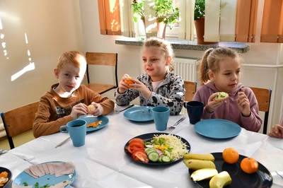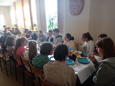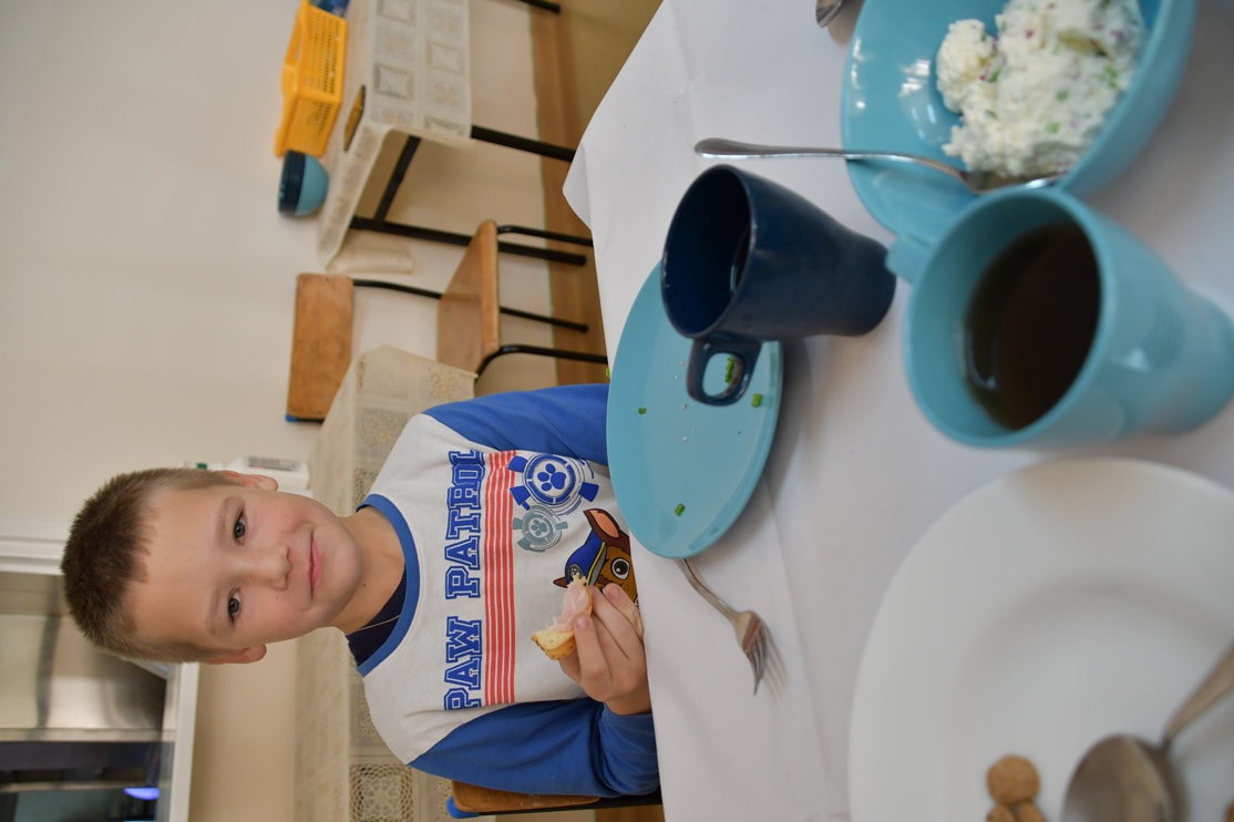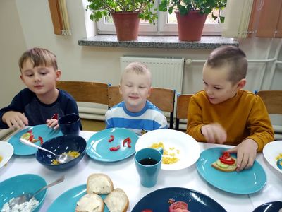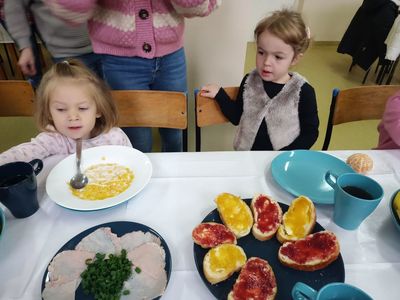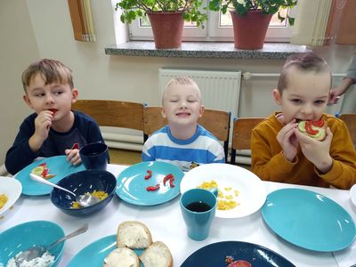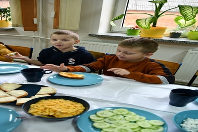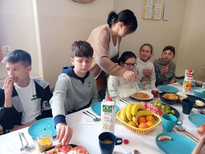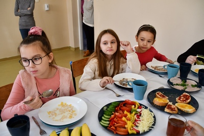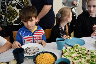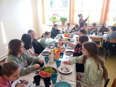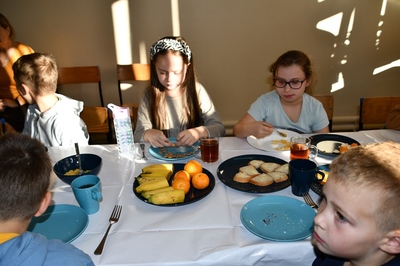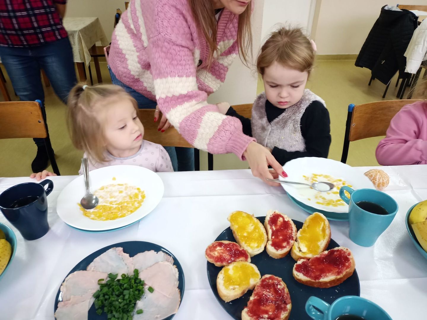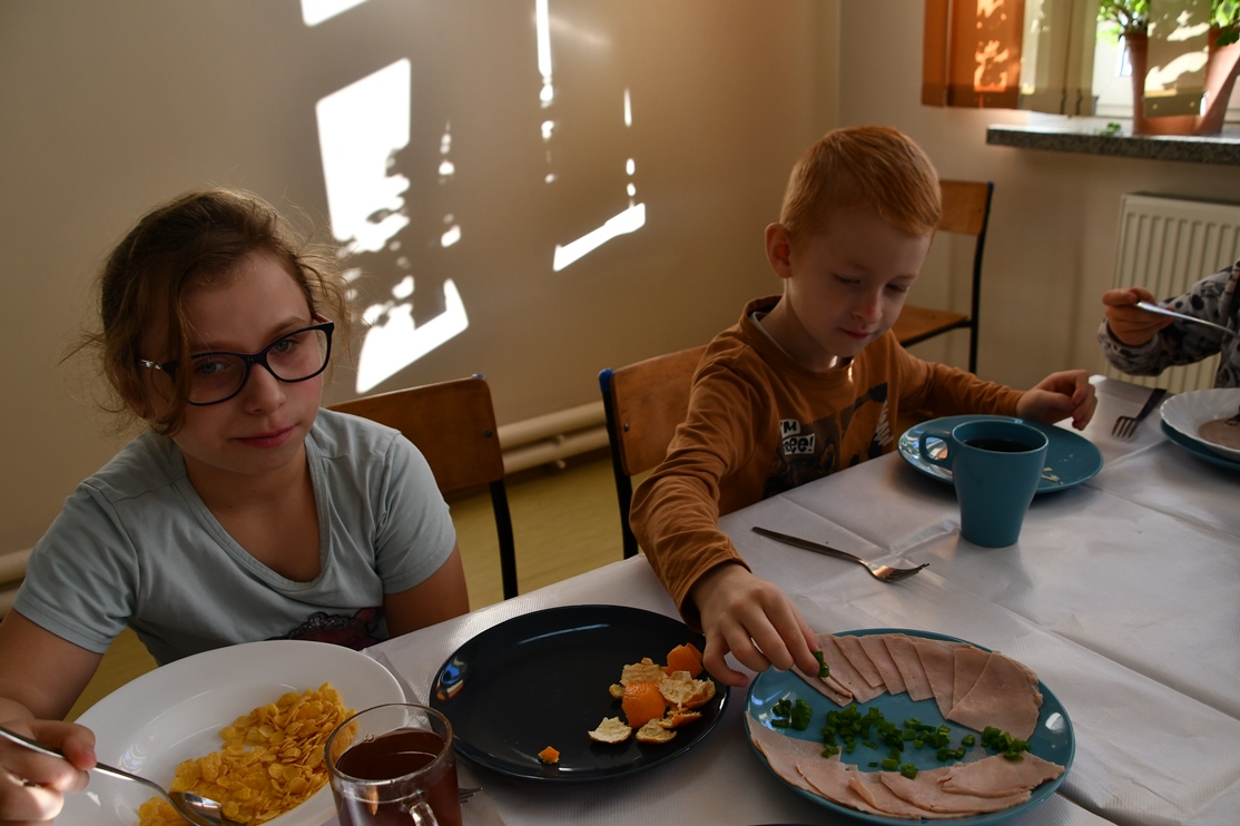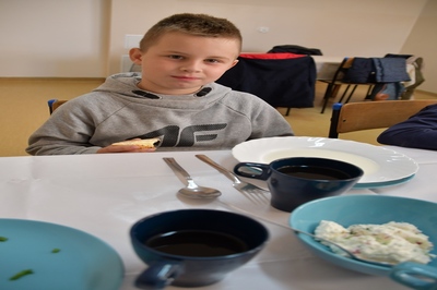 Rodzice zorganizowali w szkolnej stołówce wspólne śniadanie. Uczniowie podzieleni na grupy ze smakiem zjedli przygotowane przez mamy potrawy. Wykorzystanie zdrowych produktów, dużej ilości warzyw i owoców sprawiło, że posiłek był nie tylko zdrowy, ale i kolorowy. Mamy zadbały również o to, aby śniadanie było pięknie podane i swoim wyglądem zachęcało do konsumpcji.
