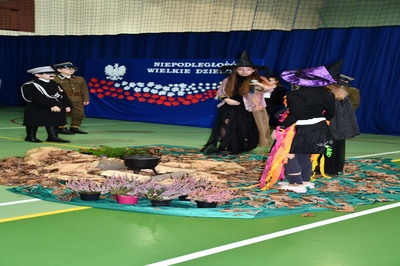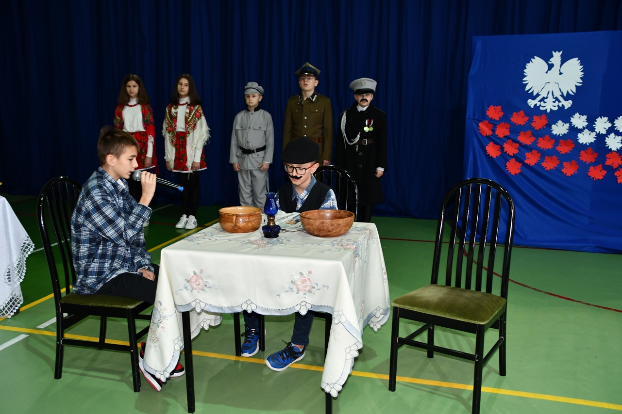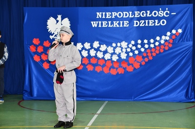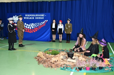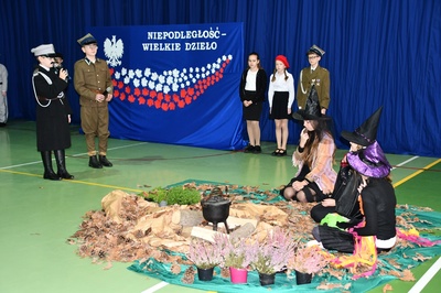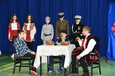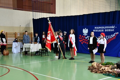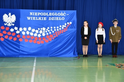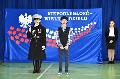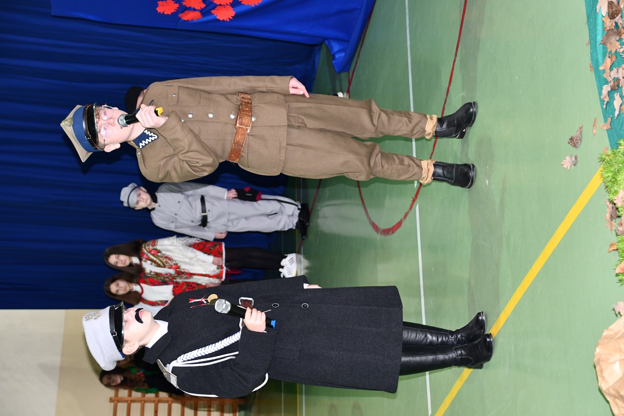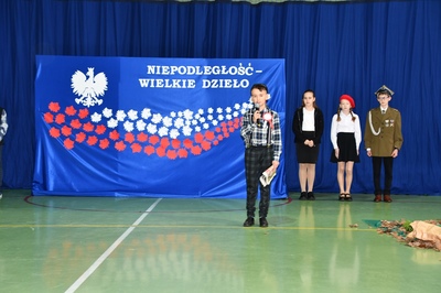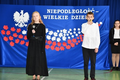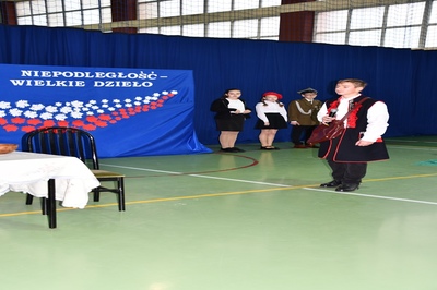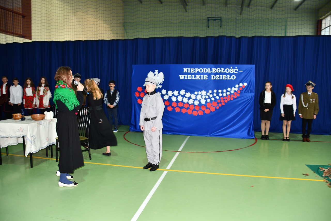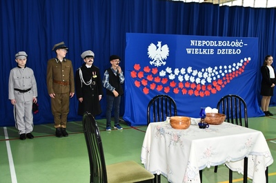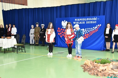 Pamięć o tych, którzy walczyli za wolność i niepodległość uczniowie wyrazili pięknym spektaklem pt. ,, Niepodległość – wielkie dzieło…’’, w którym odegrali role postaci historycznych - bohaterów i ofiar dążeń niepodległościowych oraz przedstawili wydarzenia ukazujące trud, cierpienia Polaków skazanych na tułaczkę, więzienia i te prowadzące do doniosłego momentu odzyskania niepodległości.