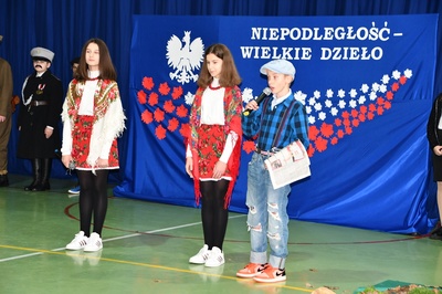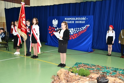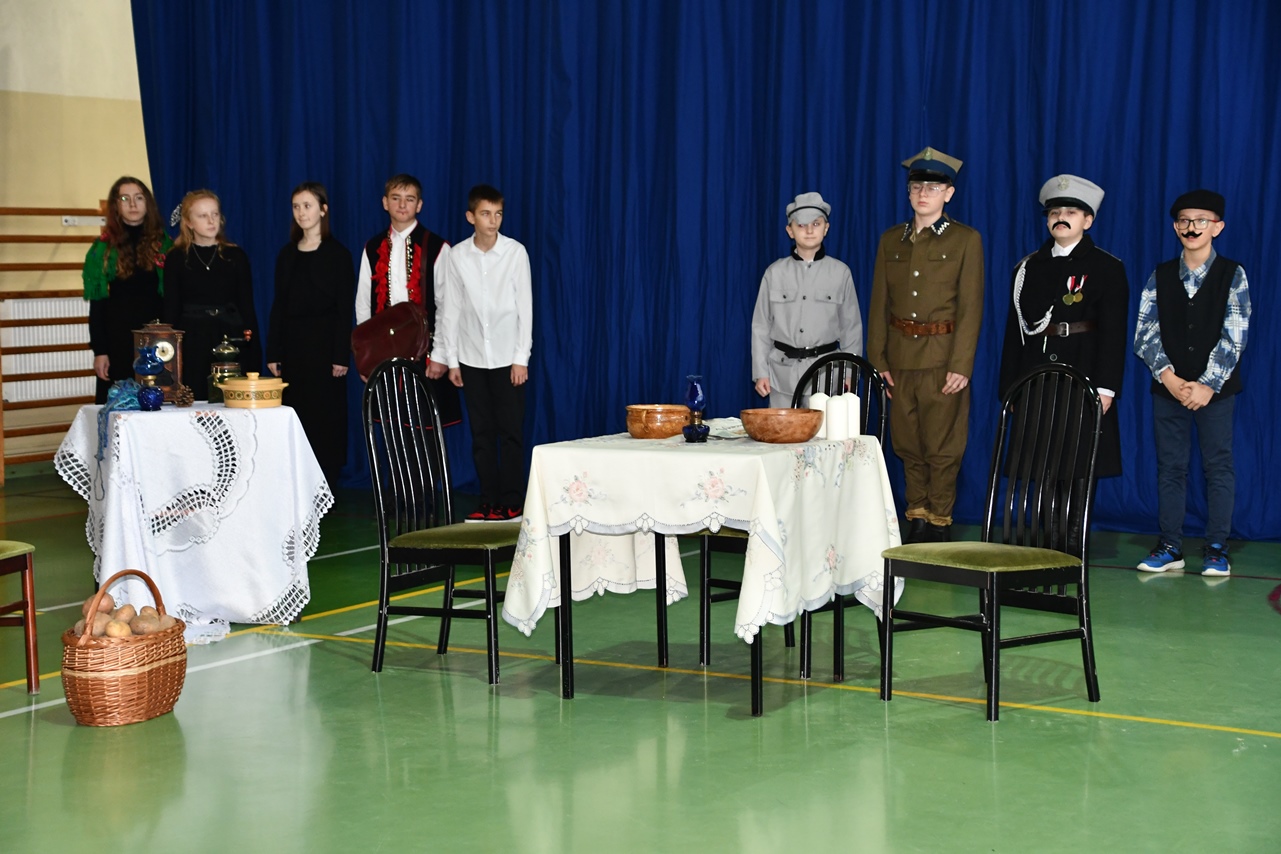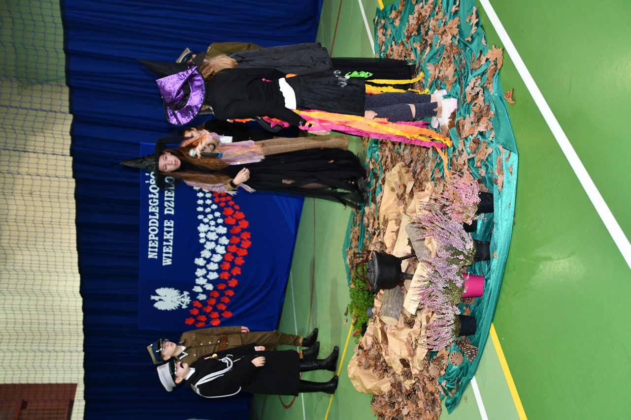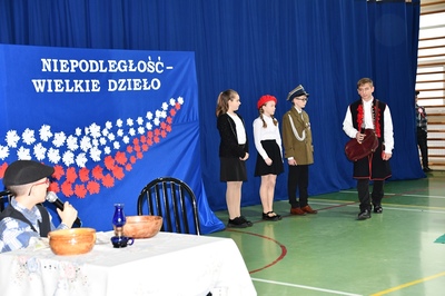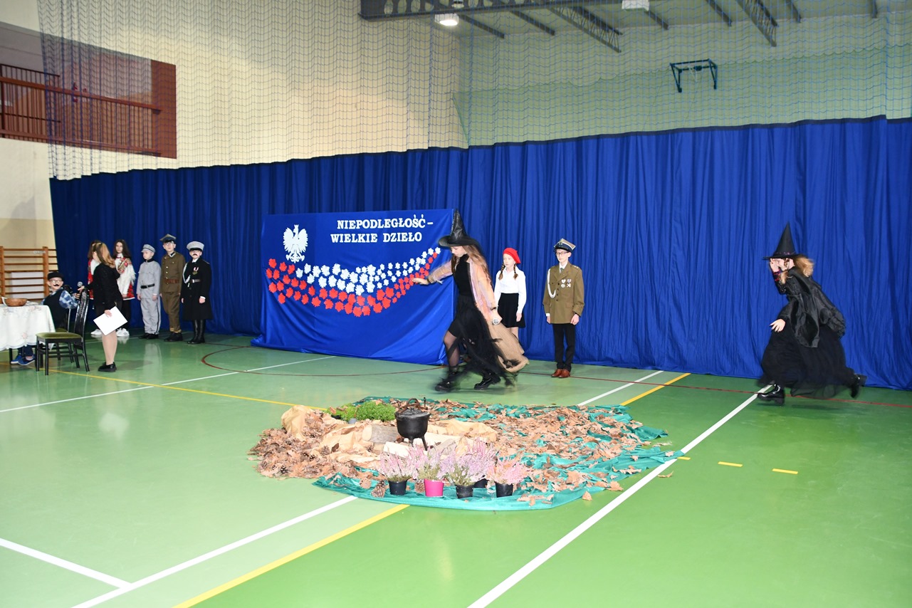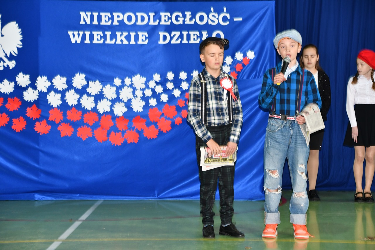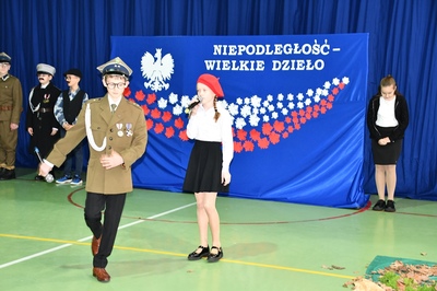 Pamięć o tych, którzy walczyli za wolność i niepodległość uczniowie wyrazili pięknym spektaklem pt. ,, Niepodległość – wielkie dzieło…’’, w którym odegrali role postaci historycznych - bohaterów i ofiar dążeń niepodległościowych oraz przedstawili wydarzenia ukazujące trud, cierpienia Polaków skazanych na tułaczkę, więzienia i te prowadzące do doniosłego momentu odzyskania niepodległości.