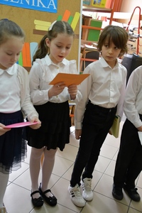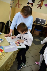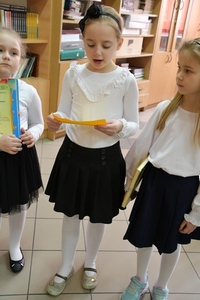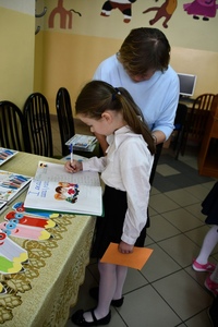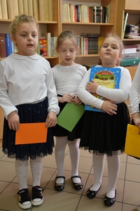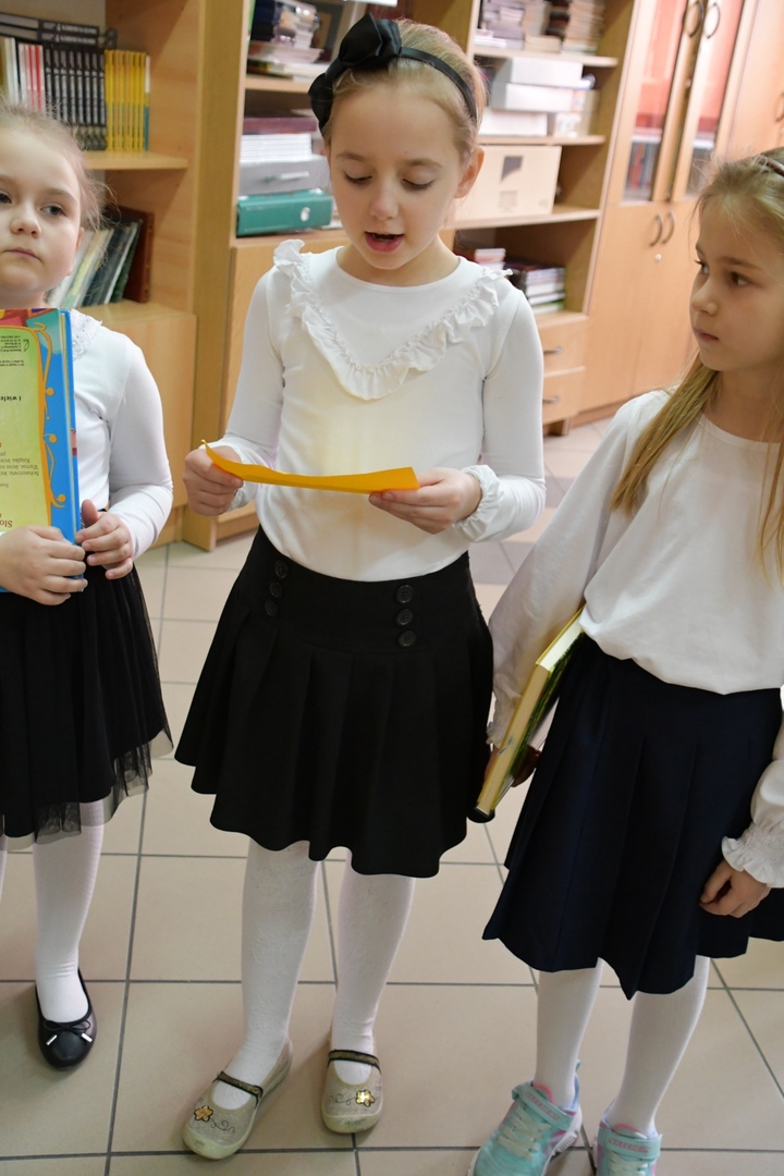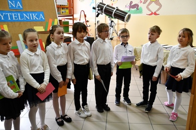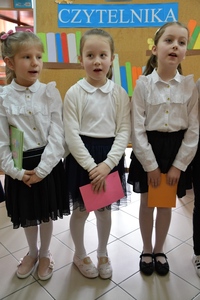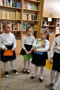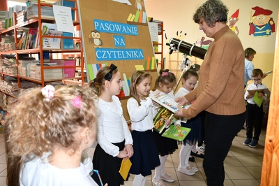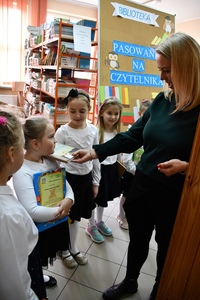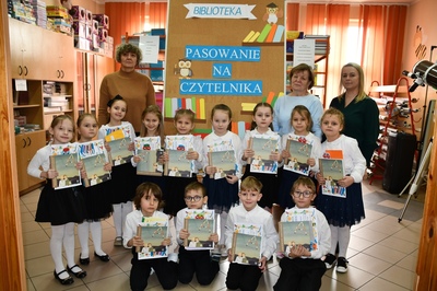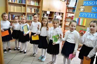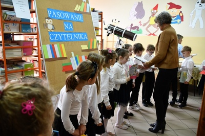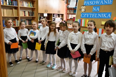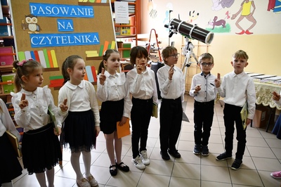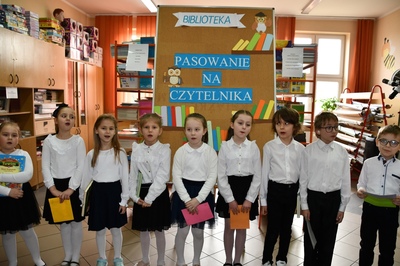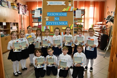 2 marca pierwszoklasiści naszej szkoły zostali oficjalnie przyjęci w poczet czytelników biblioteki szkolnej. Tego dnia odbyło się uroczyste pasowanie na czytelnika. Pierwszaki w obecności dyrektor szkoły Pani Marty Plichty oraz Pani Małgorzaty Żaby, która wypożycza książki w naszej bibliotece zaprezentowały w krótkiej części artystycznej swoje umiejętności recytatorskie, wokalne i czytelnicze. Udowodniły, że potrafią już pięknie czytać a więc mogą wypożyczać i czytać książki. Znają obowiązki czytelnika i przyrzekały, że będą je sumiennie wypełniać. Wiedzą również jakie korzyści daje czytanie książek, więc pewnie będą często odwiedzać bibliotekę.