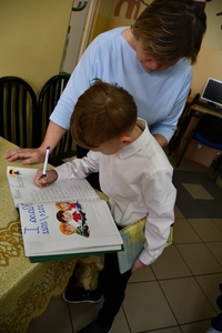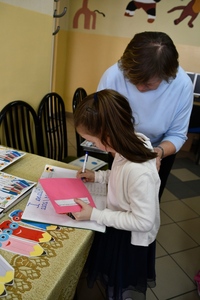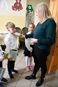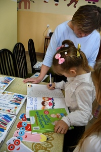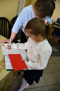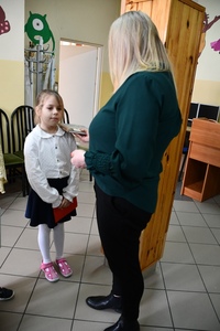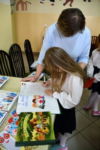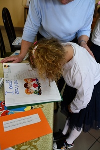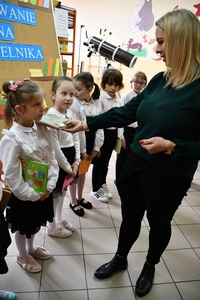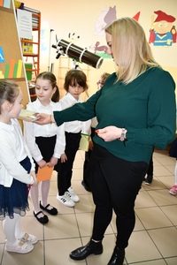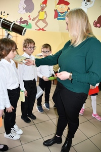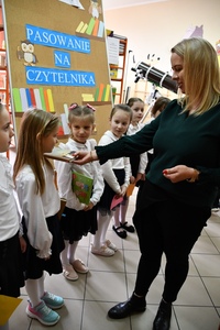 Pasowania na czytelnika dokonała pani bibliotekarka, zaś pani dyrektor obdarowała świeżo upieczonych czytelników drobnymi upominkami.