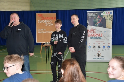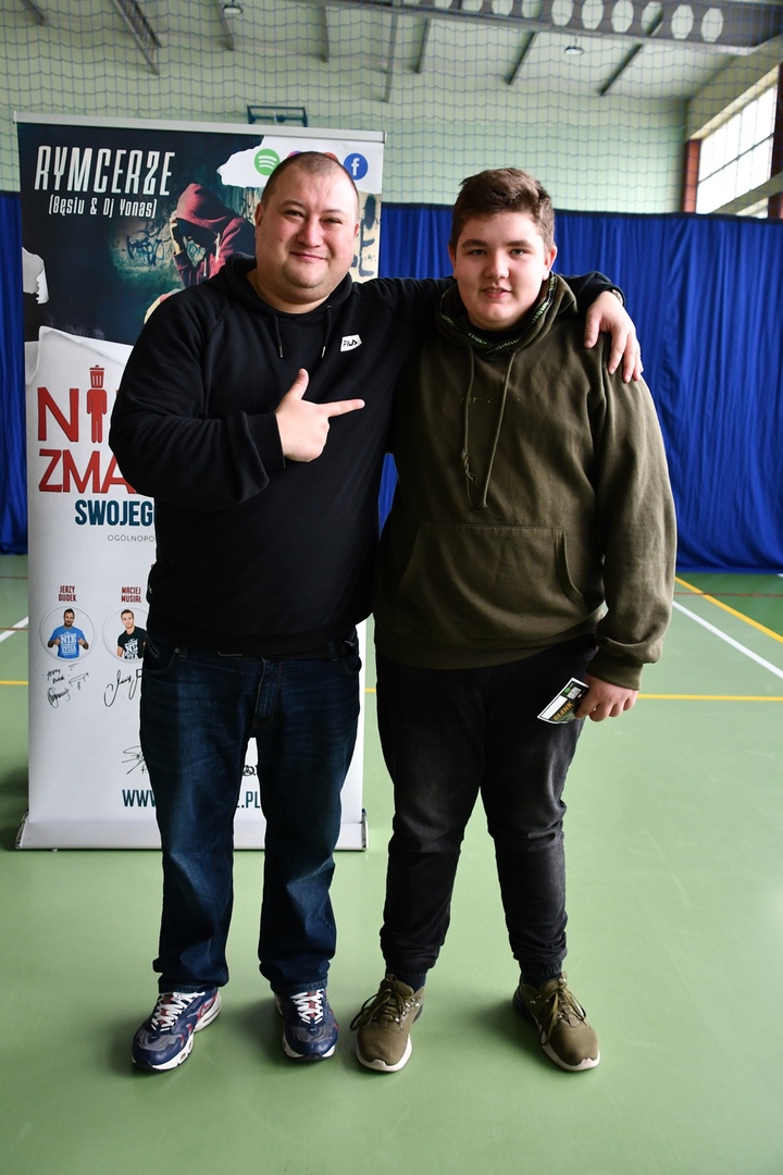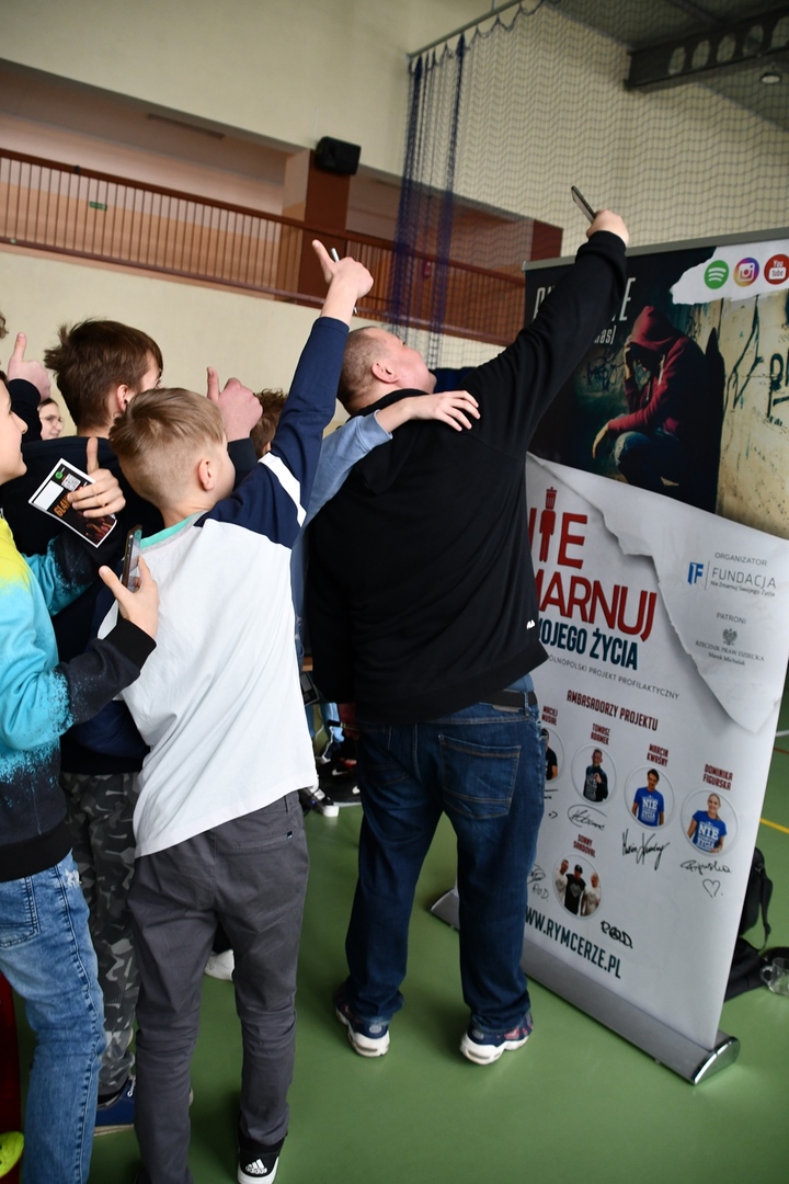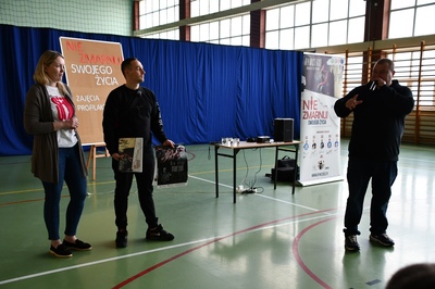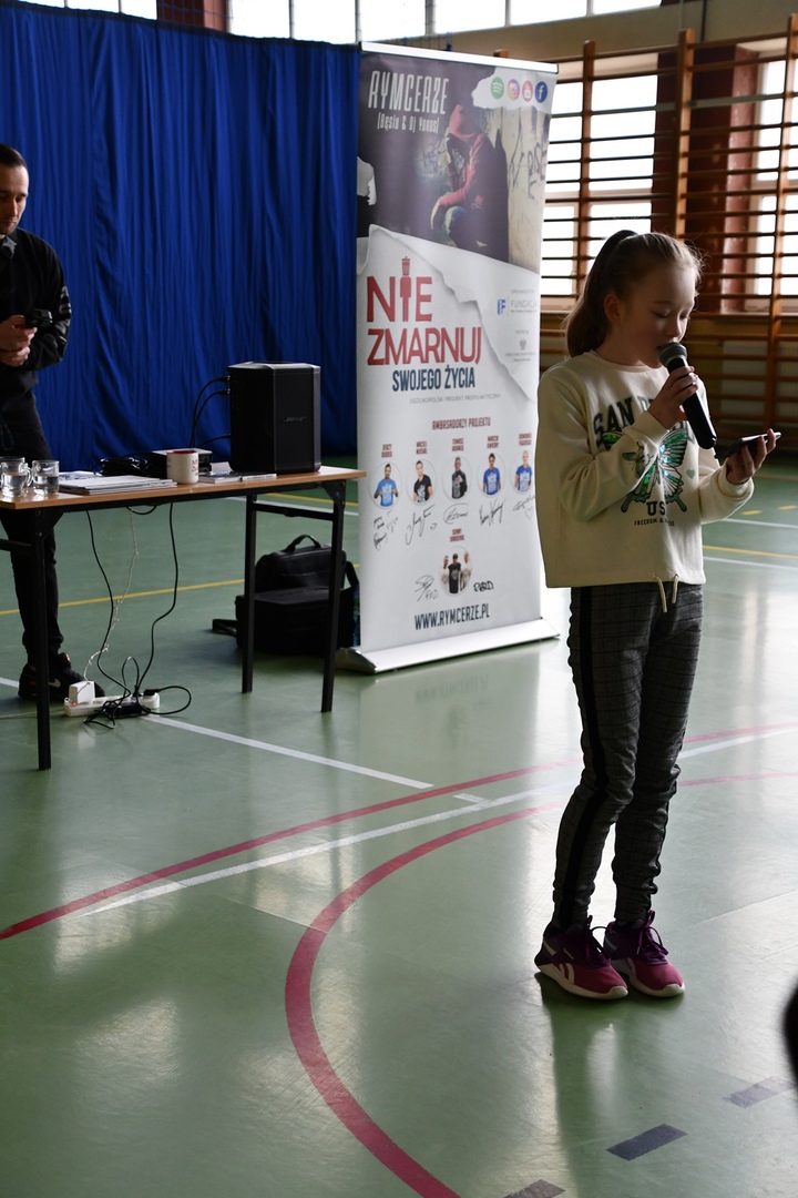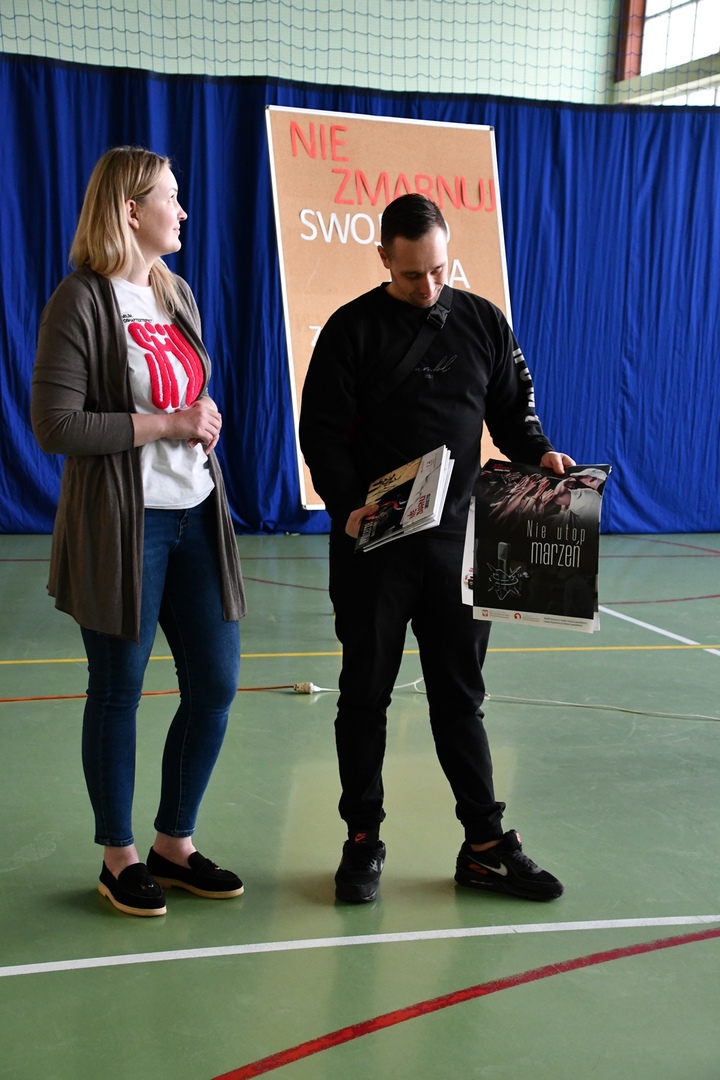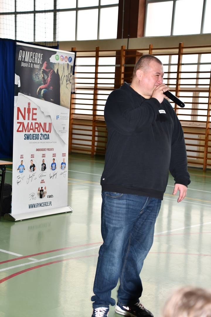 24 marca 2023r. gościliśmy w naszej szkole założycieli Fundacji ,,Nie zmarnuj swojego życia’’ - Łukasza Bęsia oraz Jonatana Blanka, którzy są autorami i prowadzącymi projektu profilaktycznego skierowanego do dzieci i młodzieży. Spotkanie połączone zostało z mini-koncertem hip-hopowym, w trakcie którego nasi goście ostrzegli uczniów przed konsekwencją brania używek i zachęcili do bycia sobą i do odkrywania swoich pasji.