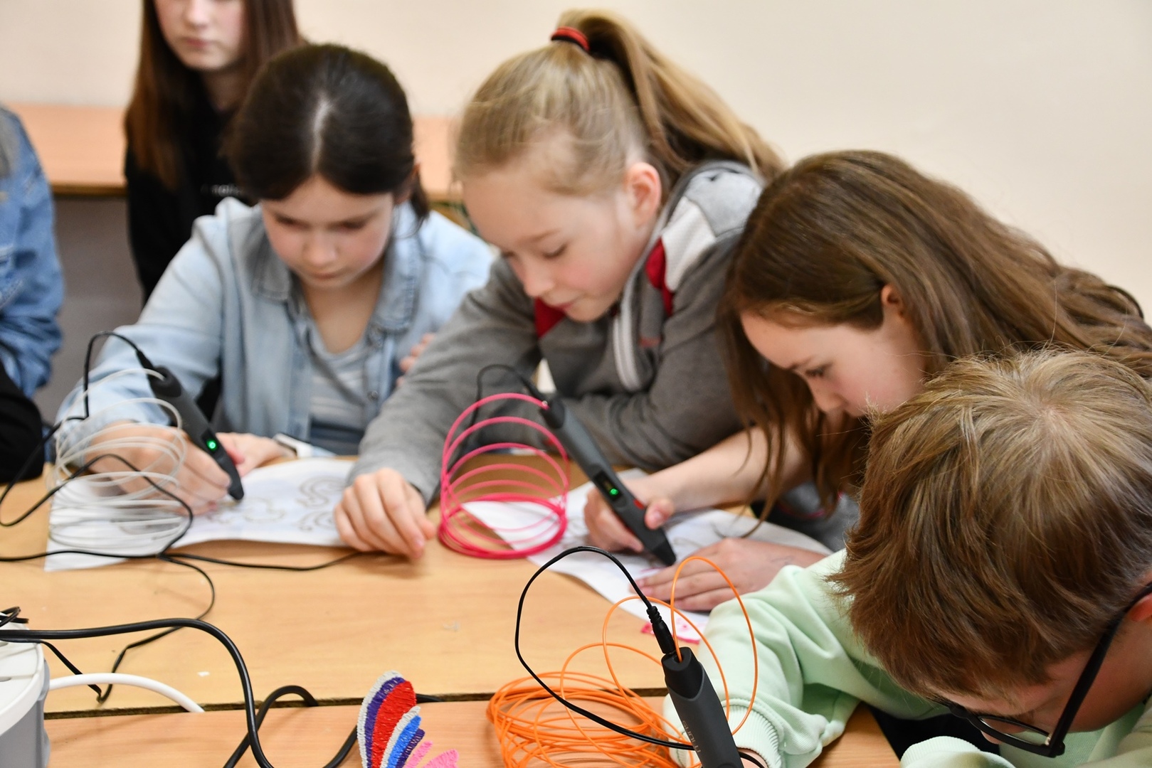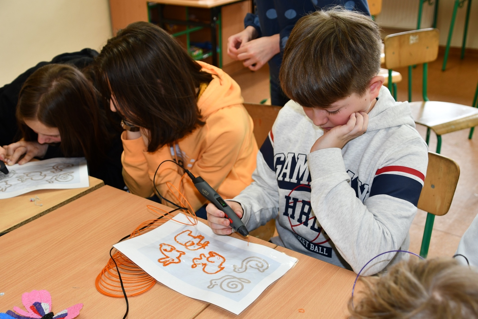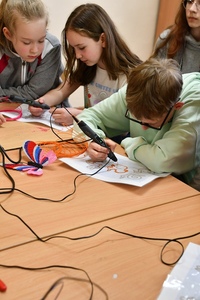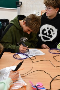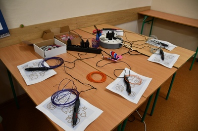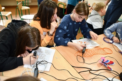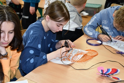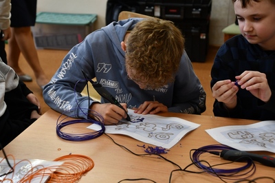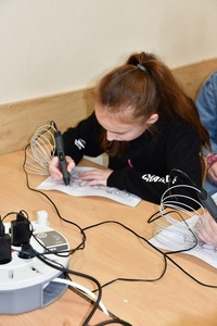 W czasie zajęć każdy uczeń mógł wykonać własny wydruku przy użyciu długopisu 3D. Praca z tym długopisem wymagała cierpliwości i dokładności. Aby efekt końcowy był staranny i estetyczny ruchy ręki musiały być bardzo precyzyjne. Pierwsze próby pokazywały, że nie zawsze jest to proste.