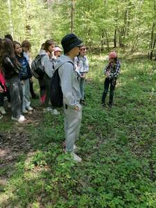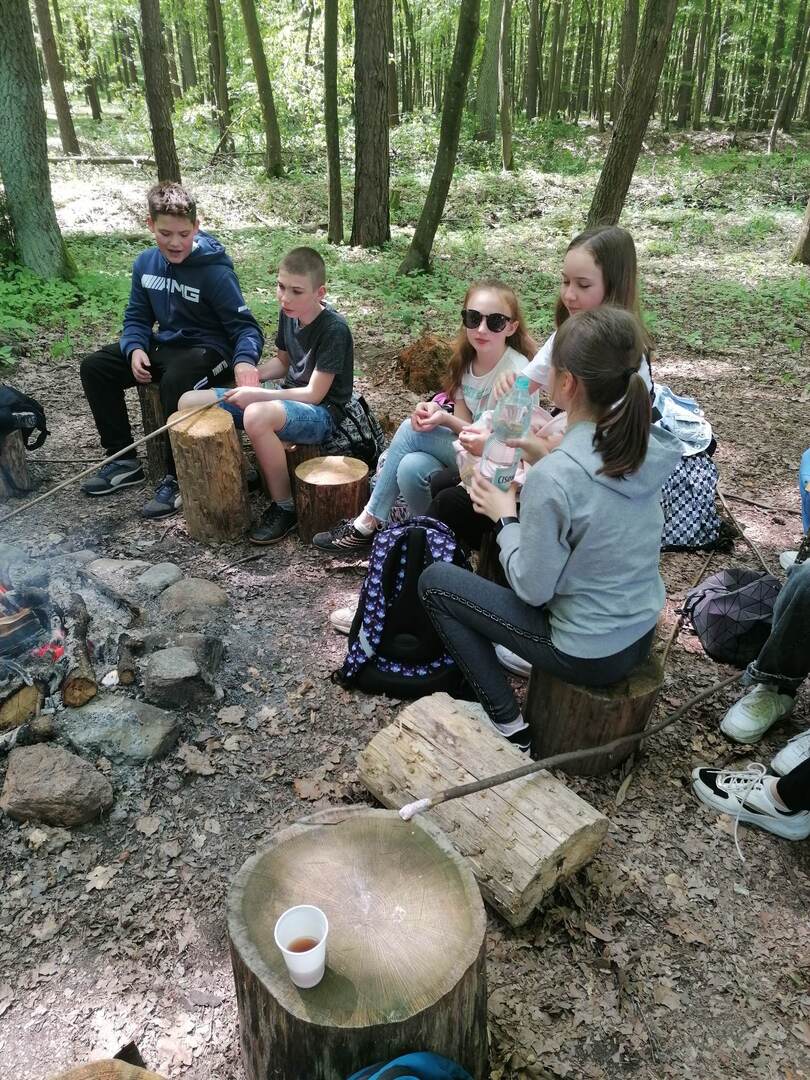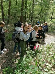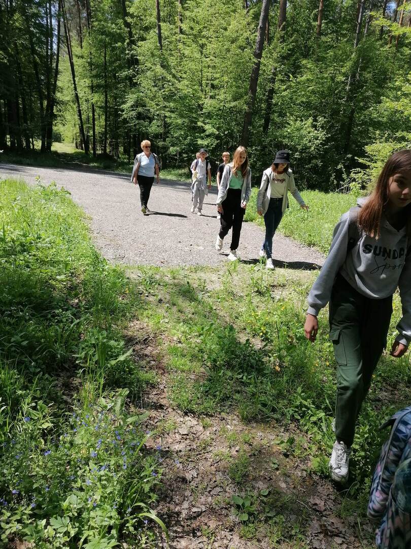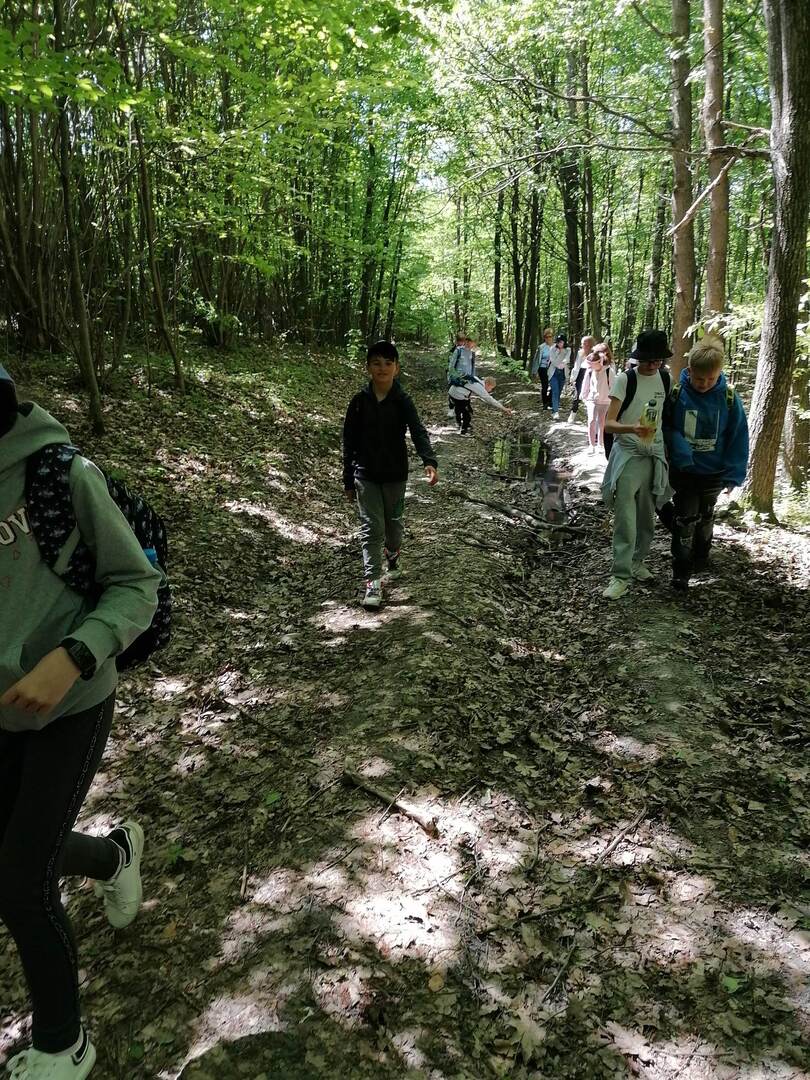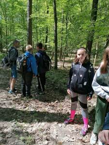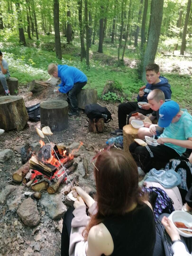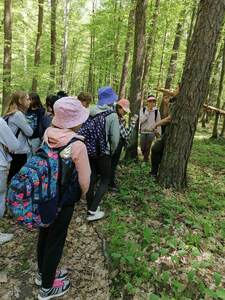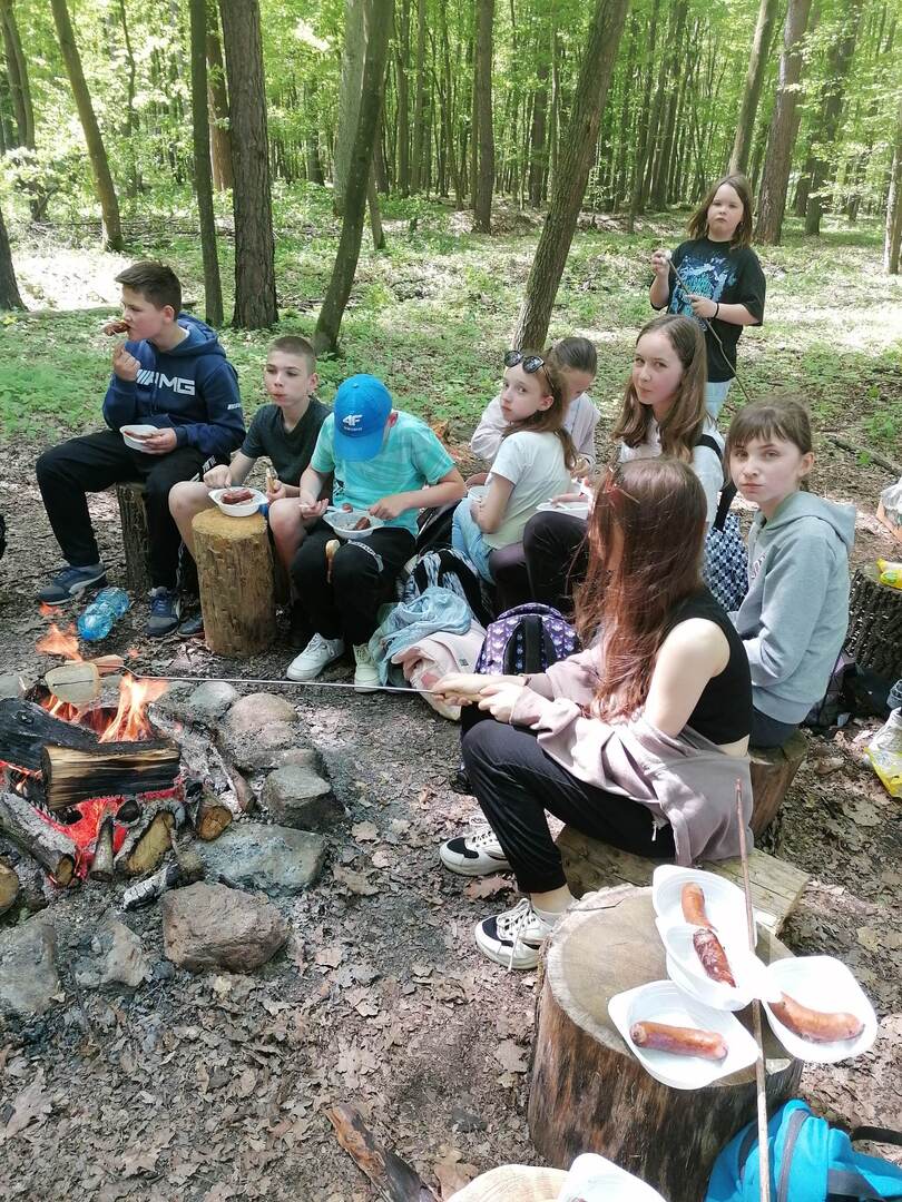 Na początku zajęć zapoznaliśmy się z przebiegiem trasy przyrodniczej oraz omówiliśmy zasady kulturalnego zachowania się w lesie. Podczas wędrówki mogliśmy zobaczyć z bliska młode okazy drzew, wchodzących w skład górnego piętra lasu grądowego (dąb szypułkowy, lipa drobnolistną, grab pospolity, klon zwyczajny). Na ścieżce edukacyjnej spotkaliśmy również osikę, brzozę brodawkowatą, czereśnię oraz wiązy - drzewa, które w lasach grądowych stanowią domieszkę w górnym piętrze lasu. Pięknie kwitło runo leśne, które odznacza się bogactwem gatunkowym i zróżnicowaniem sezonowym. Podziwialiśmy m.in. zawilca gajowego, gajowca żółtego, konwalię majową, dąbrówkę rozłogową, kopytnika pospolitego, narecznicę samczą, groszek wiosenny, konwalijkę dwulistną, szczawik zajęczy. Na trasie ścieżki przyrodniczej są też stare drzewa z dziuplami i obumierającymi gałęziami, a także drzewa stojące, lecz już martwe. Stanowią one środowisko życia licznych organizmów związanych pokarmowo lub środowiskowo z martwym drewnem. Wiele gatunków owadów żyje tylko na zamierających i martwych drzewach stojących. Przykładem mogą być gmachówki – duże leśne mrówki, które silnymi szczękami i ostrymi zębami drążą w drewnie korytarze tworząc oryginalne gniazda. W starych drzewach są też dziuple, które dają schronienie ptakom, ssakom i bezkręgowcom. Podczas zajęć mięliśmy okazję do poszerzenia wiedzy o lesie, jego mieszkańcach oraz o zasadach gospodarki leśnej. Wędrówkę leśnymi szlakami zakończyliśmy pieczeniem nad ogniskiem smakowitych kiełbasek.