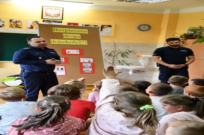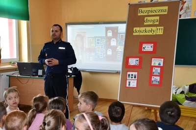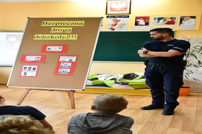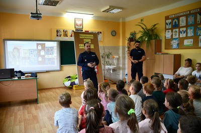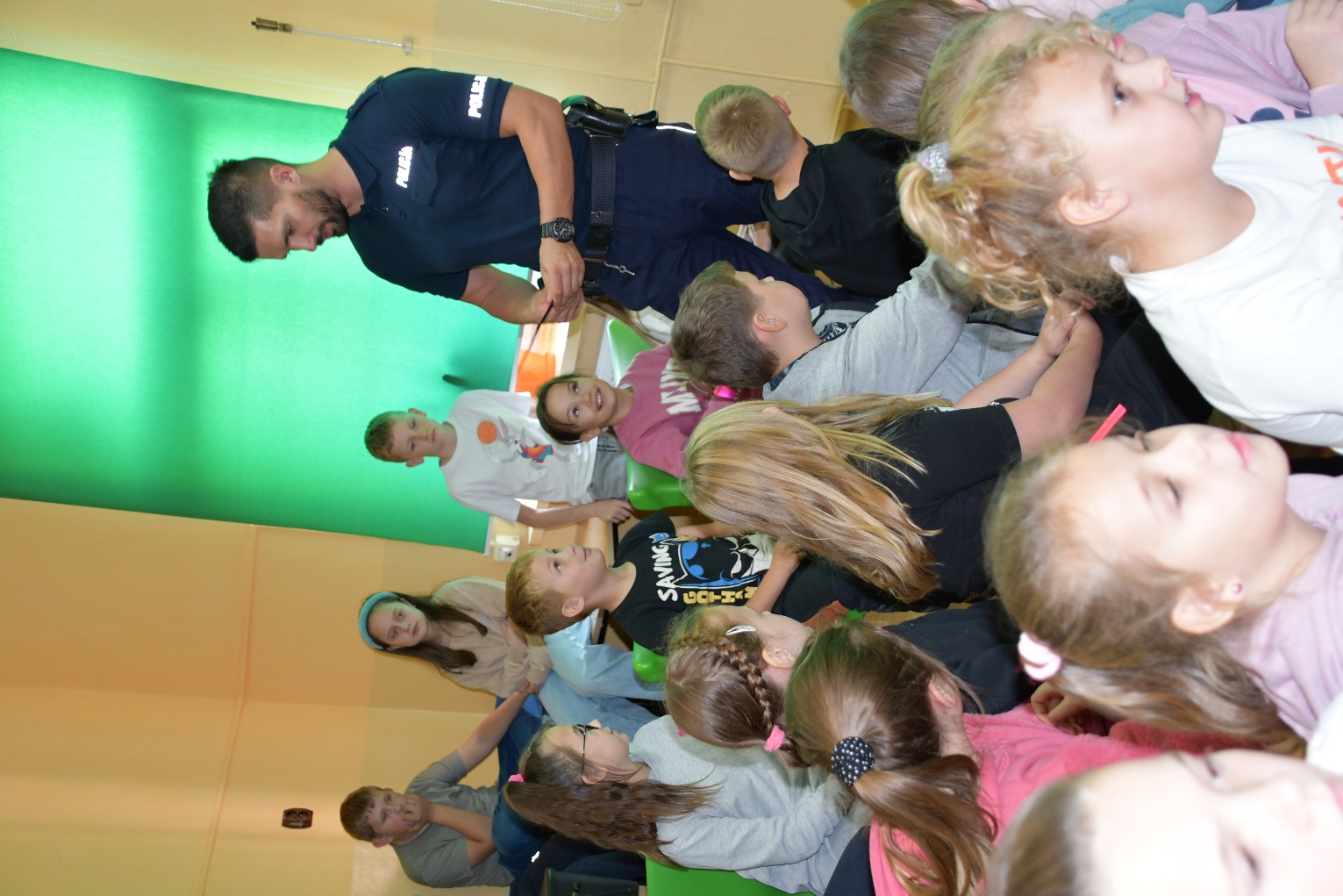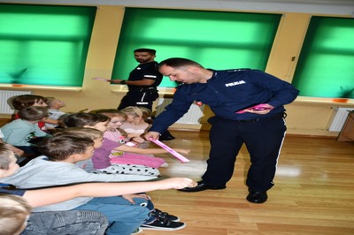 W ubiegłą środę, tj. 11 października odbyło się spotkanie z policjantami z KPP w Kraśniku na temat bezpiecznej drogi uczniów do szkoły. Tym razem uczestniczyli w nim uczniowie klas     I- IV.                                                                                                                                                         Panowie policjanci, mając na uwadze bezpieczeństwo dzieci już po raz kolejny przypomnieli podstawowe zasady bezpiecznego poruszania się po drodze. Odpowiadali na liczne pytania zadawane przez uczniów. Podsumowaniem spotkania był krótki film nawiązujący tematycznie do poruszanych wcześniej zagadnień.                                                                           Na zakończenie uczestnicy spotkania otrzymali skromne, ale jakże przydatne upominki- były to opaski odblaskowe.                                                                                                                        Panowie policjanci dziękujemy wam za troskę
