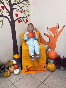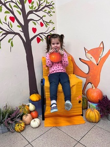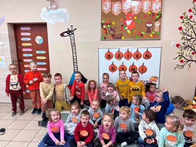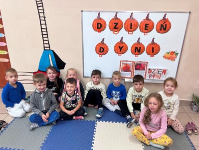 Święto Dyni obchodzimy 31 października jest to dość nowa polska tradycja, która dotyczy otaczającej nas dekoracji sezonowych warzyw w tym wypadku dyni ma na celu promować  ją jako zdrowe i wartościowe warzywo, które można spożywać na różne sposoby i dodawać do wielu potraw a nawet ciast i ciasteczek. Dla naszych najmłodszych ten dzień jest okazją na założenie ciekawej garderoby w kolorze pomarańczowym. Wspólnym zabawą, pląsom przy muzyce, zajęciom plastycznym towarzyszył motyw przewodni pomarańczowej dyni. Dzieci poznały to ciekawe warzywo, jego pochodzenie, smak, określały kolor, kształt i strukturę pomarańczowej ,,bomby'' witaminowej, którą możemy wykorzystać niemalże w całości.  Dowiedziały się, że to warzywo jest głównym elementem dekoracji w okresie późnej jesieni. Przedszkolaki chętnie brały udział w zabawach i słuchały ciekawostek dotyczących tego ciekawego i wszechstronnego warzywa.