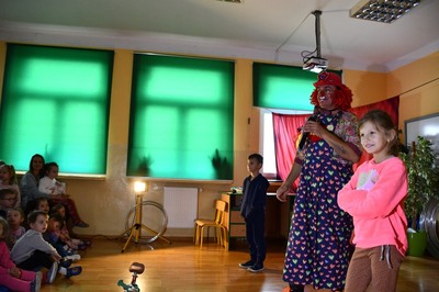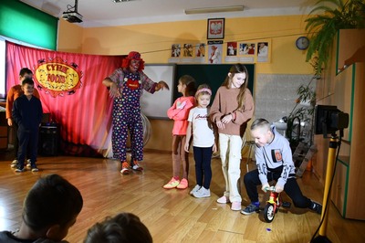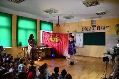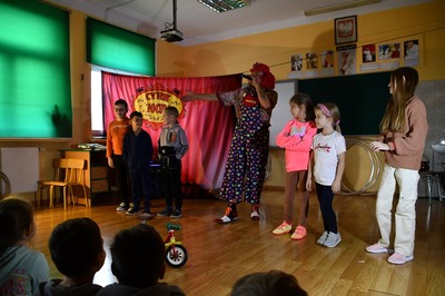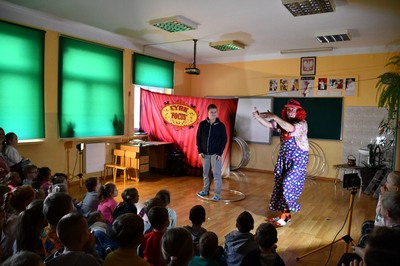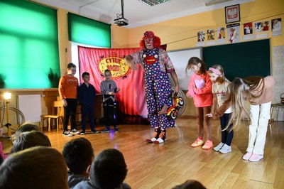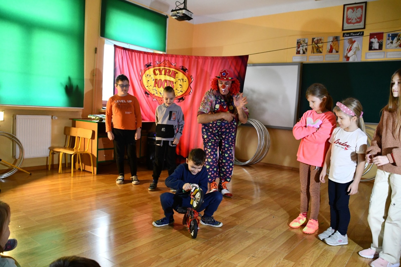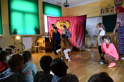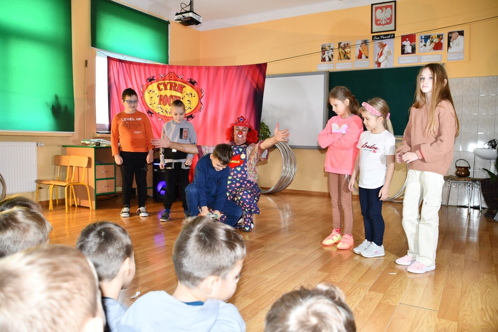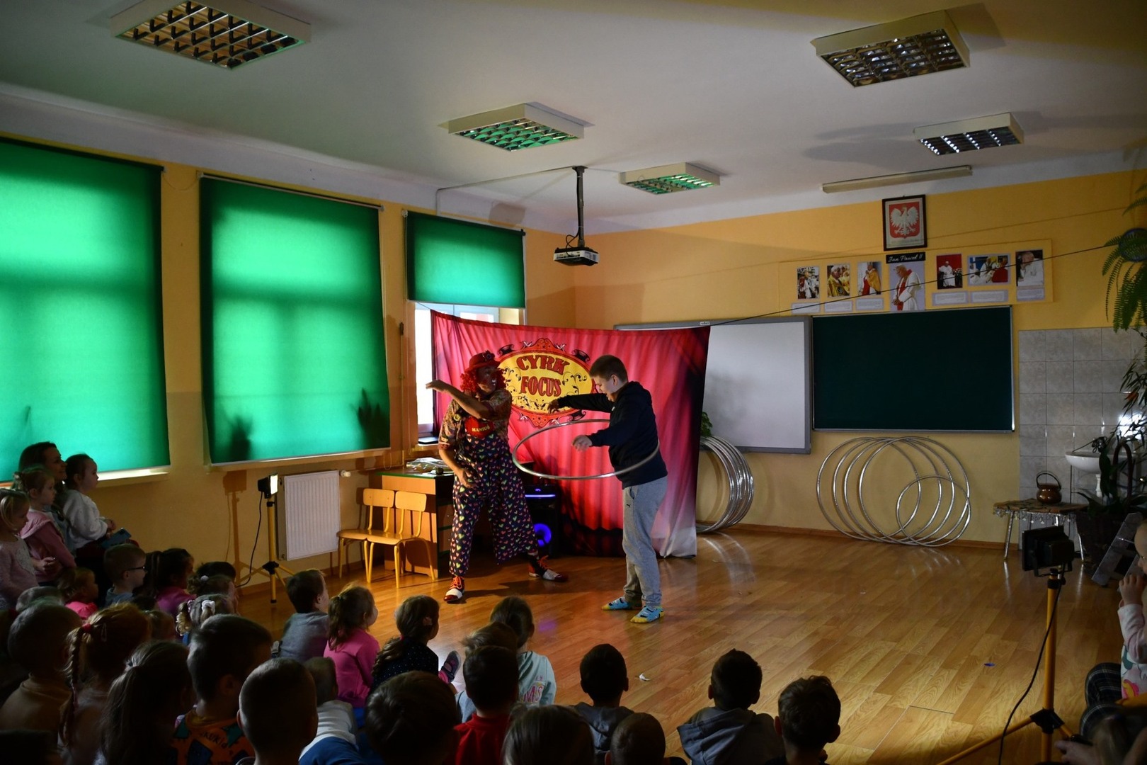 Przedszkolaki oraz klasy  I-III  w poniedziałek 13 listopada obejrzały przedstawienie artystów z cyrku „Fokus”. W czasie  występu mieliśmy okazję podziwiać  sztuczki cyrkowe, a także brać czynny udział w realizacji wielu z nich. Oglądaliśmy tresowane zwierzątka,  popisy akrobatyczne na małym rowerku i z obręczami. Wielką atrakcją okazał się królik, którego każde dziecko mogło dotknąć lub pogłaskać. Dzieciom spodobał się również zabawny klown Maniuś. Wszyscy doskonale bawili się oglądając występy cyrkowców i nagrodzili artystów gromkimi brawami, na które bezsprzecznie zasłużyli!