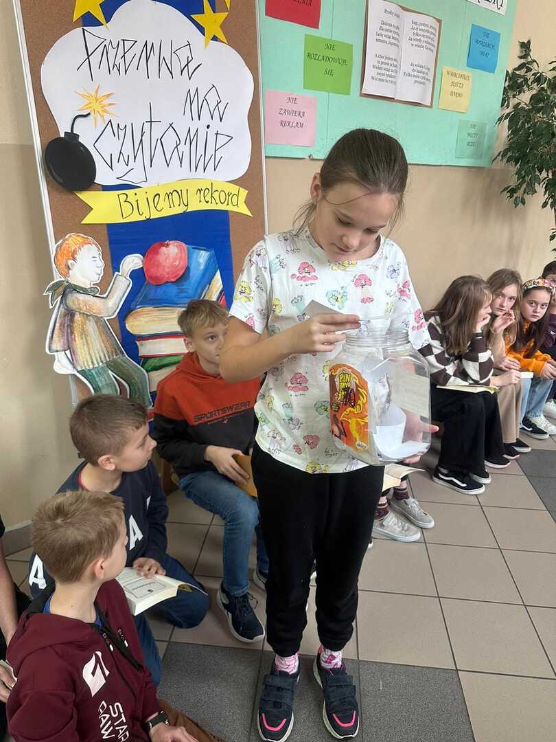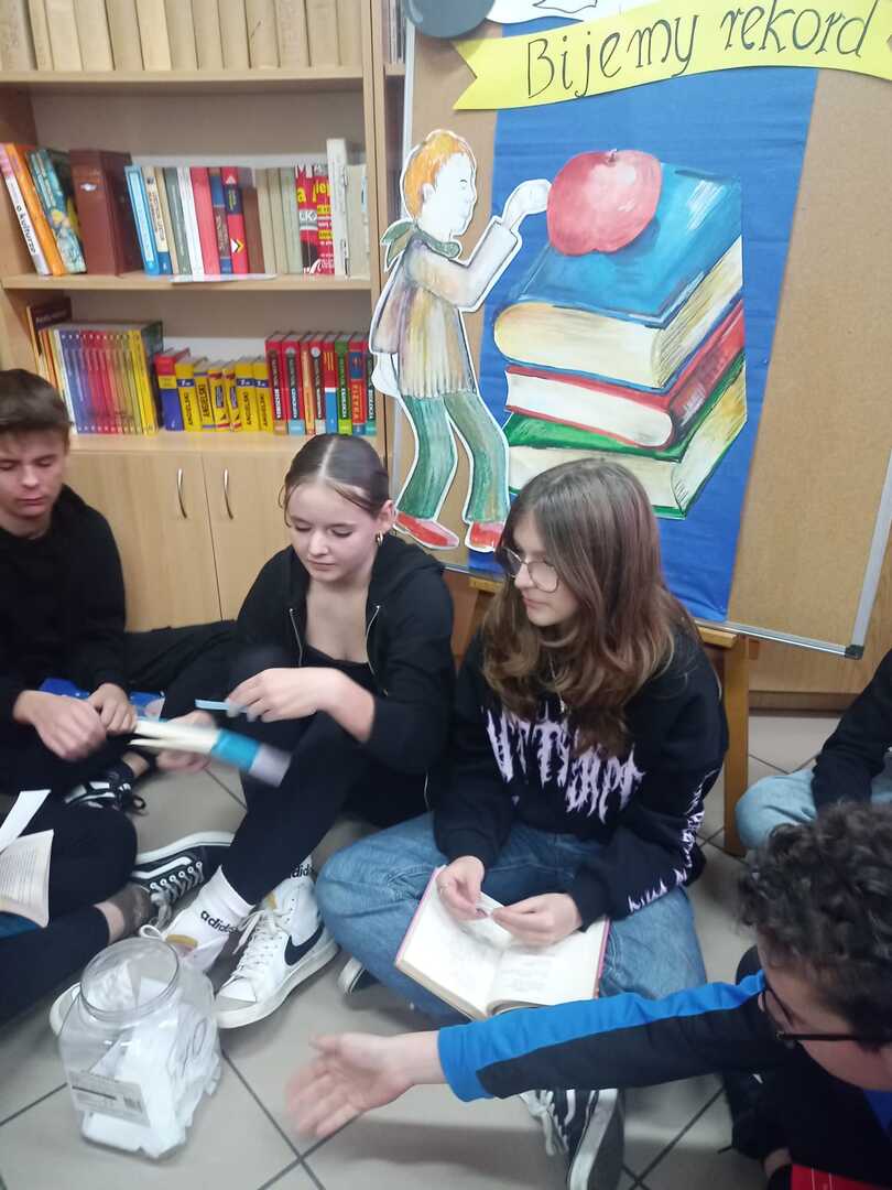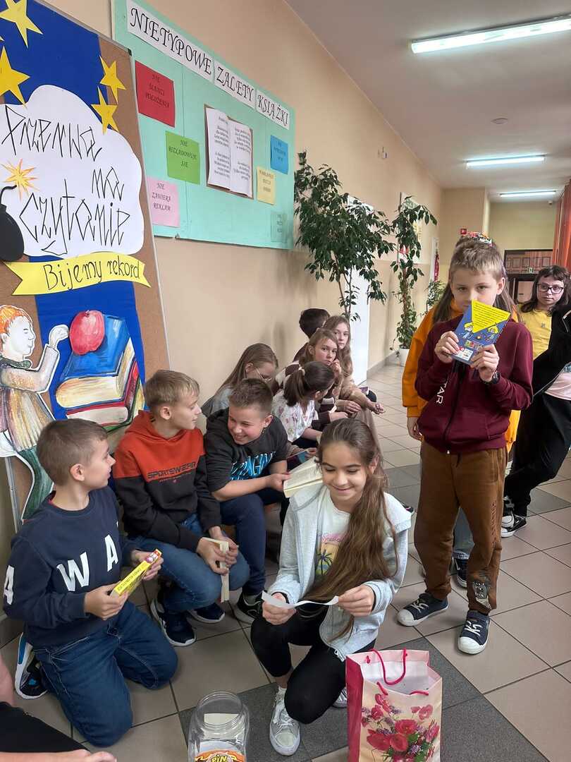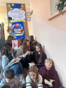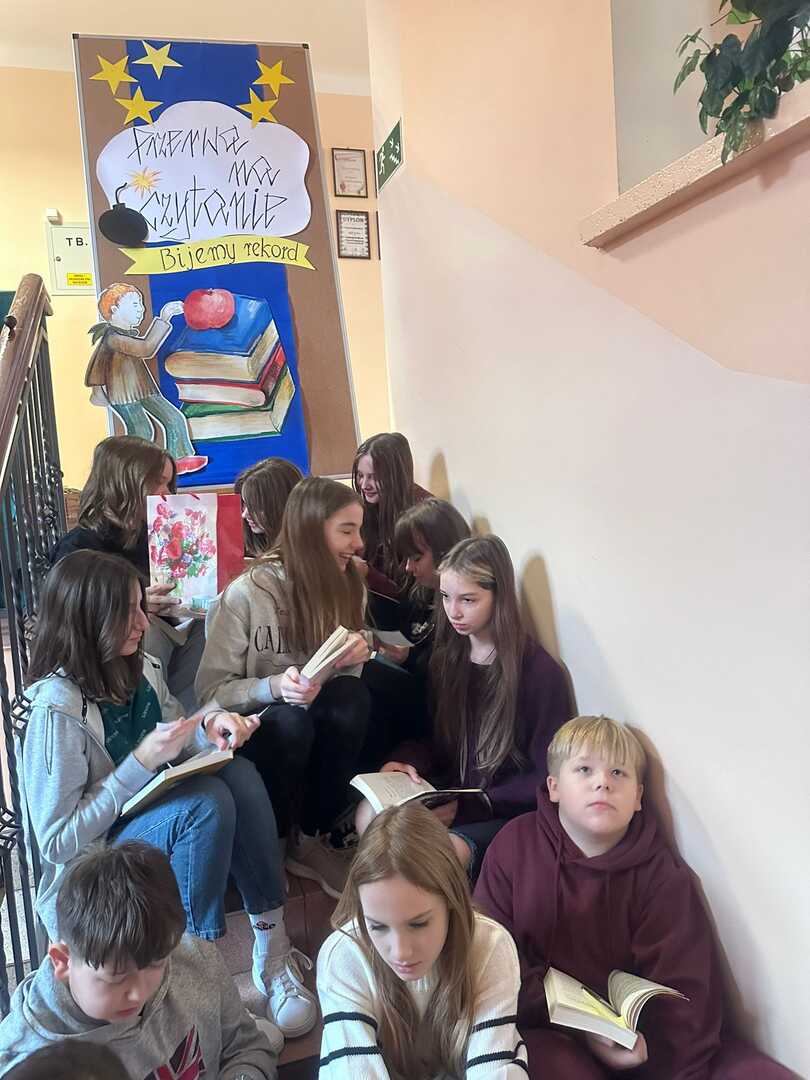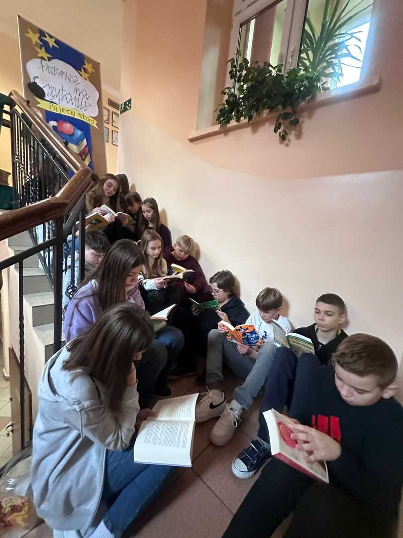 Uczniowie czytali przyniesione przez siebie lub wypożyczone z biblioteki szkolnej książki. Miejsce do czytania klasy wybierały same. Niektórzy byli tak zaczytani, że nie zauważyli, że przerwa dobiegła końca. Atrakcją ,, Przerwy na czytanie’’ był mini konkurs ze znajomości lektury. Uczniowie losowali i odpowiadali na pytania nawiązujące co tytułów przeczytanych książek. Na uczniów , którzy znali odpowiedzi  czekał słodki upominek.
