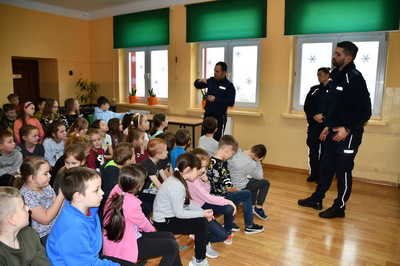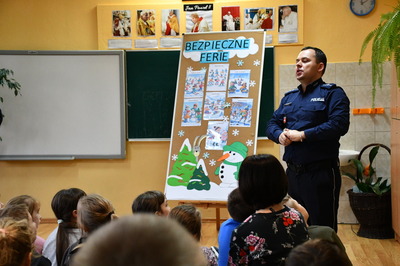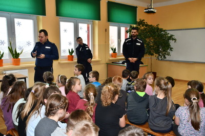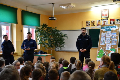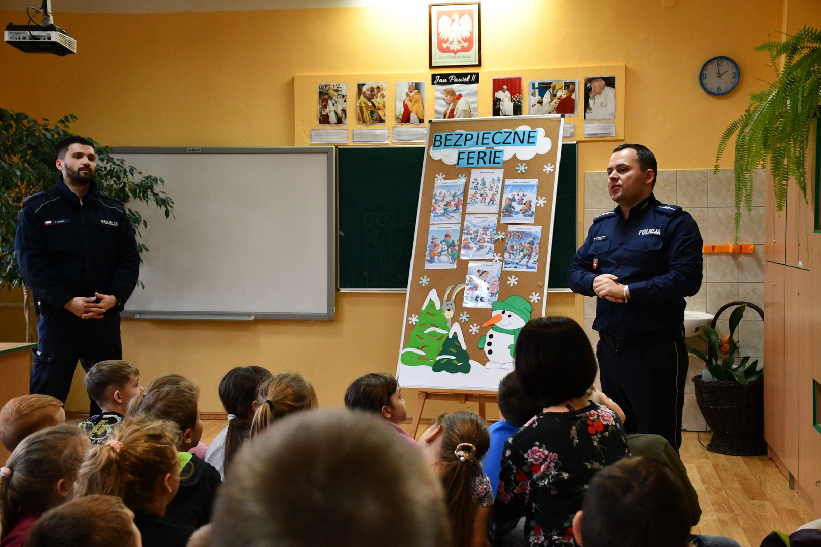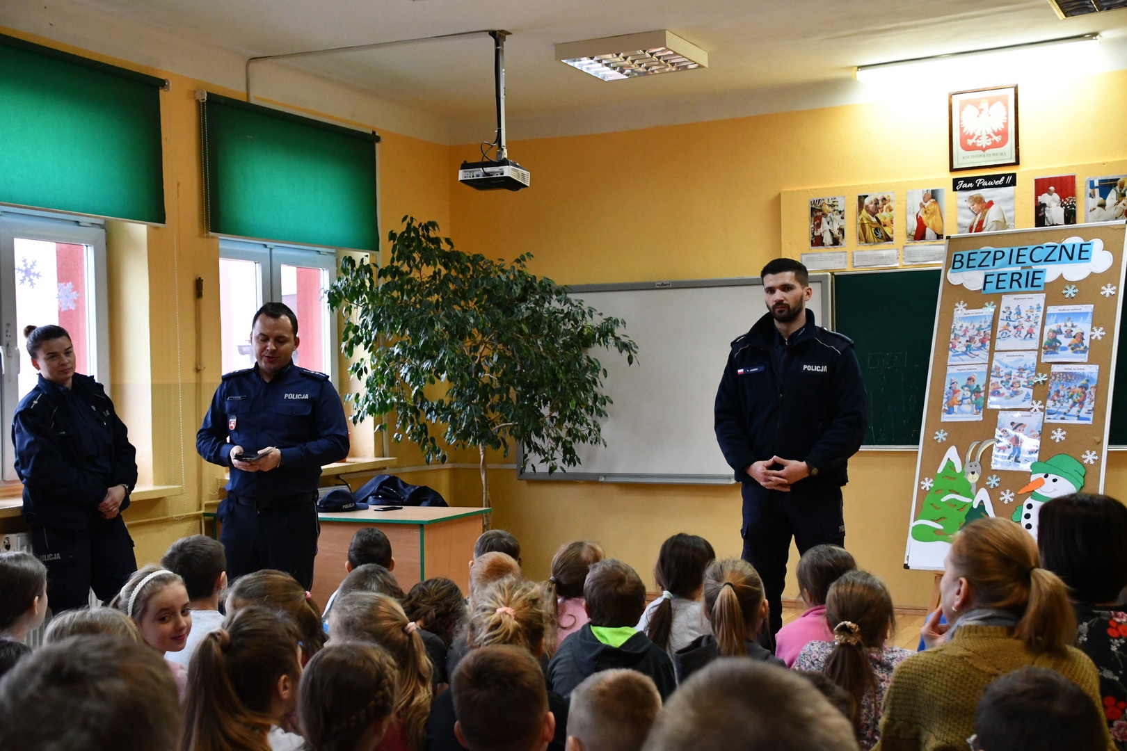 22 stycznia w ramach akcji ,,Bezpieczne ferie” dzielnicowi z naszego komisariatu rozmawiali z uczniami na temat bezpieczeństwa podczas zimowego odpoczynku. Głównym celem spotkania była edukacja uczniów dotycząca spędzania czasu wolnego w taki sposób, aby uniknąć wszelkich zagrożeń. Rozmawiano także o tym, w jaki sposób i kiedy należy korzystać z numerów alarmowych, a także przedstawiono w jaki sposób działają elementy odblaskowe i jak ważne jest ich posiadanie na odzieży wierzchniej. Mundurowi przypomnieli o zachowaniu zasad bezpieczeństwa podczas zabaw zimowych, podkreślając jak istotną rolę dla bezpieczeństwa odgrywa kask ochronny podczas zjazdów na nartach.