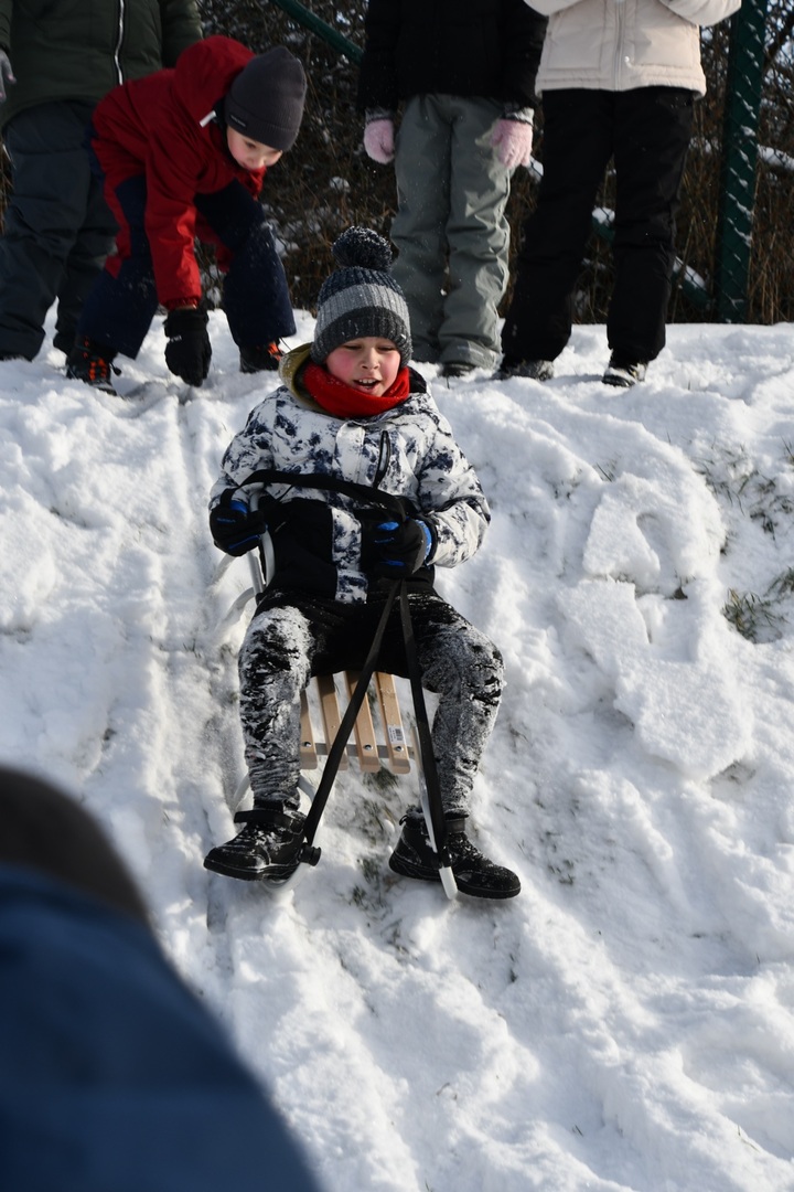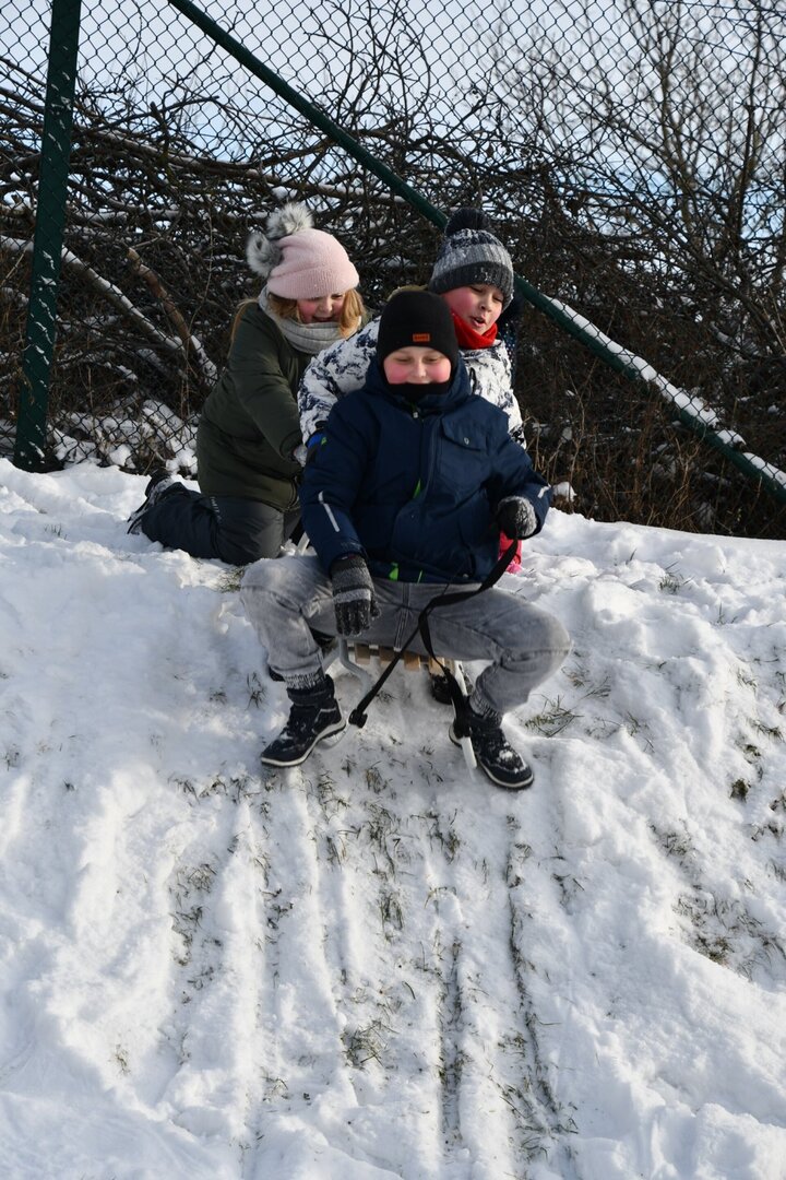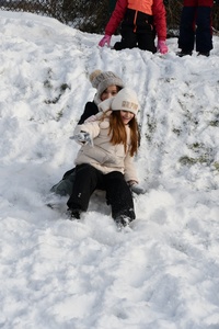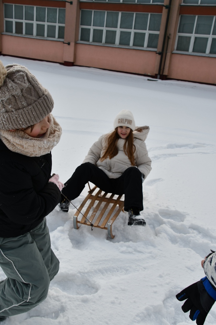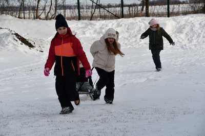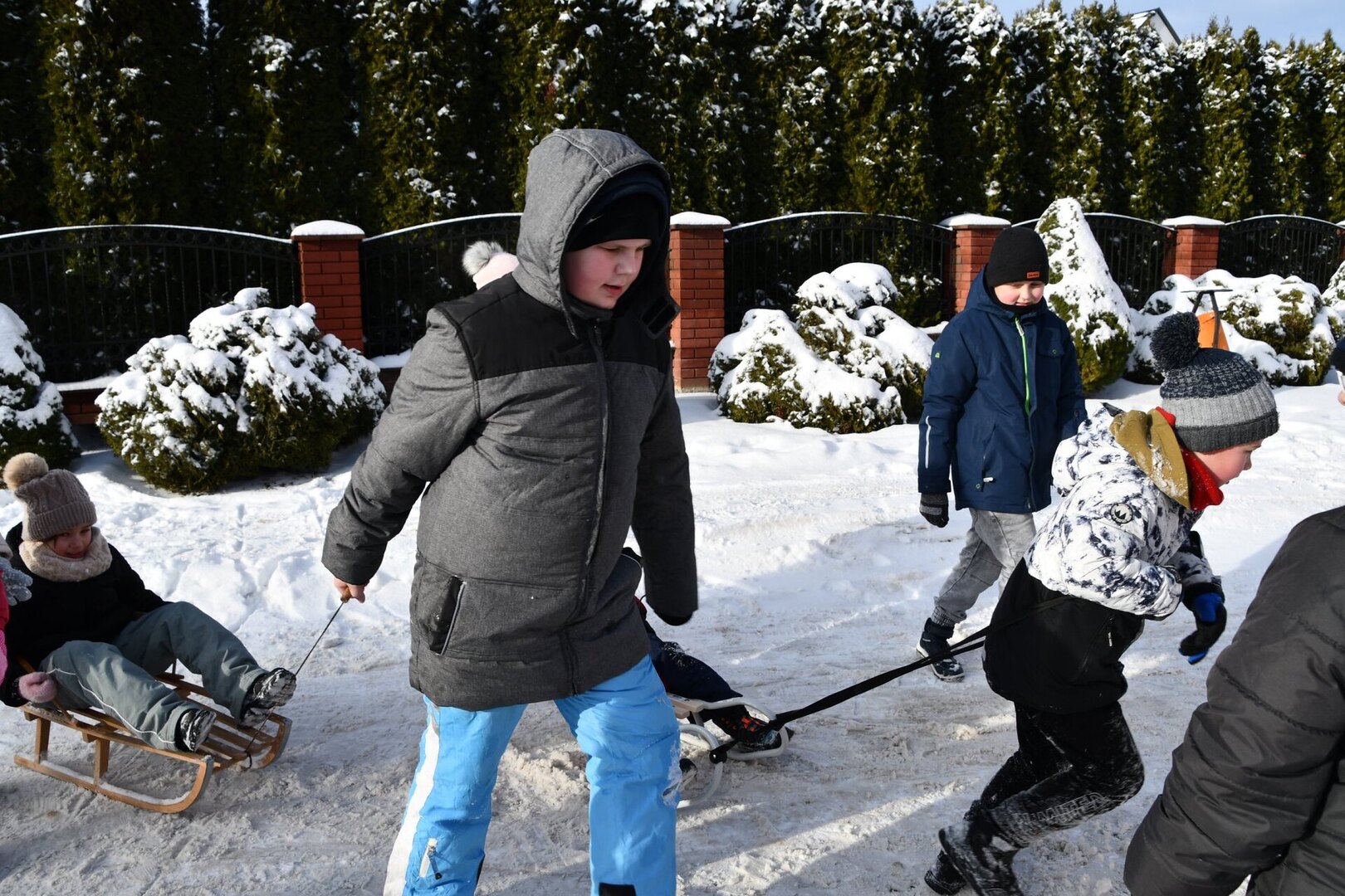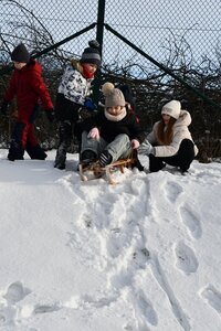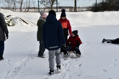 Korzystamy z uroków zimy! Klasa III wraz z wychowawczynią wybrała się na zimowy spacer.Były przygotowane sanki, więc robiliśmy zaprzęgi. Miękki i puszysty śnieg zachęcał do przewracanek. Powstawały piękne ,,orły" i ,,kwiatki". Nie zrezygnowaliśmy też z bezpiecznego lodu. Odbyła się nauka ślizgania na butach w różnych wariantach i pozach.Mróz pięknie pokolorował na rumiano nasze policzki, a piękne i dawno nie widziane słońce pomogło w produkcji witaminy D3 i endorfin. Wróciliśmy zmęczeni , ale zadowoleni.
