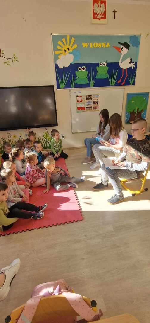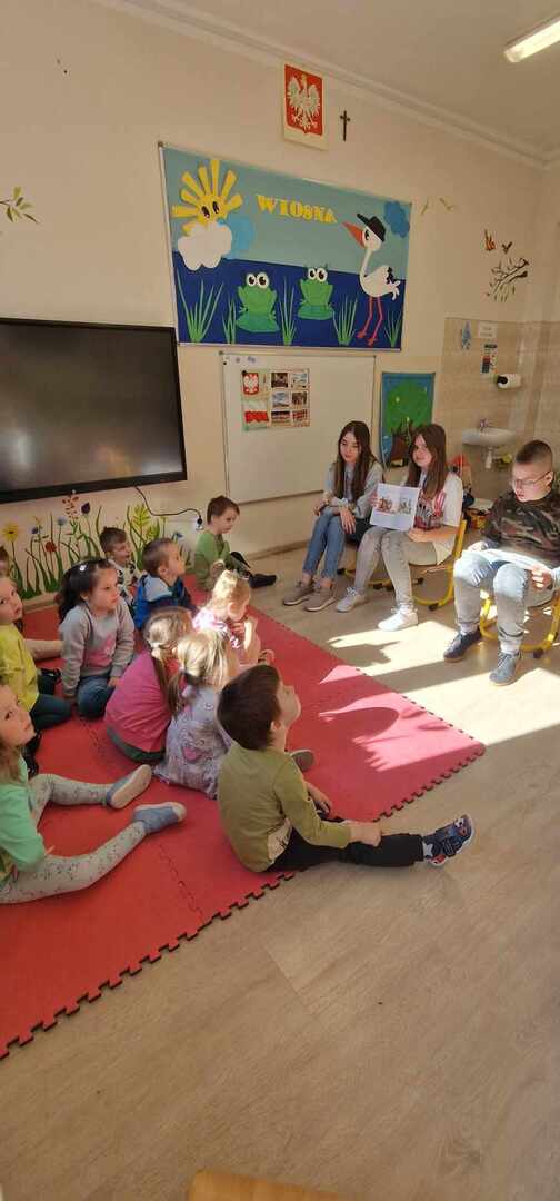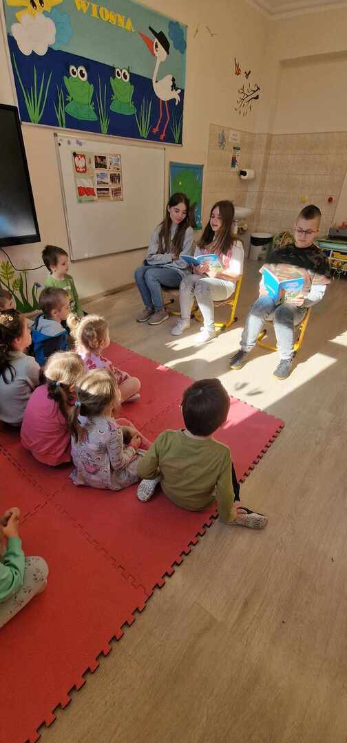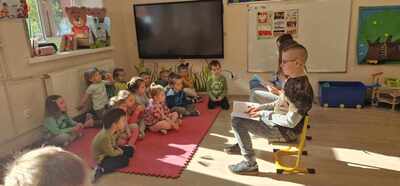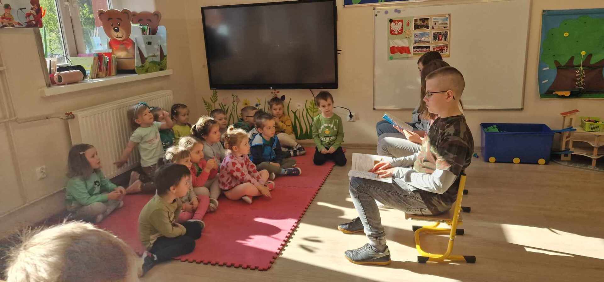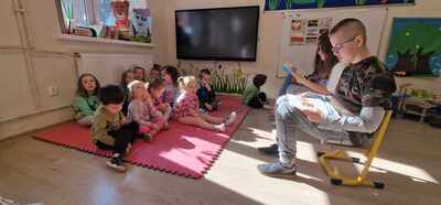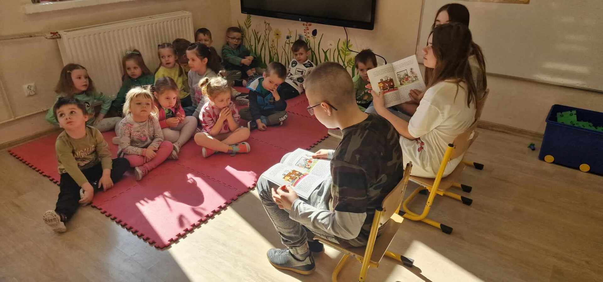 Uczniowie klasy szóstej z racji Światowego Dnia Książki odwiedzili dziś najmłodszych przedszkolaków. Robią to chętnie, bo maluchów nie da się nie lubić, ale i cel ich wizyty jest szczytny – akcja nazywa się ,,Starsi czytają młodszym’’. Szóstoklasiści przeczytali młodszym kolegom i koleżankom jedną z wielu książek zakupionych do biblioteki szkolnej w ramach Narodowego Programu Rozwoju Czytelnictwa autorstwa Waldemara Cichonia
