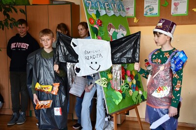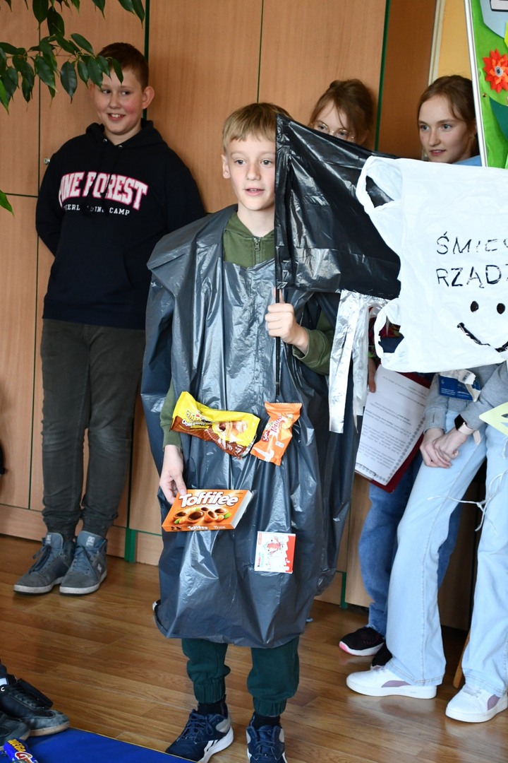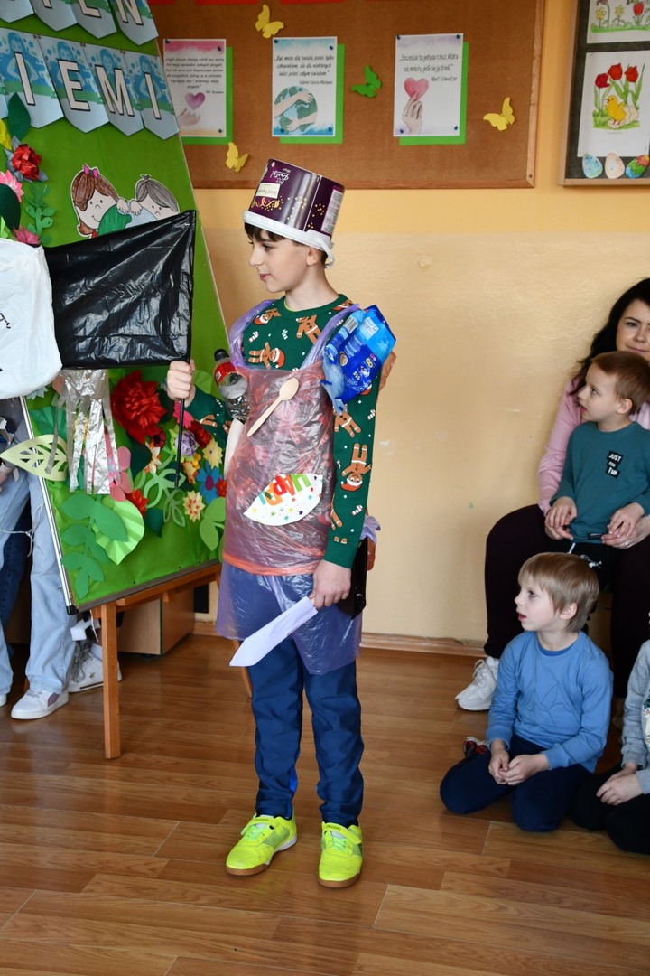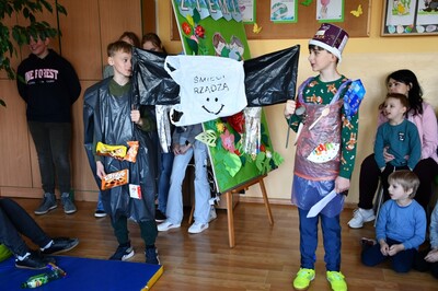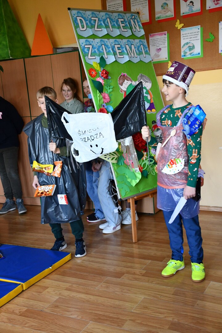 Dzień Ziemi to najważniejsze święto ekologiczne, zatem w naszej szkole nie mogło zabraknąć uroczystej akademii skierowanej do najmłodszej części naszej szkolnej społeczności. W inscenizacji pt. "Ocean śmieci" uczniowie zwrócili uwagę na problem ogromnego  tempa globalnej emisji plastiku do środowiska, co może wywołać skutki, których nie będziemy w stanie odwrócić. Plastik nie tylko zaśmieca wybrzeża, ale też szkodzi zwierzętom morskim, które zaplątują się w większe odpady, a mniejsze mylą z pożywieniem.
