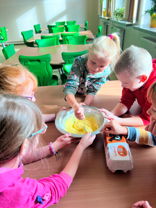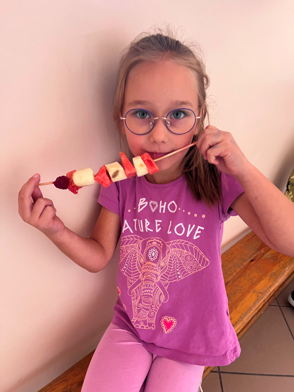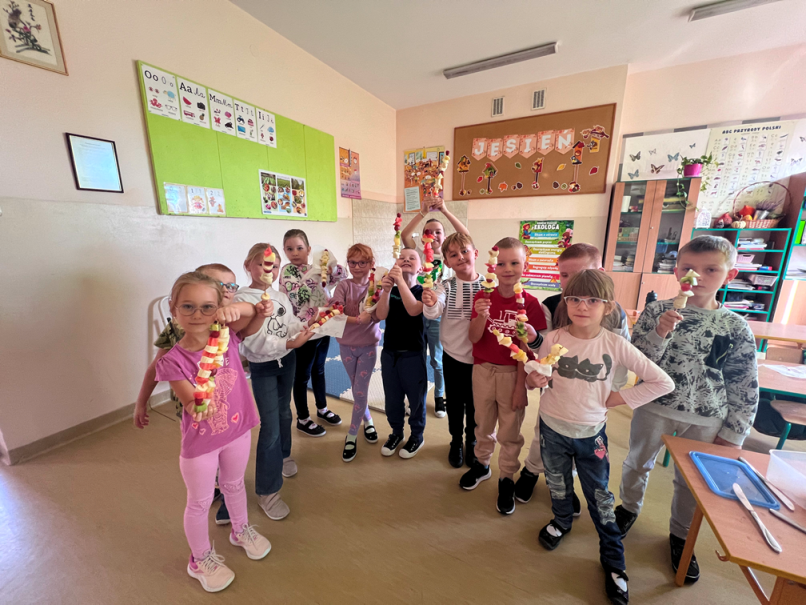 „Żeby zdrowie mieć należy owoce i warzywa jeść!” Juz na początkowym etapie edukacji w przedszkolu dzieci uczą się jak dbać o zdrowe odżywianie. W kl. I-III uczniowe samodzielnie przygotowywali sok, szaszłyki owocowe, piekli babeczki z jabłkami, robili sałatkę owocową i kanapki;