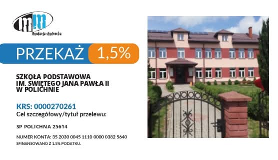 Zwracamy się do Was z serdeczną prośbą o wsparcie naszej placówki poprzez przekazanie 1,5% podatku dochodowego. To dla Was niewiele, a dla nas ogromna szansa na rozwój i lepsze warunki dla naszych uczniów.