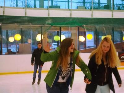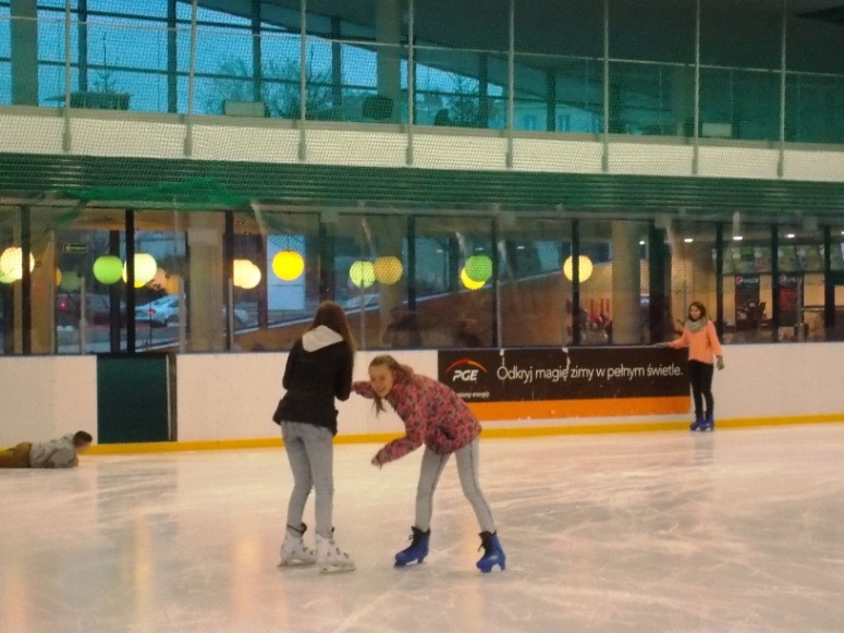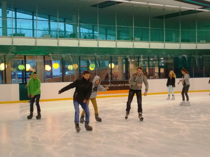 Po filmie zadowoleni, z uśmiechem na twarzach, pojechaliśmy na lodowisko. 13 osób zrezygnowało z jazdy dla własnego bezpieczeństwa - z powodu braku umiejętności jazdy na łyżwach. Reszta świetnie się bawiła, ale oczywiście nie obyło się bez małych, niegroźnych upadków.