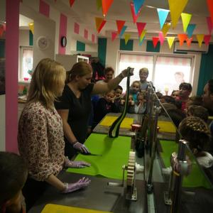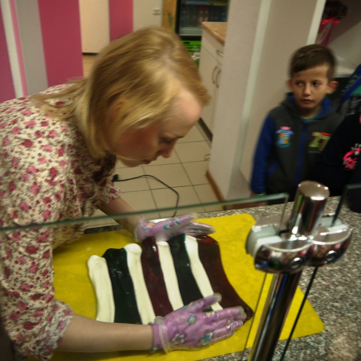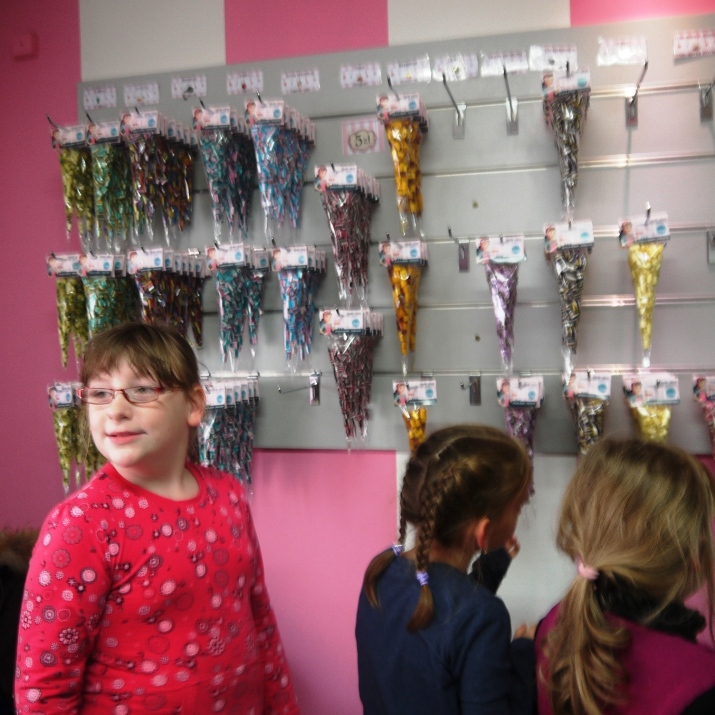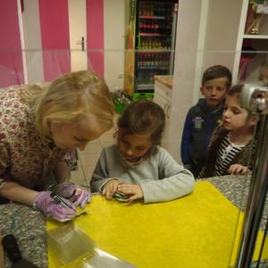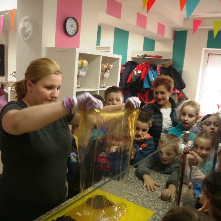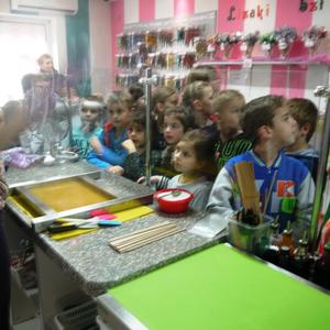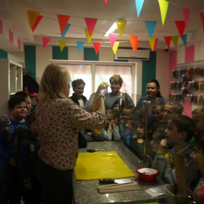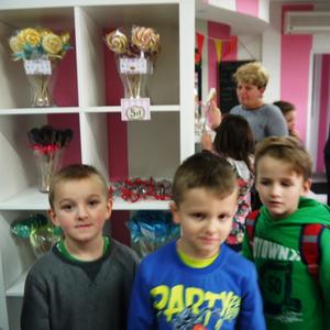 Kolejną atrakcją wyjazdu była wizyta w McDonalds. Smaczny posiłek dodał nam sił i sprawił, że z wielką ochotą pojechaliśmy do najmniejszej w Lublinie fabryki słodyczy Cukier- Lukier, aby zobaczyć jak powstają cukierki. W cukierkowni dzieci miały możliwość obejrzenia jak przygotowuje się produkty do wyrobu lizaków i cukierków. Wszystkie chętnie wykonały własne, wielobarwne lizaki.