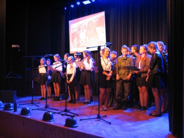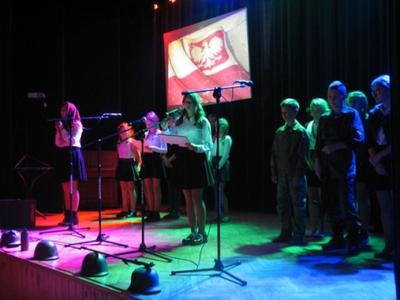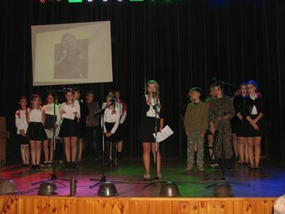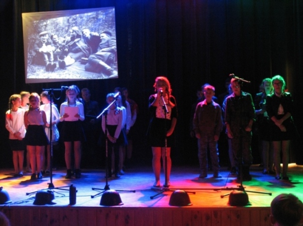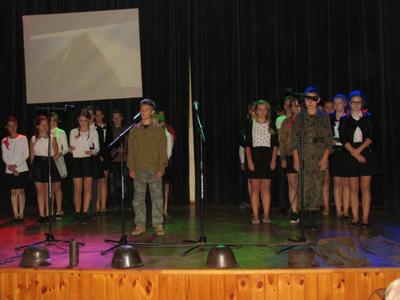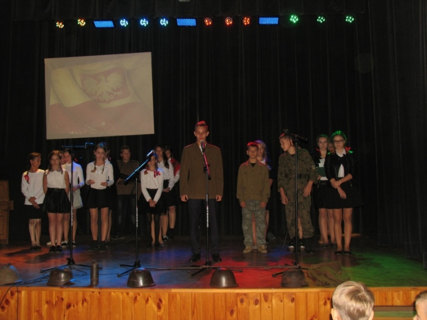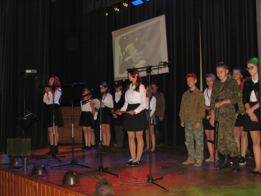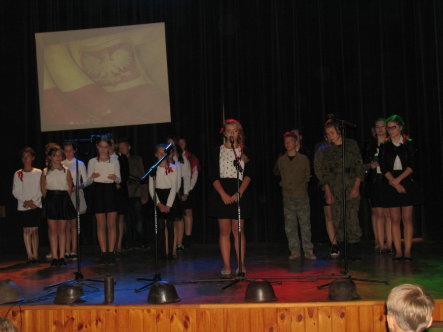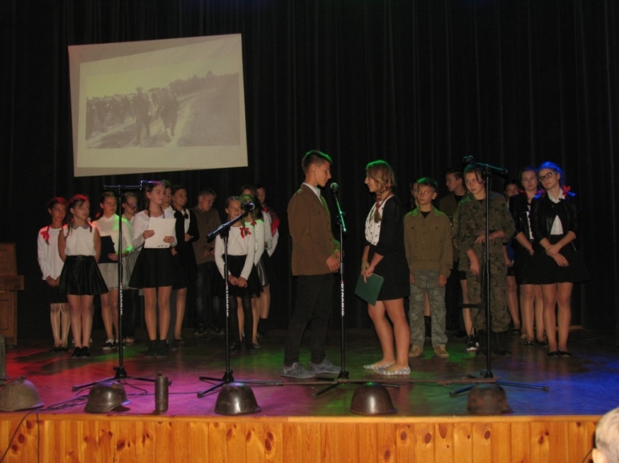 Spektakl rozpoczynała melorecytacja Huberta Wcisło ucznia klasy VI pt. „Pieśń kronika”, pierwotnie wykonywanej przez Marka Grechutę. Następnie wystąpił Michał Galek jako żołnierz, który musi iść na wojnę, zostawić swoją dziewczynę i matkę, którą zapewnia, że wróci do domu cały i zdrów. Inny żołnierz Adrian Serafin obiecuje, że będzie pisał listy do swej dziewczyny a ta z kolei obiecuje, że będzie na niego czekać, czemu daje wyraz w piosence „Doliny doliny” uczennica klasy III Dominika Kosidło. Kolejnym utworem wykonywanym przez uczniów była piękna pieśń pt. „Ziemio nasza ziemio”. W tle tej jak i innych piosenek przedstawiono prezentację oraz filmy ukazujące okrucieństwo wojny. Wzruszającym utworem poświęconym poległym żołnierzom była piosenka „Nie zobaczysz matko syna” - wykonała ją uczennica klasy II Anna Galek. Dwa Ostatnie utwory były już bardziej optymistyczne, pierwszy z nich mówił o radości prostych żołnierzy, którzy przeżyli wojnę. Wykonywali go wcześniej wspominani uczniowie oraz Julka Król, Gabrysia Wnuk, Patrycja Lewandowska oraz Karol Kasperek. Na zakończenie wszyscy występujący odśpiewali pieśń „Zagrajcie nam dzisiaj srebrne dzwony” mówiącą o zwycięstwie nad wrogiem i o tym, że największą radością dla żołnierza jest powrót do domu rodzinnego.