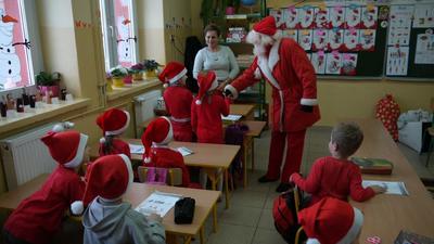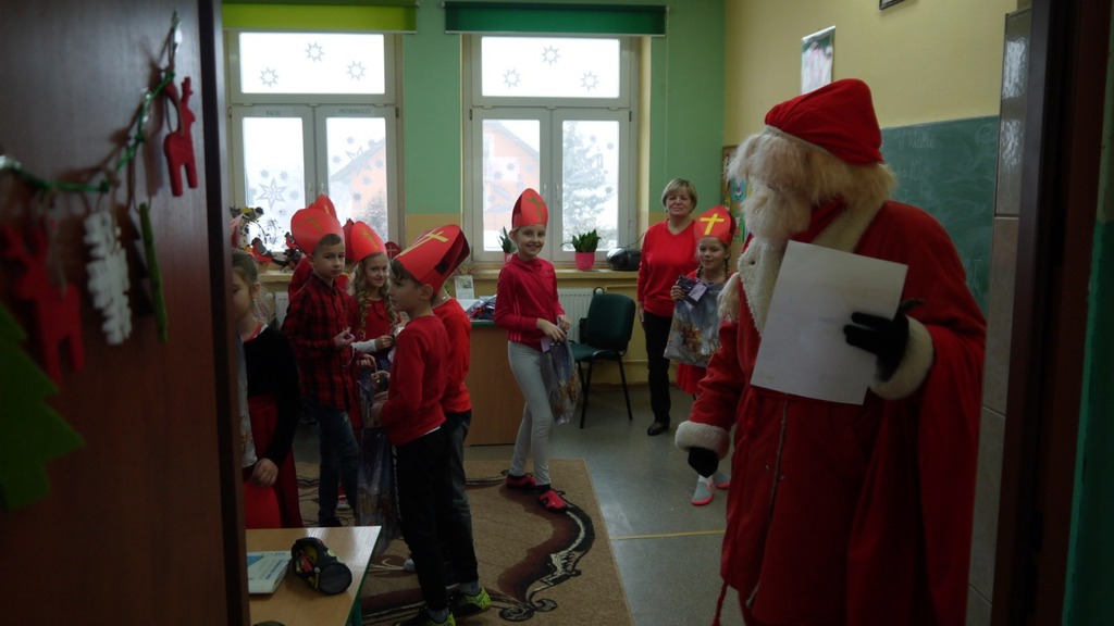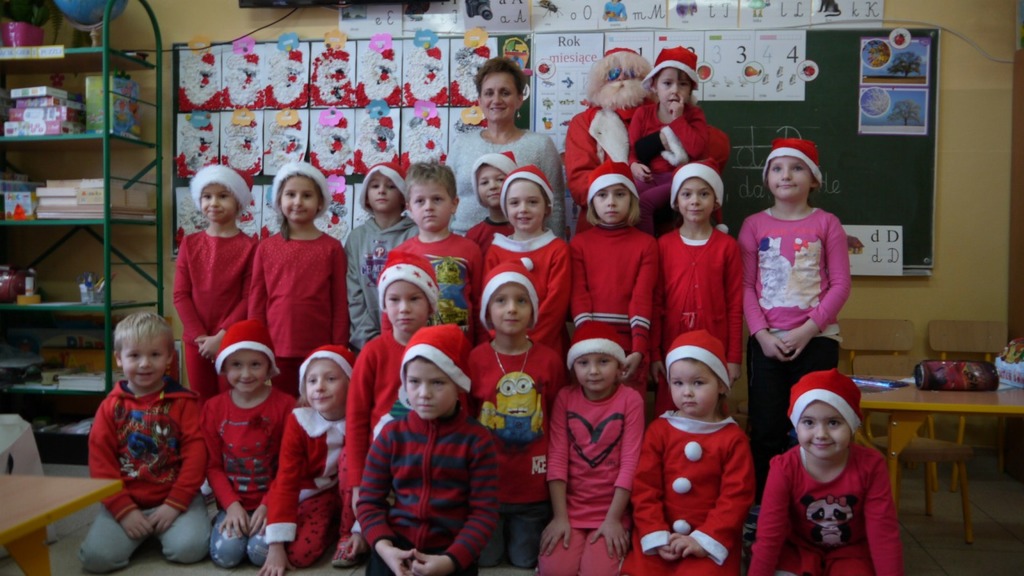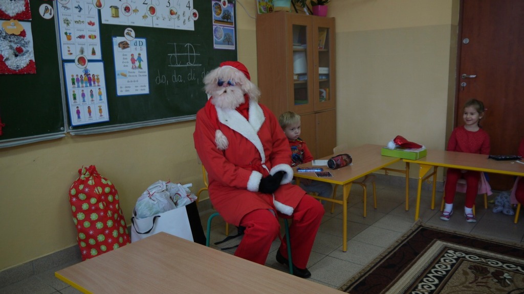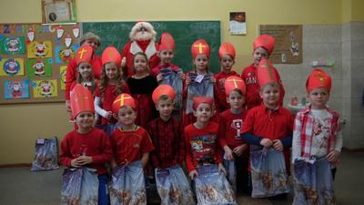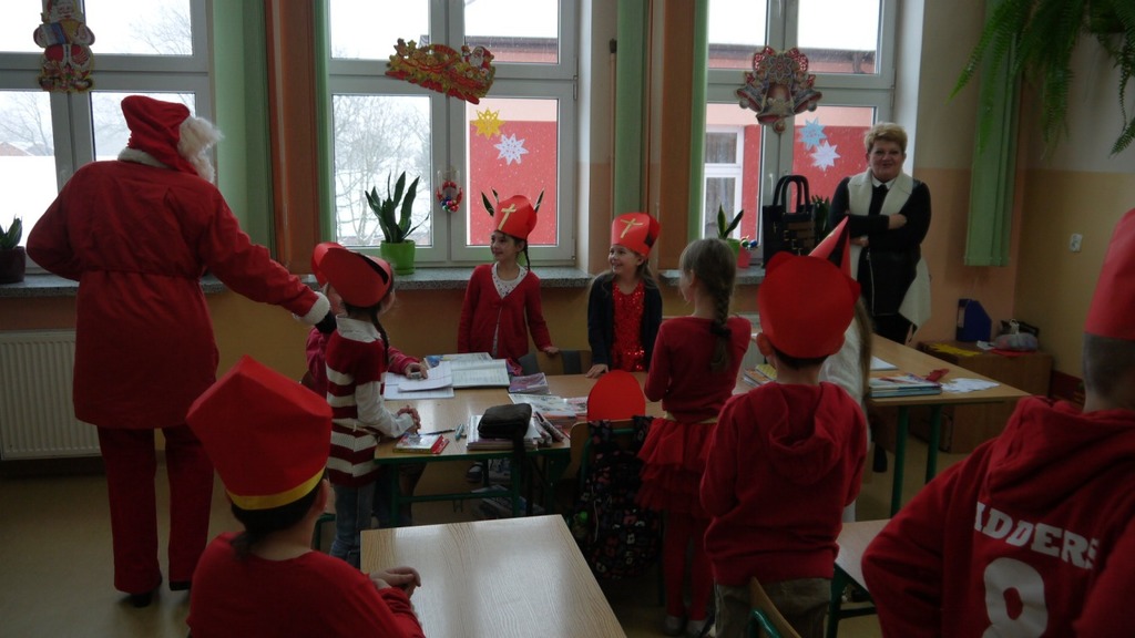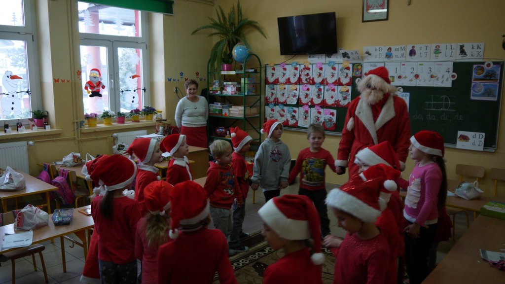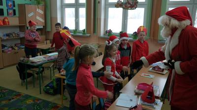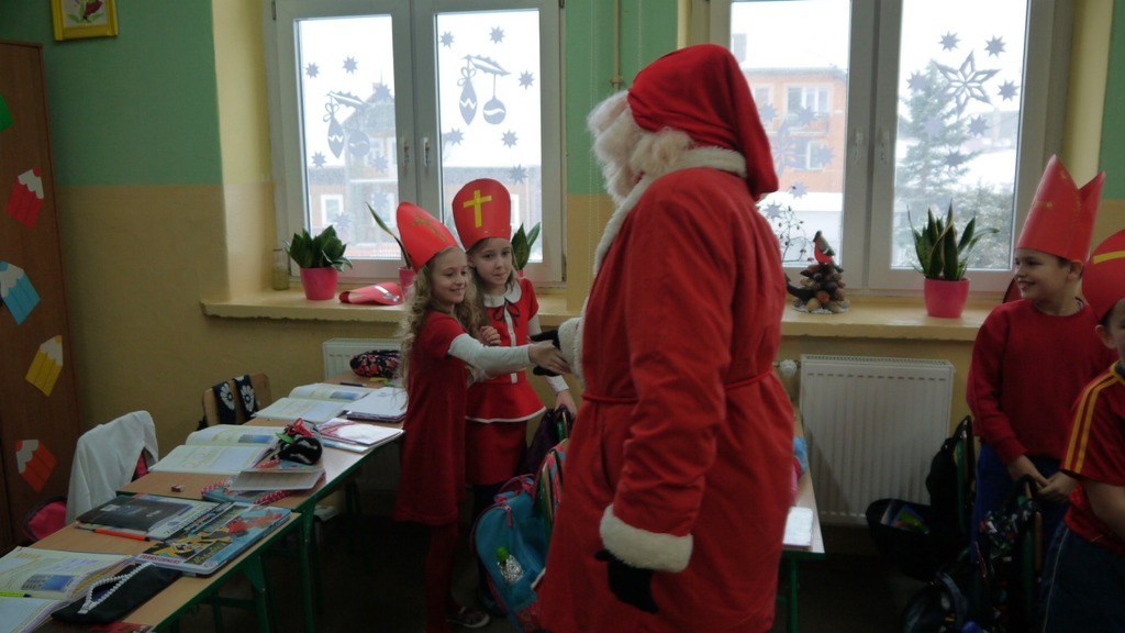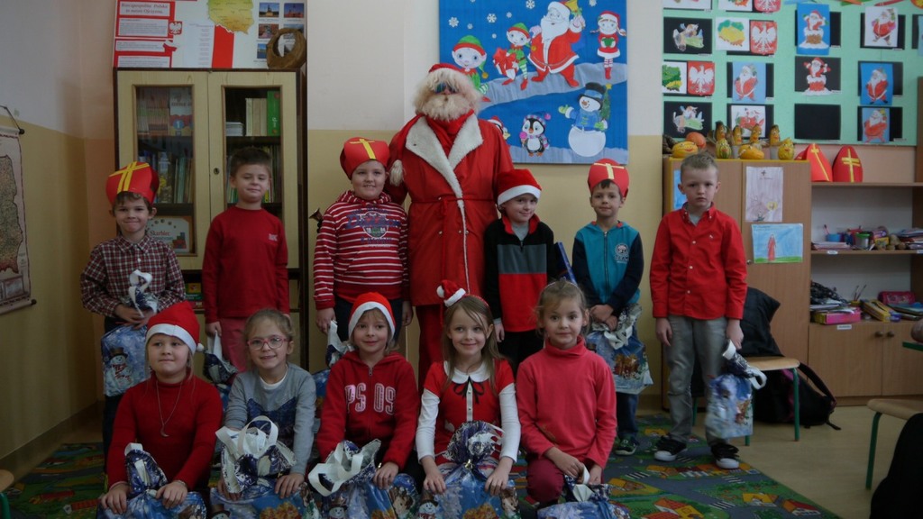 To fragment piosenki, którą dzieci powitały Mikołaja. Niecierpliwie wyczekiwany przez wszystkich gość odwiedził naszą szkołę we wtorek w godzinach przedpołudniowych. Dźwięk dzwonka i widok Mikołaja z workiem pełnym prezentów wywołał u uczniów dużo uśmiechu. W każdej z klas, którą odwiedził, gość miał możliwość porozmawiać z dziećmi na różne tematy i wysłuchać wielu wierszy, piosenek. Były też pamiątkowe zdjęcia. Mikołaj z radością rozdał prezenty, a dzieci, dziękując zaprosiły go za rok. Obiecały, że będą czekały i postarają się być grzeczne