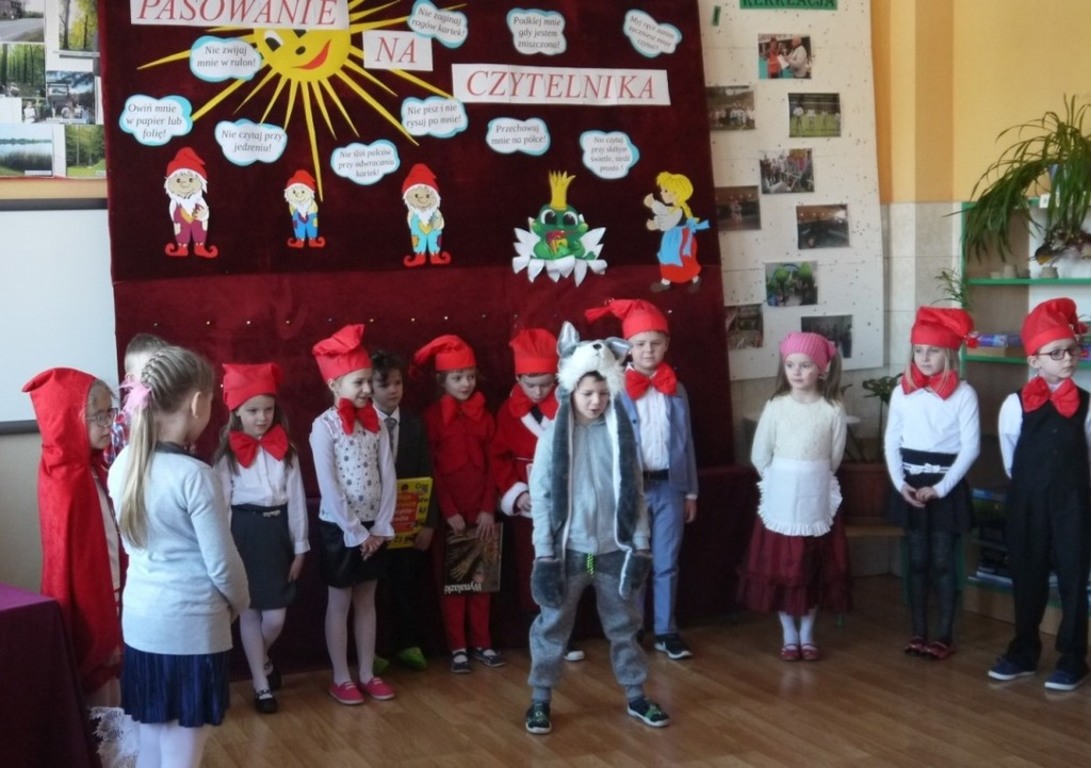 Pani dyrektor w swoim krótkim wystąpieniu zachęcała pierwszaków do czytania. Podczas pierwszej części uroczystości dzieci przedstawiły krótką inscenizację, w której przeniosły wszystkich w zaczarowany świat małych strażników szkolnej biblioteki – Krasnali. Mogły w niej pochwalić się swoją wiedzą na temat poszanowania książek oraz znajomości zasad korzystania ze zbiorów biblioteki. Na zakończenie nowi czytelnicy złożyli przyrzeczenie, że będą kochać i szanować książki. Potem wszyscy zostali pasowani na Czytelników.