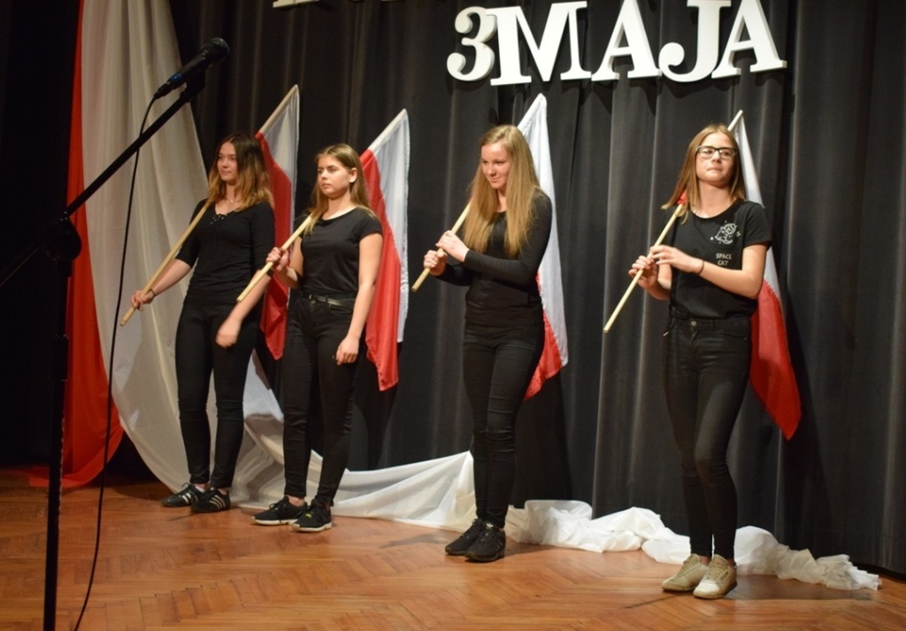 O godzinie 11.30 rozpoczęło się przedstawienie. Po krótkim przywitaniu pani dyrektor Ewy Białoń wystąpił narrator Laura Lodowska, nakreśliła ona widzom w jakiej sytuacji znajdowała się Polska w drugiej połowie XVIII wieku. Następnie dziewczynki zatańczyły tzw. "belgijkę". Po tańcu przyszedł czas na występ "szlachty"- chłopców, którzy zaśpiewali piosenkę o beztroskim życiu sarmaty na melodie popularnego utworu "Bałkanica". W kolejnym punkcie spektaklu zaprezentowano scenkę ze spotkania carycy Katarzyny (Samanta Machulak) z królem Stanisławem Augustem Poniatowskim (Hubert Wcisło). Następnym utworem wykonywanym przez "sarmatów" była "Pieśń Konfederatów Barskich". Po niej przyszedł czas na występ gimnazjalistów Izy Wiśniewskiej i Michała Galka, którzy w piosence pt. "Sacrum" mogli dać popis swoim umiejętnościom wokalnym. Nietypowym utworem zaprezentowanym przez Dominikę Kosidło z udziałem wszystkich uczestników spektaklu był utwór "Lina". Mówił on o jedności i o wspólnym budowaniu szczęścia. Naród Polski porównano tu do silnej liny, która składa się z cienkich nici a tymi nićmi są właśnie Polacy. Następnie wystąpiła Anna Galek w angielskojęzycznym utworze "Ain't No Sunshine". W tle uczennice zaprezentowały taniec z flagami. Na koniec wszyscy zaśpiewali piosenkę o mocnym rockowym brzmieniu z repertuaru zespołu Luxtorpeda "Wiara siła męstwo to nasze zwycięstwo", tu również uczennice klasy III zaprezentowały taniec z flagami.
