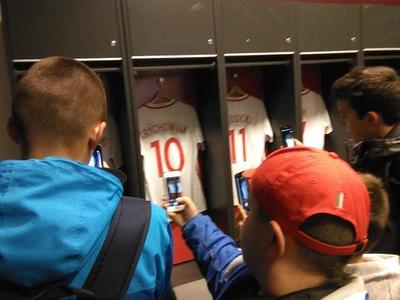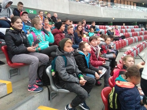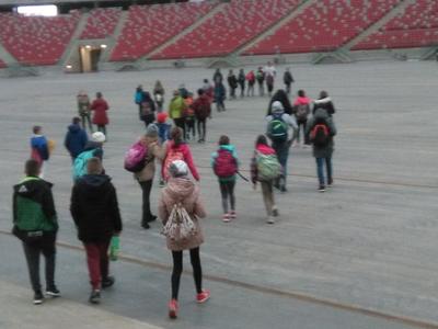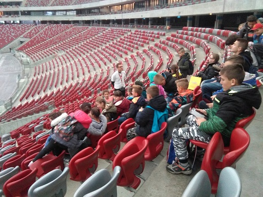 Pierwszym punktem programu była wizyta na Stadionie Narodowym. Obok płyty stadionu i trybun uczestnicy mieli możliwość obejrzenia także pomieszczeń i urządzeń przeznaczonych jedynie dla sportowców i trenerów: szatnie, sale odpraw i masaży, pomieszczenie, gdzie odbywają się konferencje prasowe. Największym zainteresowaniem, zwłaszcza chłopców, cieszyły się szatnie, gdzie mogli obejrzeć koszulki, w których reprezentanci Polski rozgrywają swoje mecze.