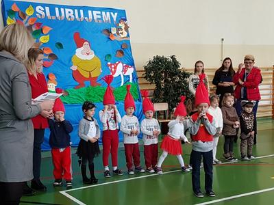 Przed zaproszonymi gośćmi pochwaliły się pięknie recytowanymi wierszami i wesołymi piosenkam i- oczywiście o przedszkolu. Były też popisy taneczne. Wreszcie nadszedł moment ślubowania. Dzieci ślubowały, że będą wzorowymi przedszkolakami, będą grzecznie się bawiły i pilnie uczyły. Po obejrzeniu występów i wysłuchaniu ślubowania pani dyrektor Jadwiga Spryszak wielkim, czarodziejskim ołówkiem pasowała każdego przedszkolaka.