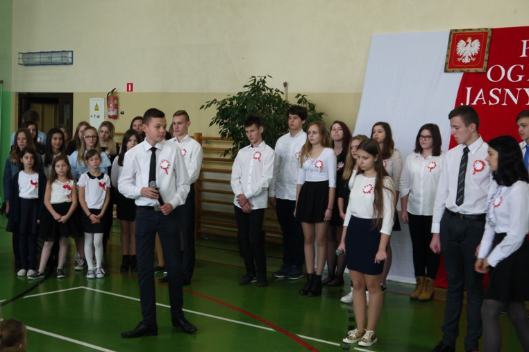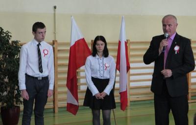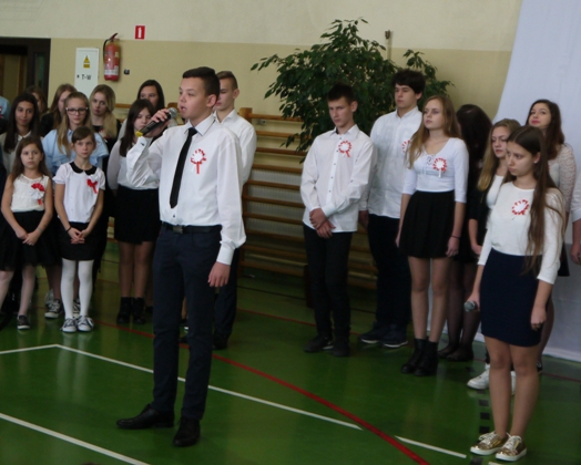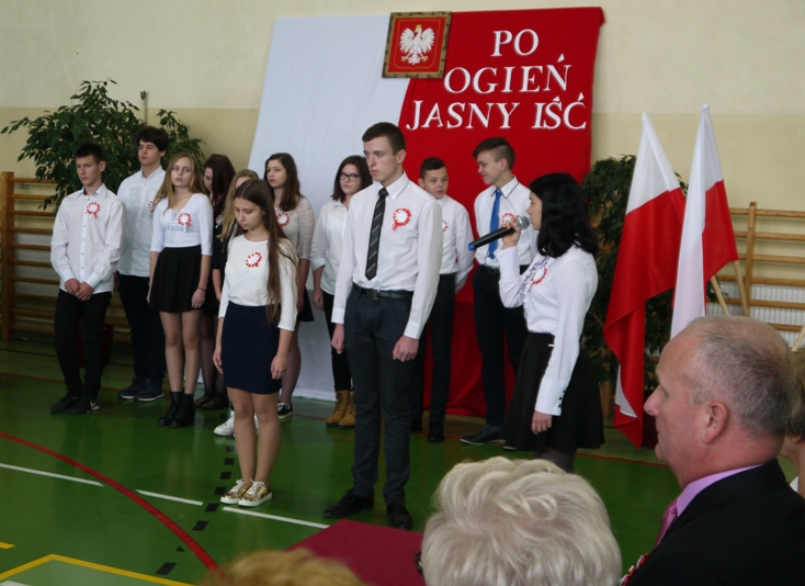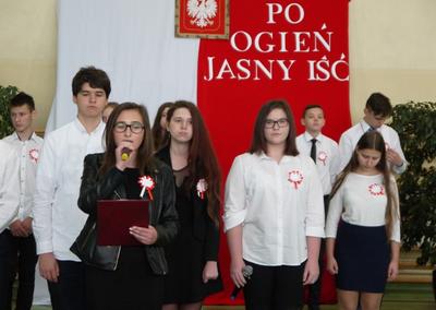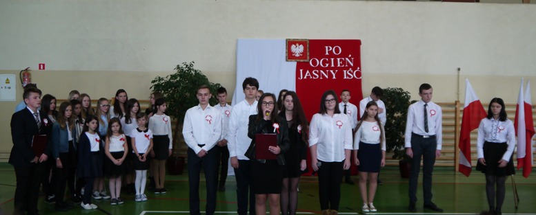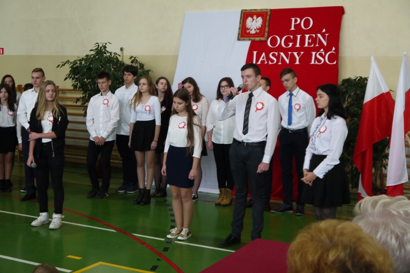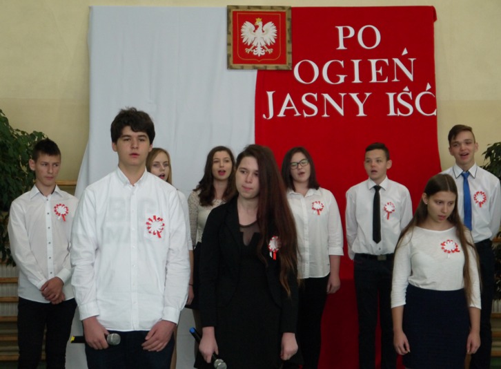 Po Ogień Jasny Iść… pod tym hasłem młodzież klasy III gimnazjum pod kierunkiem nauczycielki historii Małgorzaty Żaby oraz nauczycielki muzyki Pani Marii Olszówki wystawiła akademię, którą wypełniła piękna poezja oraz pieśń patriotyczna.