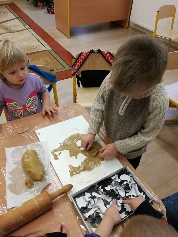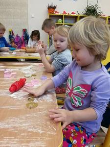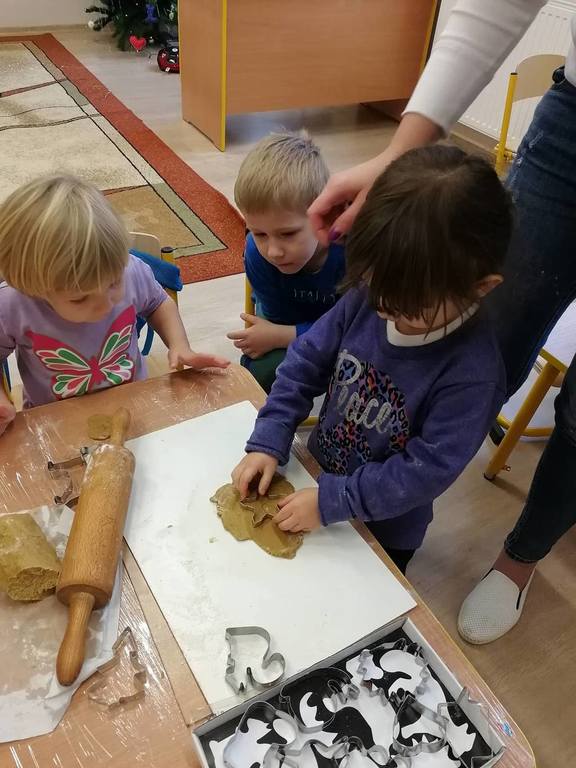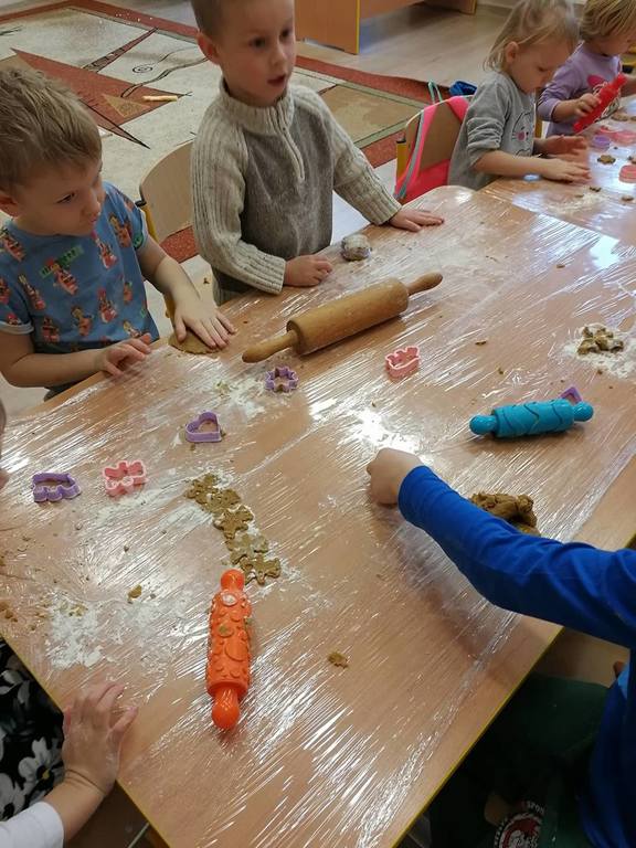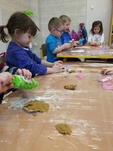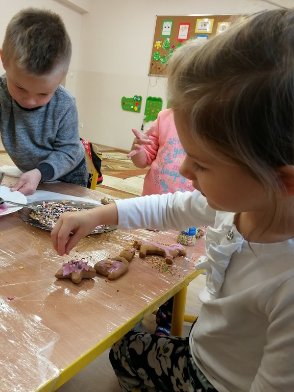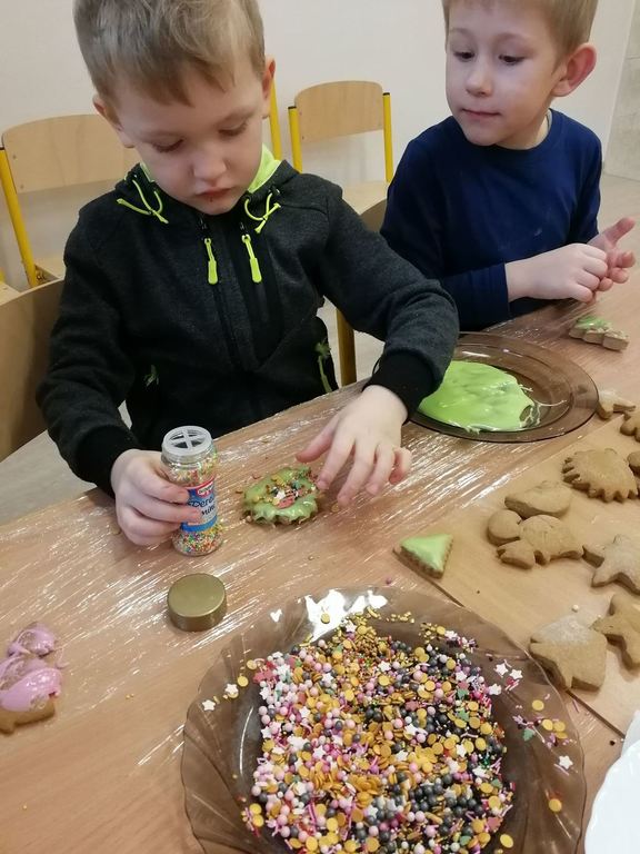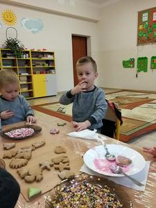 18 grudnia w naszym przedszkolu unosił się zapach korzennych przypraw. Przed Świętami Bożego Narodzenia jest to doskonały czas na pieczenie pierniczków. Do pracy dzieci odpowiednio się przygotowały: zadbały o czyste rączki, poznały potrzebne składniki oraz sposób wykonania ciasta. Gdy wszystko było gotowe, przedszkolaki z ogromnym zaangażowaniem zabrały się do pracy- z pomocą swojej pani gniotły i wałkowały ciasto a następnie wykrawały ciasteczka przy użyciu różnych foremek. Na koniec blaszki pełne pierniczków "powędrowały" do kuchni, gdzie pod okiem pań kucharek ciasteczka nabrały koloru piekąc się w piekarniku. Następnego dnia dzieci zabrały się za lukrowanie i dekorowanie pierników, w efekcie czego ciastka nie tylko wspaniale pachniały, ale też pięknie wyglądały.