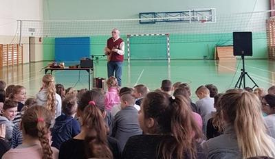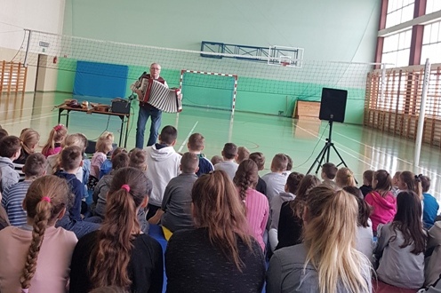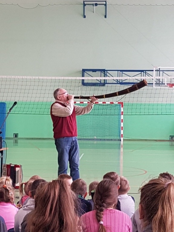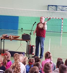 13 lutego naszą szkołę odwiedził pan Roman Brochocki - poeta, muzyk, można by powiedzieć człowiek orkiestra. Wystąpił z krótkim programem artystycznym" Różne instrumenty świata", podczas którego zaprezentował budowę oraz pokaz gry na wielu instrumentach muzycznych. Były to min. akordeon, harmonijka ustna, okaryna, ligawka, trąbka, bałałajka czy fletnia Pana. Podczas spotkania dzieci i młodzież dowiedzieli się wielu ciekawostek nt. pochodzenia i przeznaczenia niektórych instrumentów. Serdecznie dziękujemy za barwne opowieści i piękną muzykę.
