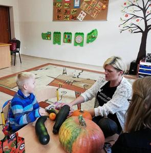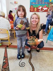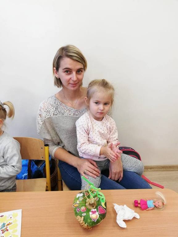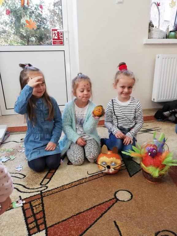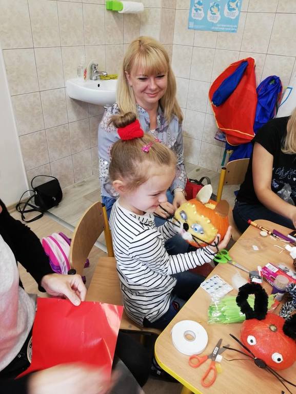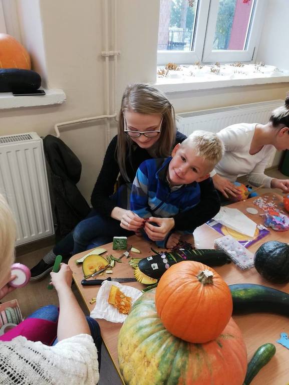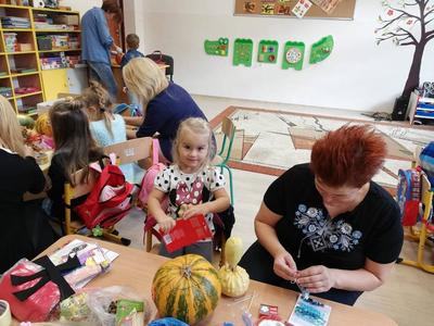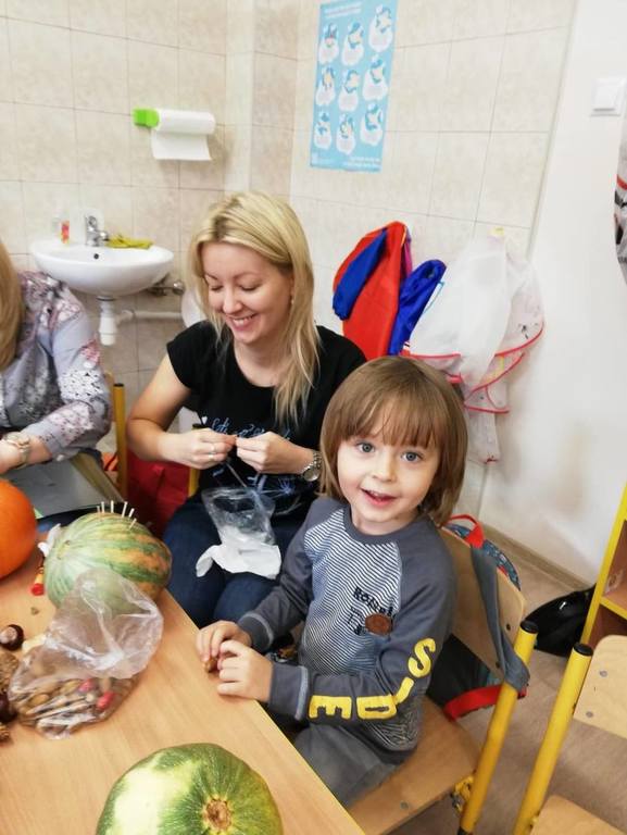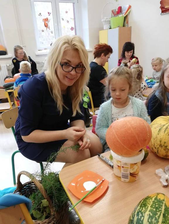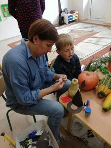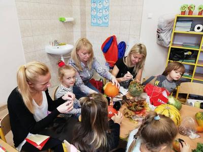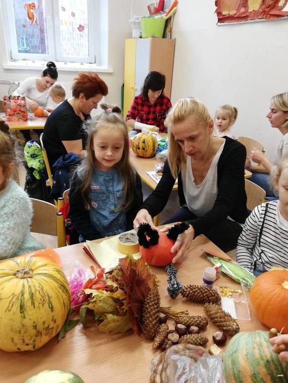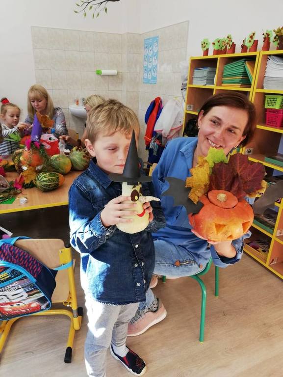 W dniu 11 października 2018 r. odbyły się w naszym przedszkolu dyniowe warsztaty z rodzicami. Zajęcia miały na celu ukazanie atrakcyjnych pomysłów na spędzanie czasu z dzieckiem. Dla maluchów były to bardzo ciekawe zajęcia. Wszyscy wykazali się dużą pomysłowością i inwencją twórczą a maluchy wprost prześcigiwały się w wymyślaniu coraz to nowych ,,cudaków - zwierzaków". Do tych prac wykorzystywano nie tylko dynię, ale także cukinię, kabaczki i inne dary jesieni jak szyszki, żołędzie, kasztany, których jest teraz pod dostatkiem. Powstawały bajkowe smoki, czarownice, śmieszne pajacyki i zwierzaki oraz wiele, wiele innych. Po skończonych zajęciach urządziliśmy wystawę prac i zrobiliśmy pamiątkowe zdjęcie. Był to mile i pożytecznie spędzony czas, a dzieci jeszcze długo opowiadały sobie wrażenia z wspólnej pracy ze swoimi rodzicami.