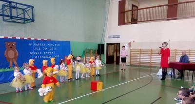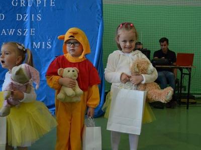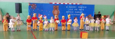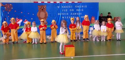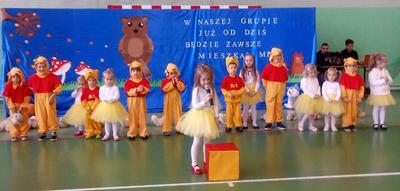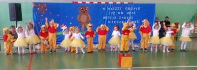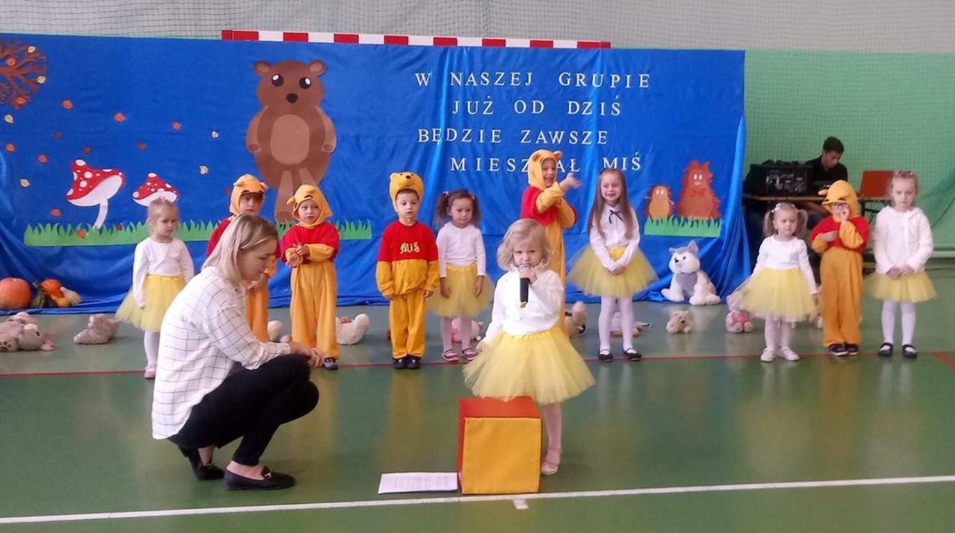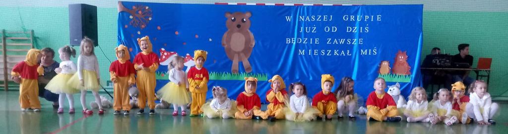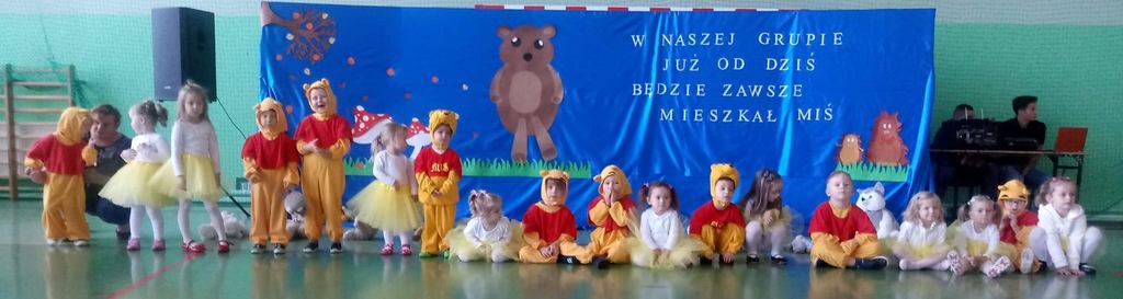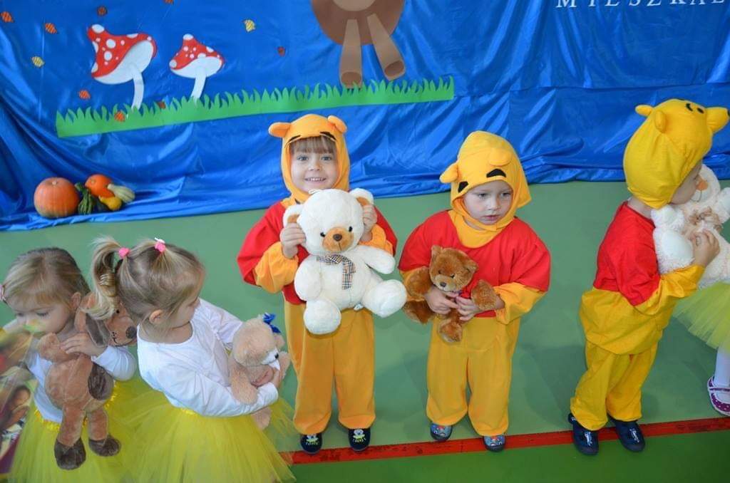 "W naszej grupie już od dziś będzie z nami mieszkał miś" - takie motto przyświecało przedstawieniu, jakie przygotowały maluchy z przedszkola. Odbyło się ono w dniu 7 listopada tego roku. Dzieci recytowały wierszyki o misiu, śpiewały piosenki, tańczyły. Wszystkie pięknie się zaprezentowały. Chłopcy byli przebrani w stroje misia Puchatka a dziewczynki wystąpiły w żółtych spódniczkach jako panie misiowe.