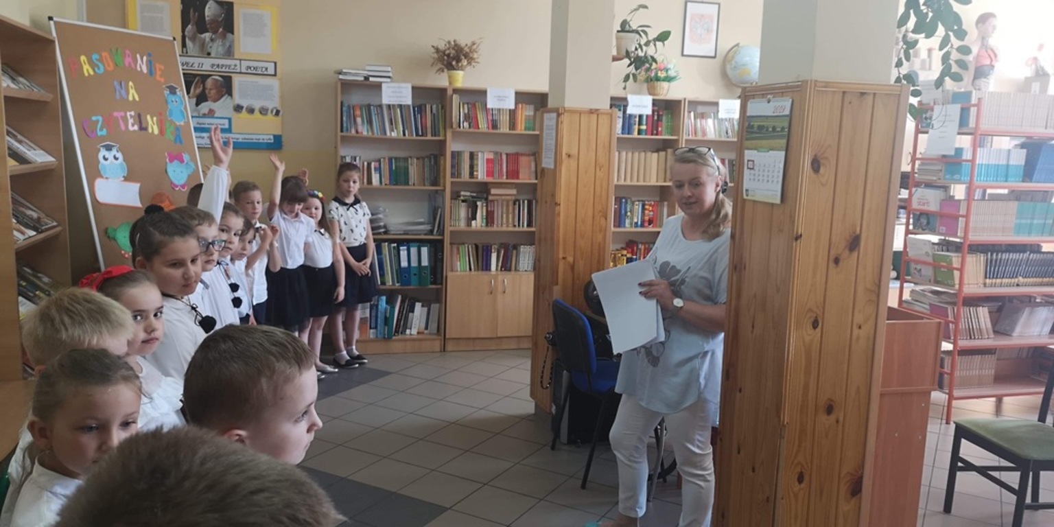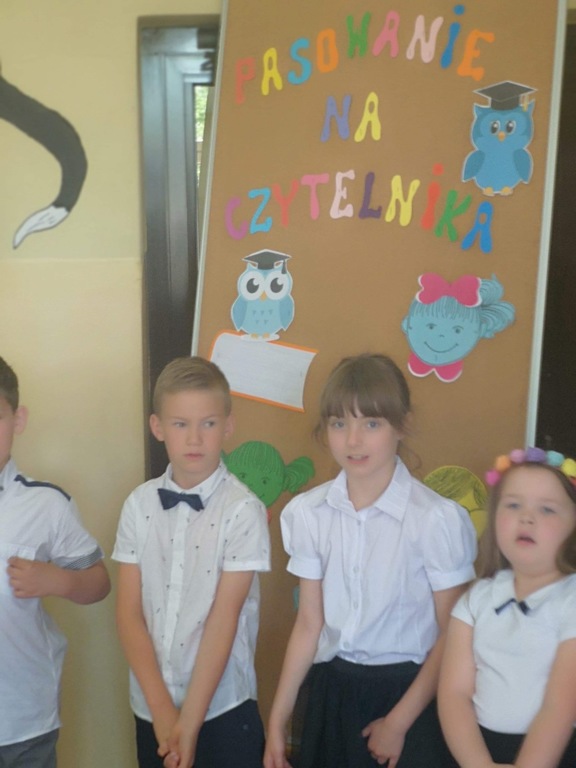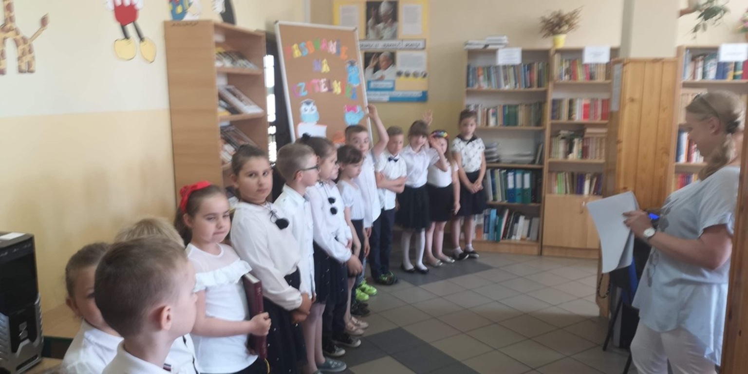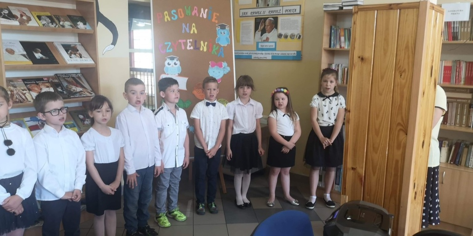 W poniedziałek 3 czerwca uczniowie klasy I naszej szkoły zostali uroczyście przyjęci w poczet czytelników biblioteki szkolnej. Uroczystość miała miejsce w bibliotece, gdzie po powitaniu przez panią bibliotekarkę i krótkiej pogawędce na temat miejsca jakim jest biblioteka dzieci zaprezentowały część artystyczną. Pięknie recytując wiersze i śpiewając piosenki o tym, dlaczego warto czytać i szanować książki udowodniły, że mogą zostać czytelnikami biblioteki. Przypieczętowaniem uroczystości było przyrzeczenie, że będą kochać i szanować książki. Następnie pani dyrektor Marta Plichta pasowała wszystkich pierwszaków na czytelników . Na pamiątkę tego wydarzenia każde dziecko otrzymało pamiątkowy dyplom i drobny upominek od rodziców. Mamy nadzieję, że od tej pory nowi czytelnicy będą często odwiedzali bibliotekę i rozbudzali w sobie potrzebę czytania książek.