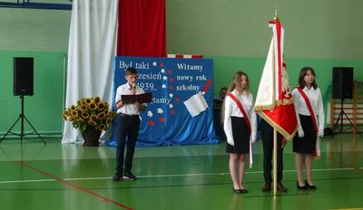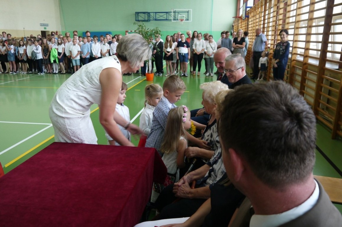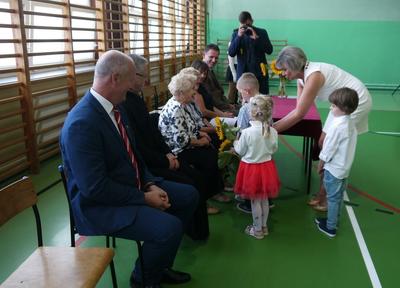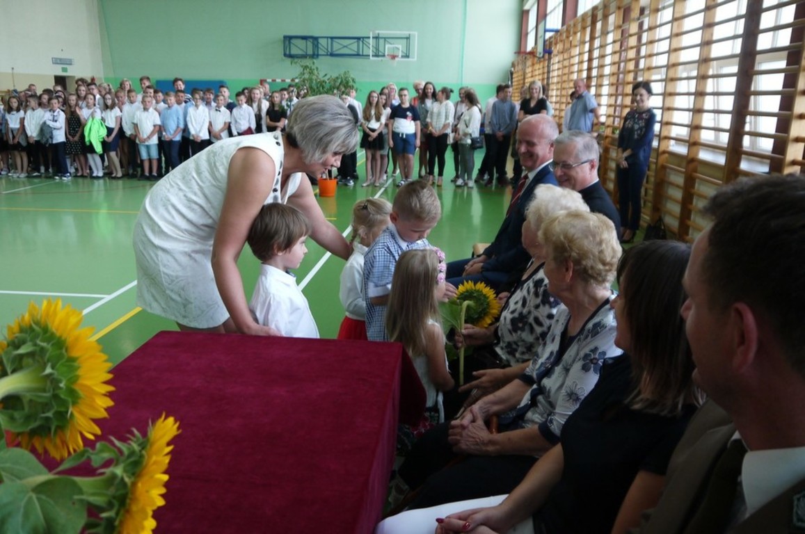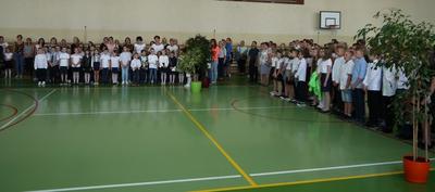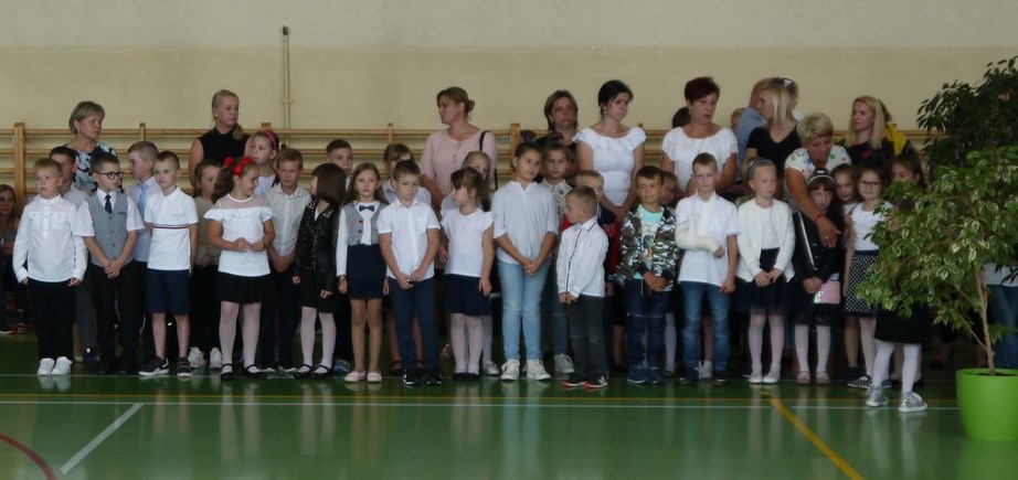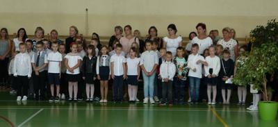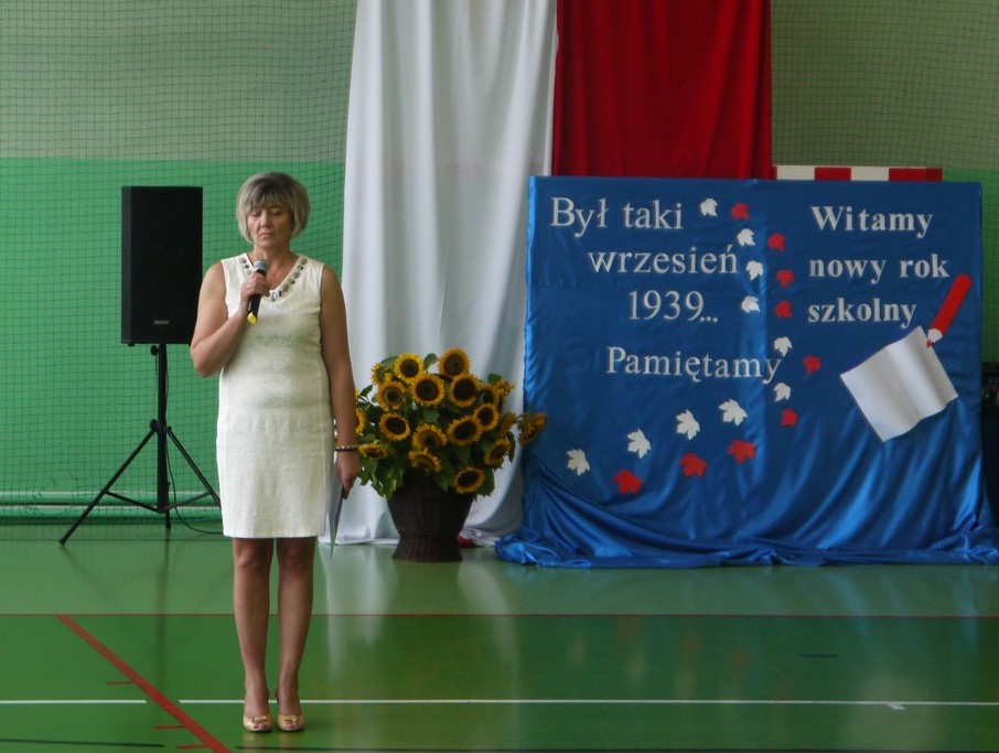 Następnie wszyscy przeszliśmy do szkoły, gdzie w sali gimnastycznej odbyła się część oficjalna. Po wprowadzeniu sztandaru oraz odśpiewaniu hymnu szkoły głos zabrała Pani Dyrektor Marta Plichta, która serdecznie powitała wszystkich uczniów, rodziców, nauczycieli oraz gości.