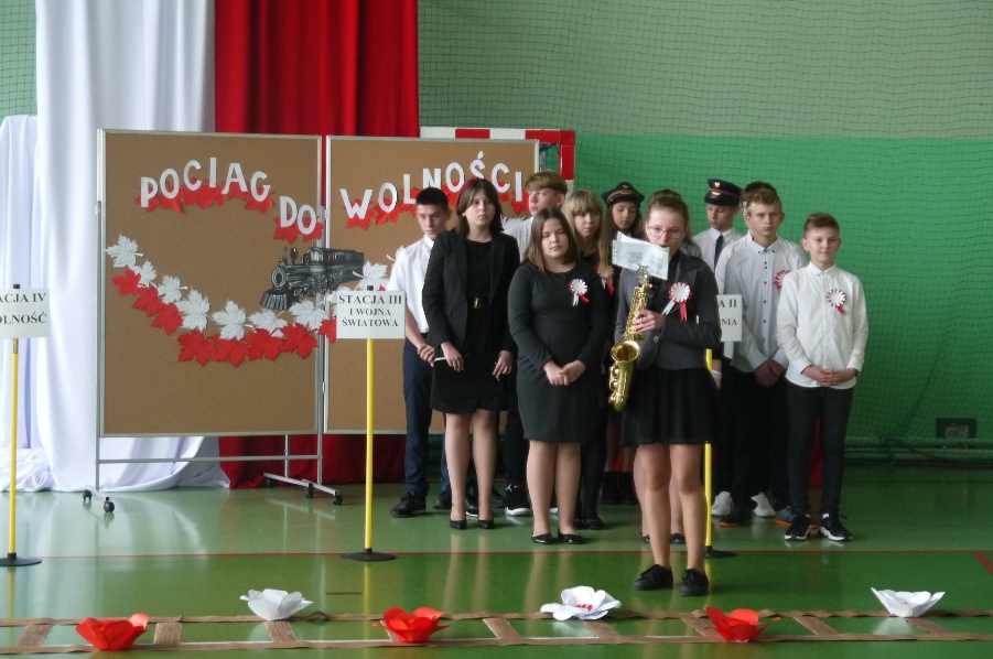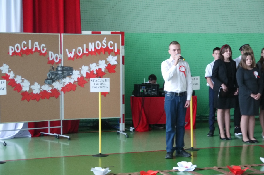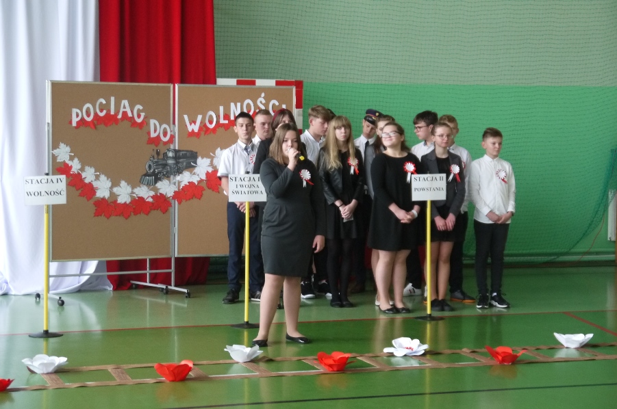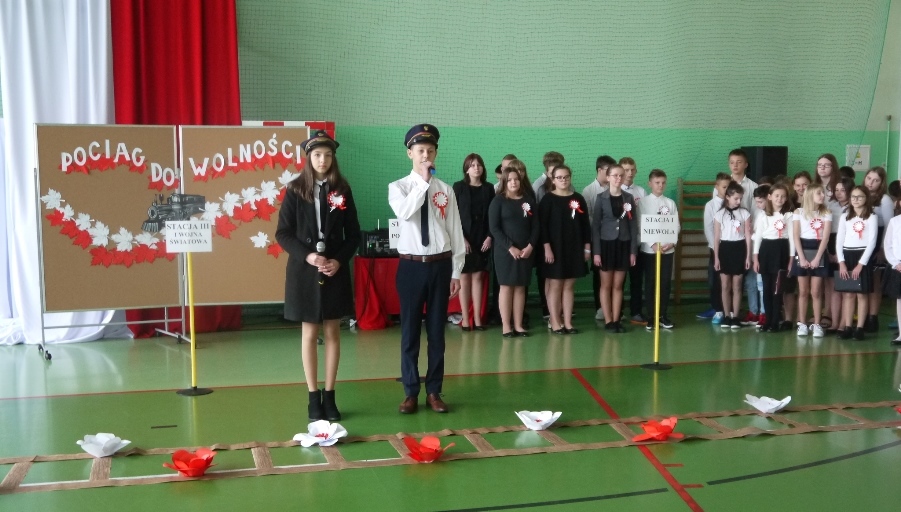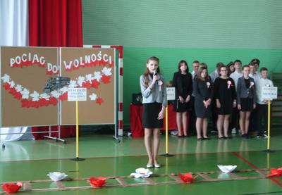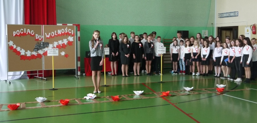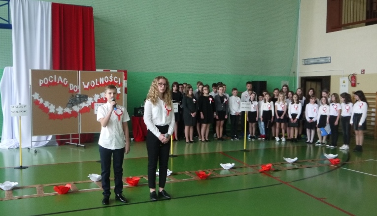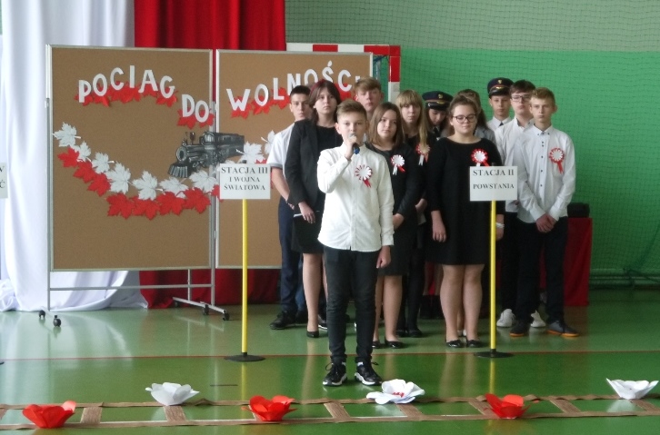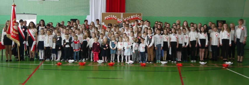 8 listopada społeczność naszej szkoły wzięła udział w uroczystej akademii z okazji 101. rocznicy odzyskania prze Polskę niepodległości. Uczniowie z klasy VIII B w przedstawieniu pt. „Pociąg do wolności” zobrazowali, jak Polacy dążyli do odzyskania suwerenności. Część artystyczna wprowadziła zgromadzonych w atmosferę wydarzeń poprzedzających datę 11 listopada 1918 roku. Recytowane wiersze patriotyczne pozwoliły zrozumieć rozterki i uczucia walczących o wolność. Pieśni patriotyczne ukazały ducha narodu polskiego, który w czasie 123 lat niewoli stale wychodził z inicjatywą walki o Ojczyznę.