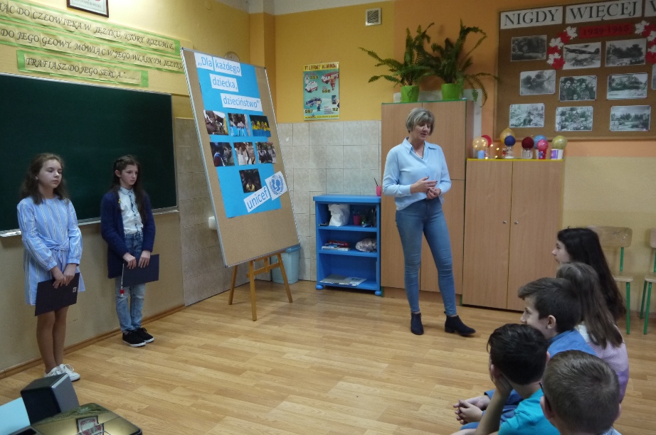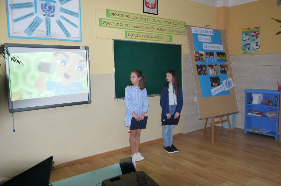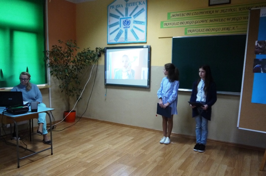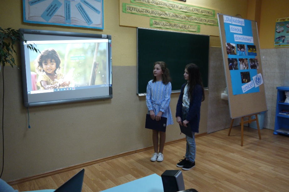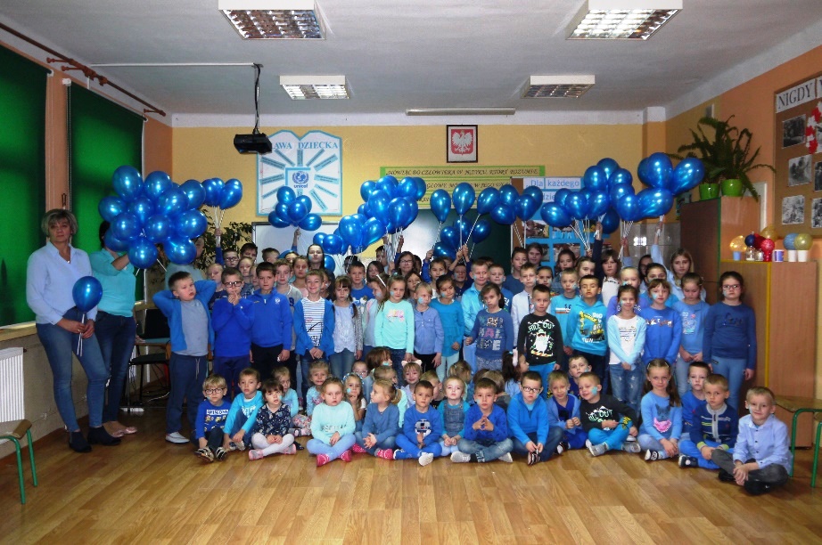 Także nasza szkoła przyłączyła się do obchodów tego wyjątkowego dnia. Uczniowie mieli możliwość obejrzenia prezentacji multimedialnej oraz krótkich filmów mówiących o prawach dziecka i tym jak są one realizowane na świecie. W ramach solidarności z organizacją broniącą praw dziecka - Unicef oraz dziećmi z całego świata uczniowie oraz nauczyciele przyszli dziś do szkoły ubrani na niebiesko.