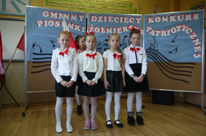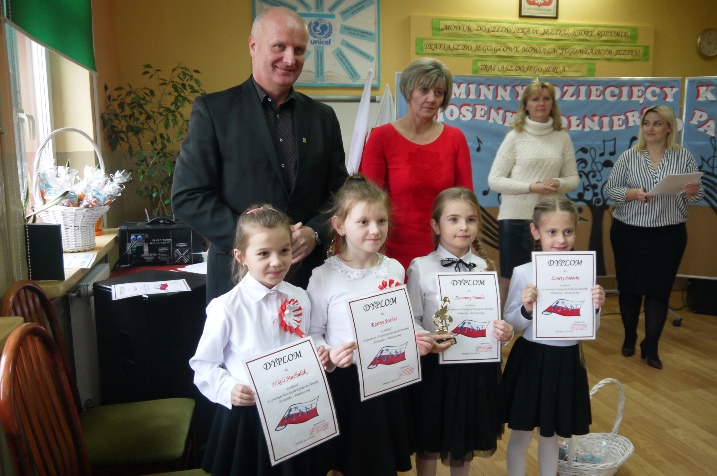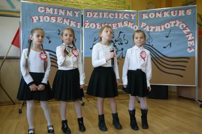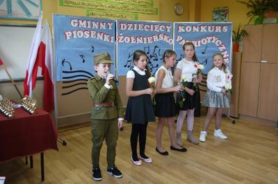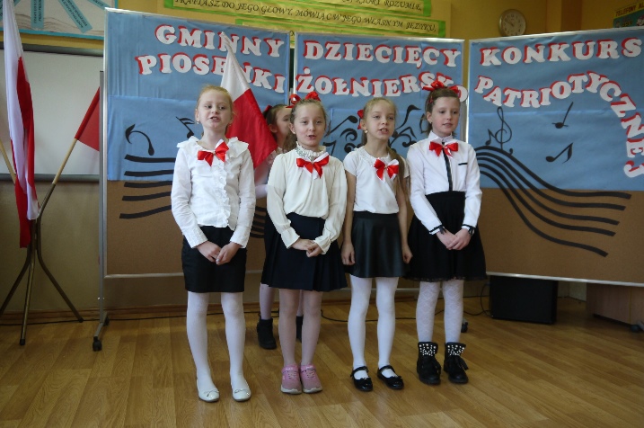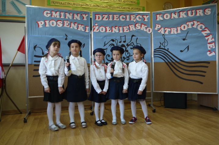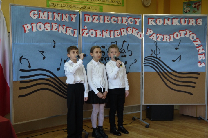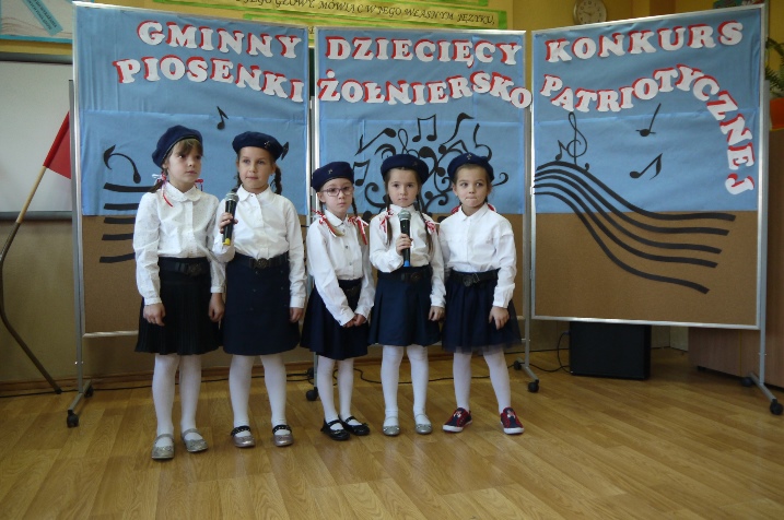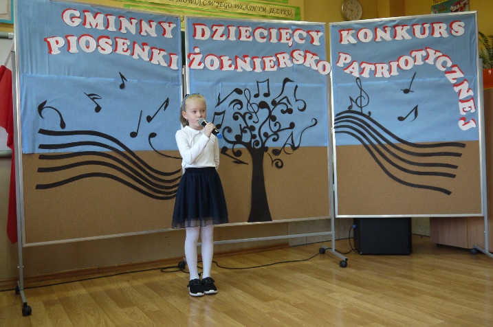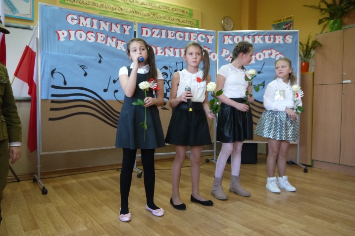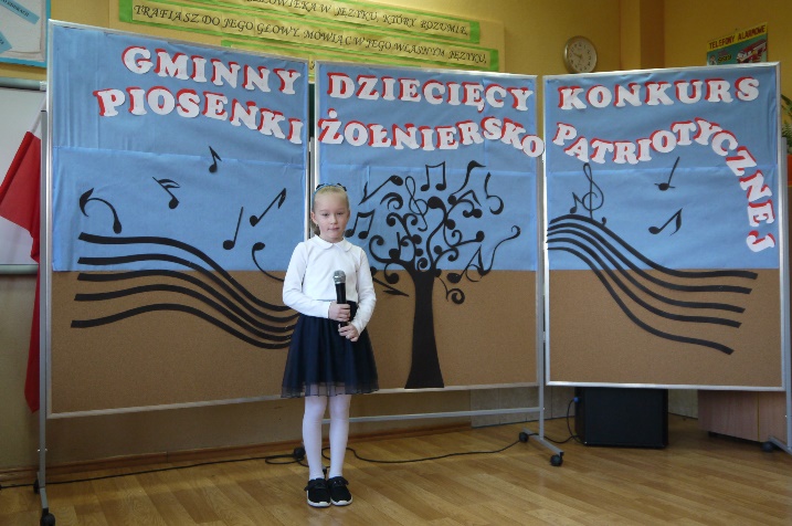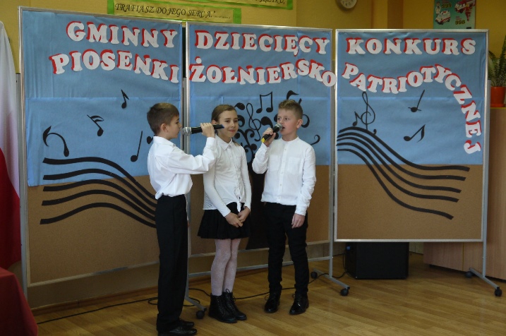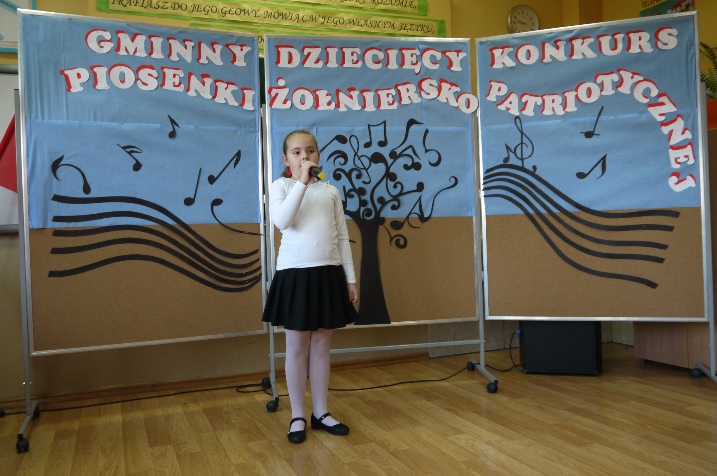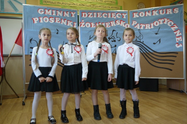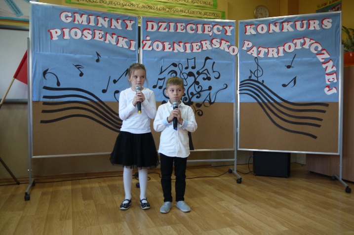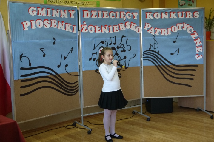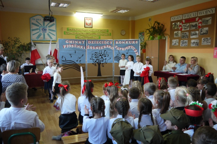 28 listopada odbył się w naszej szkole Gminny Dziecięcy Konkurs Piosenki Żołniersko-Patriotycznej w którym mogliśmy usłyszeć piękne utwory patriotyczne oraz żołnierskie w wykonaniu dzieci ze szkół naszej gminy. Wszyscy mali wykonawcy zaprezentowali się z jak najlepszej strony. Najwyższe miejsce na podium w poszczególnych kategoriach wiekowych zajęli: