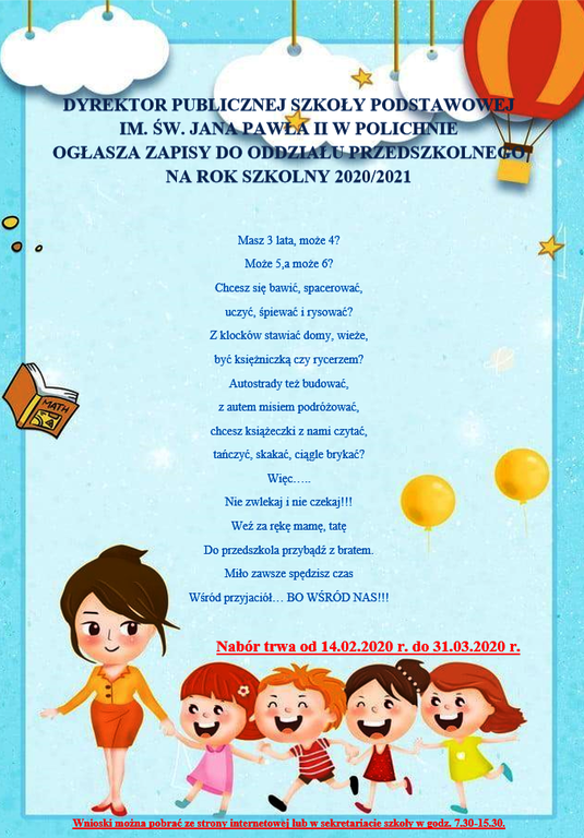 Dyrektor Publicznej Szkoły Podstawowej im. św. Jana Pawła II ogłasza zapisy