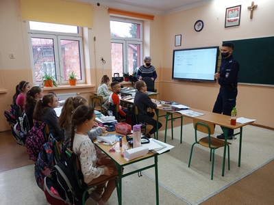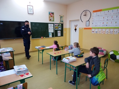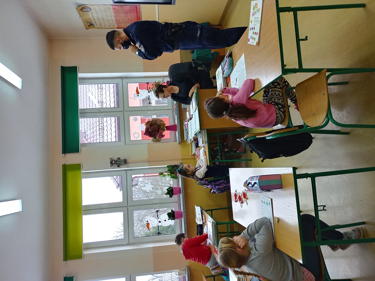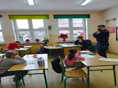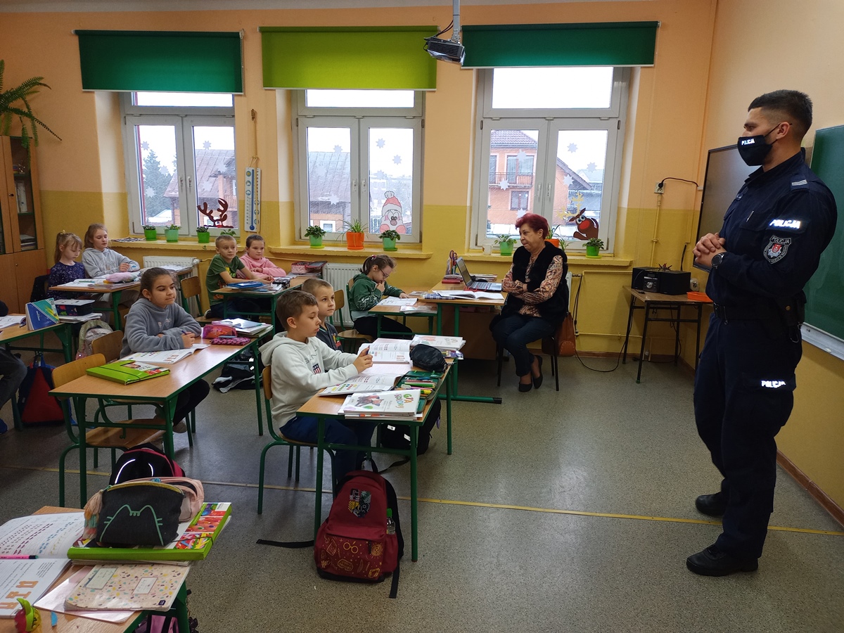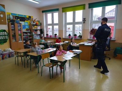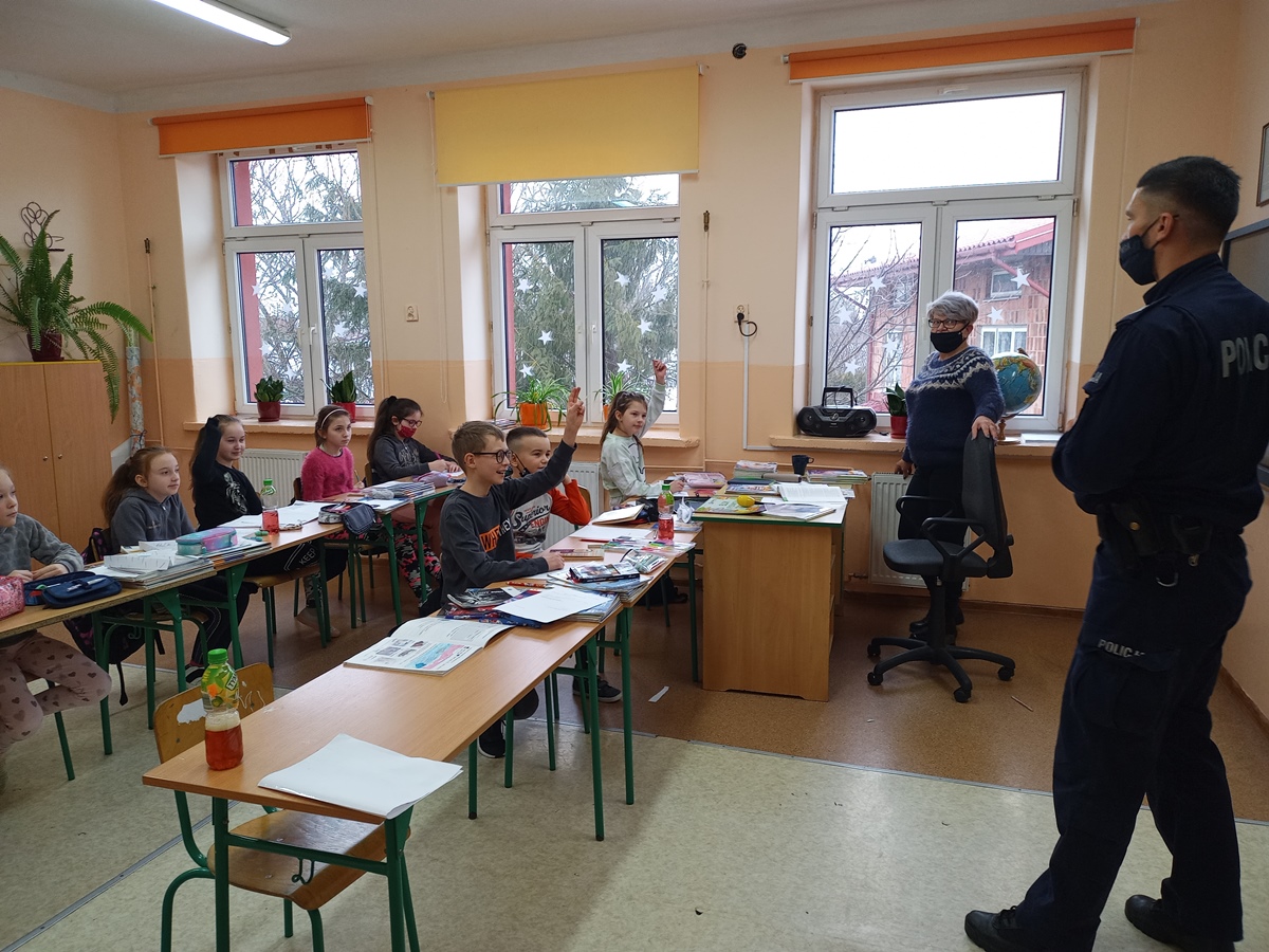 Zimowe ferie zbliżają się do nas wielkimi krokami. Będzie to czas odpoczynku od zajęć szkolnych, beztroskich zabaw na śniegu, szalonych zjazdów na sankach. Jednak nie będzie to czas wolny od troski o własne bezpieczeństwo. Aby te ferie upłynęły nam bezpiecznie w naszej szkole odbyło się spotkanie z Panem dzielnicowym sierż. sztab. Sebastianem Janickim. Miało ono na celu uświadomienie uczniom zasad bezpieczeństwa podczas ferii. Przedstawione rady i przestrogi pozwoliły uzmysłowić dzieciom konsekwencje nierozważnych zachowań. Należy pamiętać, że korzystając z przyjemności zabawy, nie można zapominać o bezpieczeństwie. Policjant przestrzegał przed ślizganiem się na skutych lodem rzekach i stawach oraz ostrzegał przed zjeżdżaniem z górek znajdujących się blisko ulic i rzek. Udzielił wskazówek jak bezpiecznie bawić się na śniegu i jak zachowywać się na kuligu. Na zakończenie spotkania przeprowadzono dyskusją z uczniami. Wszystkim uczniom życzymy, aby ferie zimowe upłynęły wesoło, zdrowo i bezpiecznie.