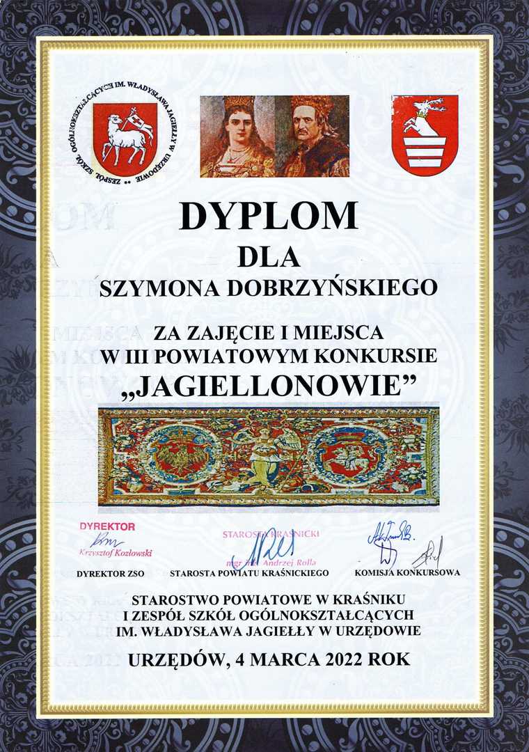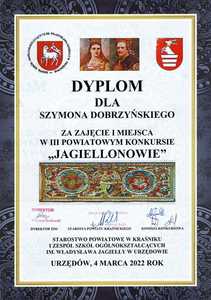 Uczeń klasy 8 – Szymon Dobrzyński zajął I miejsce w III Powiatowym Konkursie Historycznym „Jagiellonowie”, zorganizowanym w Zespole Szkół Ogólnokształcących im. Władysława Jagiełły w Urzędowie.